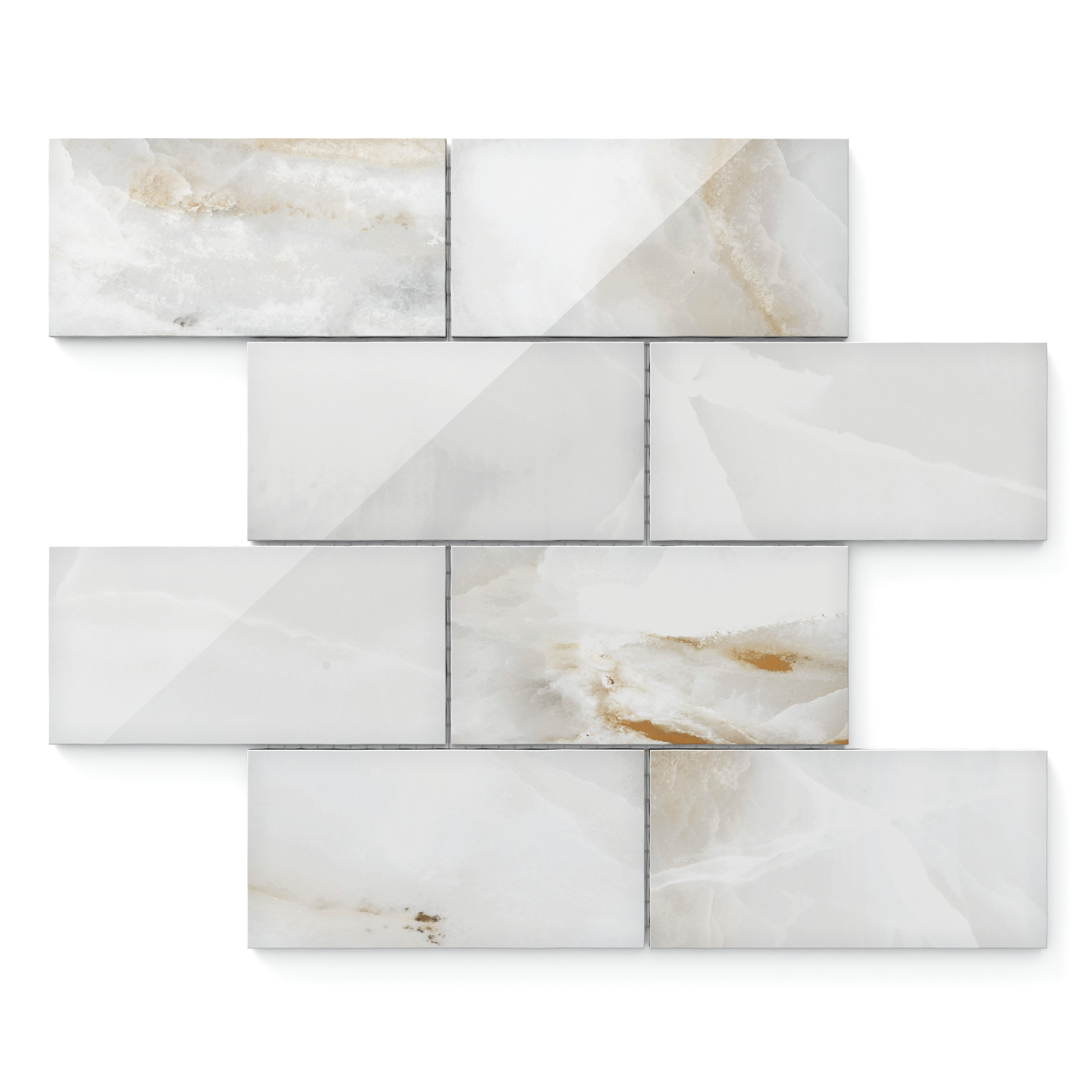 Prized for its ethereal beauty since Egypt’s second dynasty, onyx finds new life in our Astrid 3x6 Polished Porcelain Mosaic Tile in Pearl—a modern expression of this revered gemstone. Each subway-like piece, mesh-mounted in a staggered layout, showcases delicate bands of gold and light gray veining flowing across an almost translucent white base, accentuated by a radiant finish that exudes modern glamour and elevates any interior.