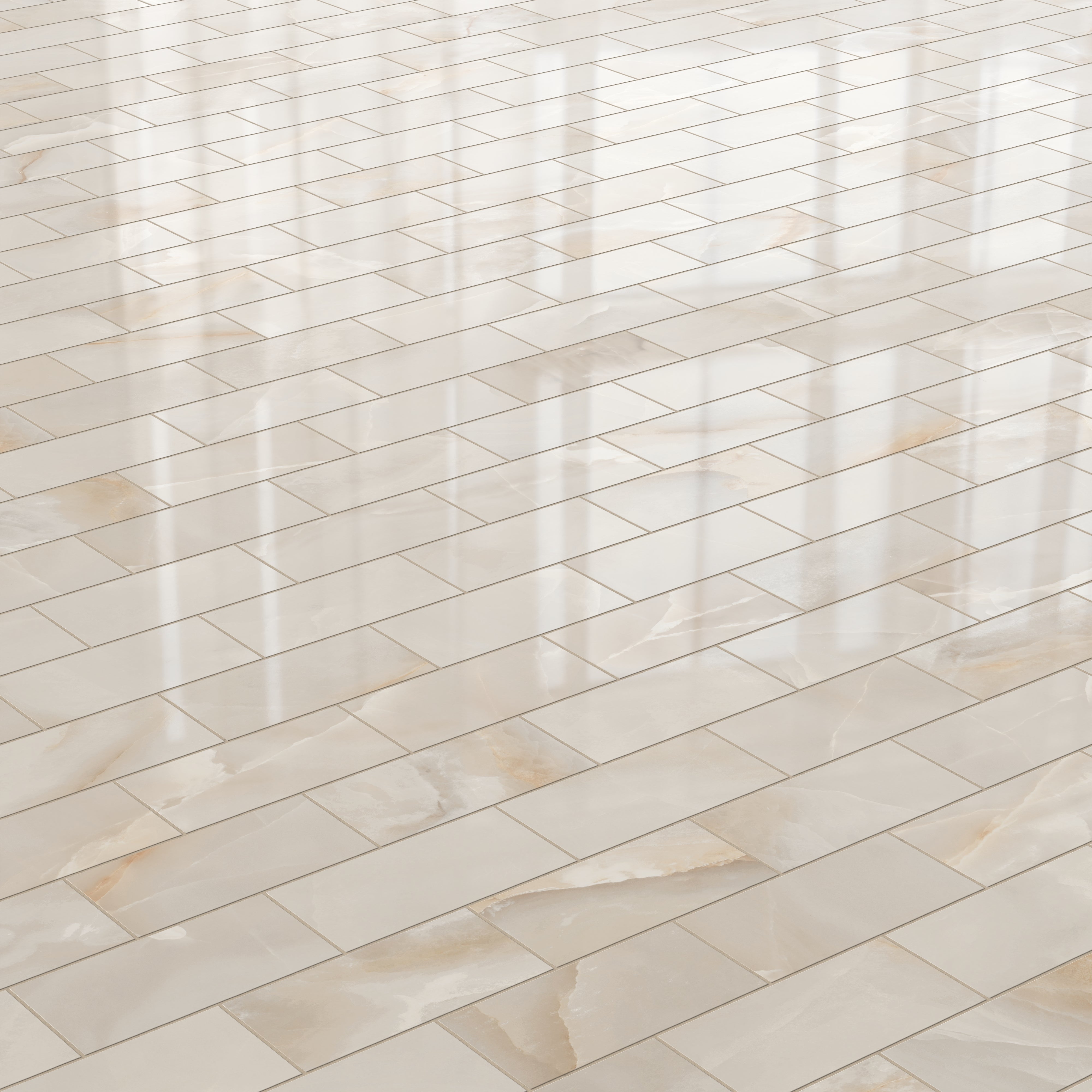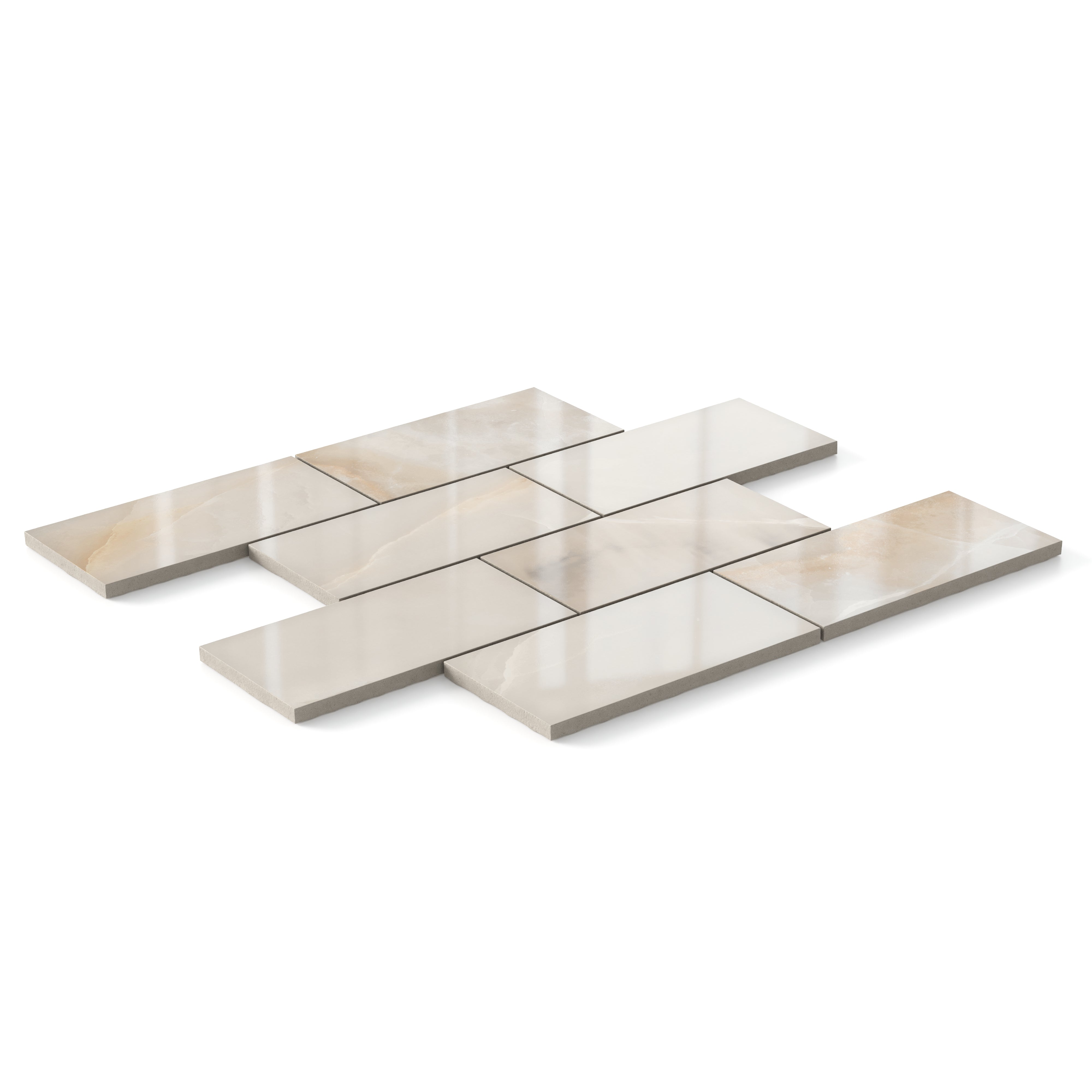 Prized for its ethereal beauty since Egypt’s second dynasty, onyx finds new life in our Astrid 3x6 Polished Porcelain Mosaic Tile in Sand—a modern expression of this revered gemstone. Each subway-like piece, mesh-mounted in a staggered layout, showcases delicate bands of gold and light gray veining flowing across an almost translucent beige base, accentuated by a radiant finish that exudes modern glamour and elevates any interior.