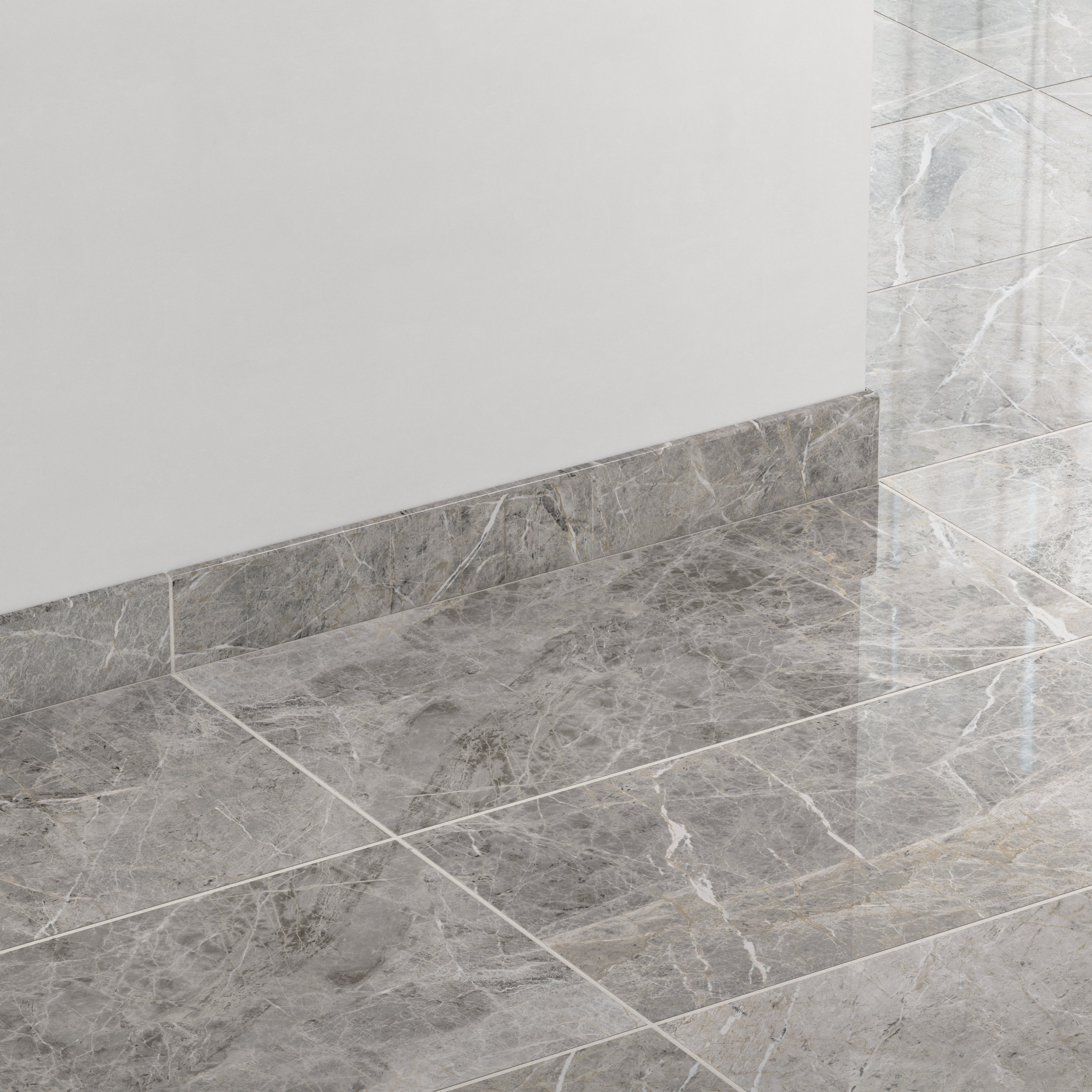 Featuring the same natural marble aesthetic, our Chantel 3x24 Polished Porcelain Bullnose Tile in Imperial provides a seamless finishing detail for edges, corners, and wall terminations with its striking veining across its rich mid-gray surface, accentuated by a sleek finish for a smooth, elegant transition.