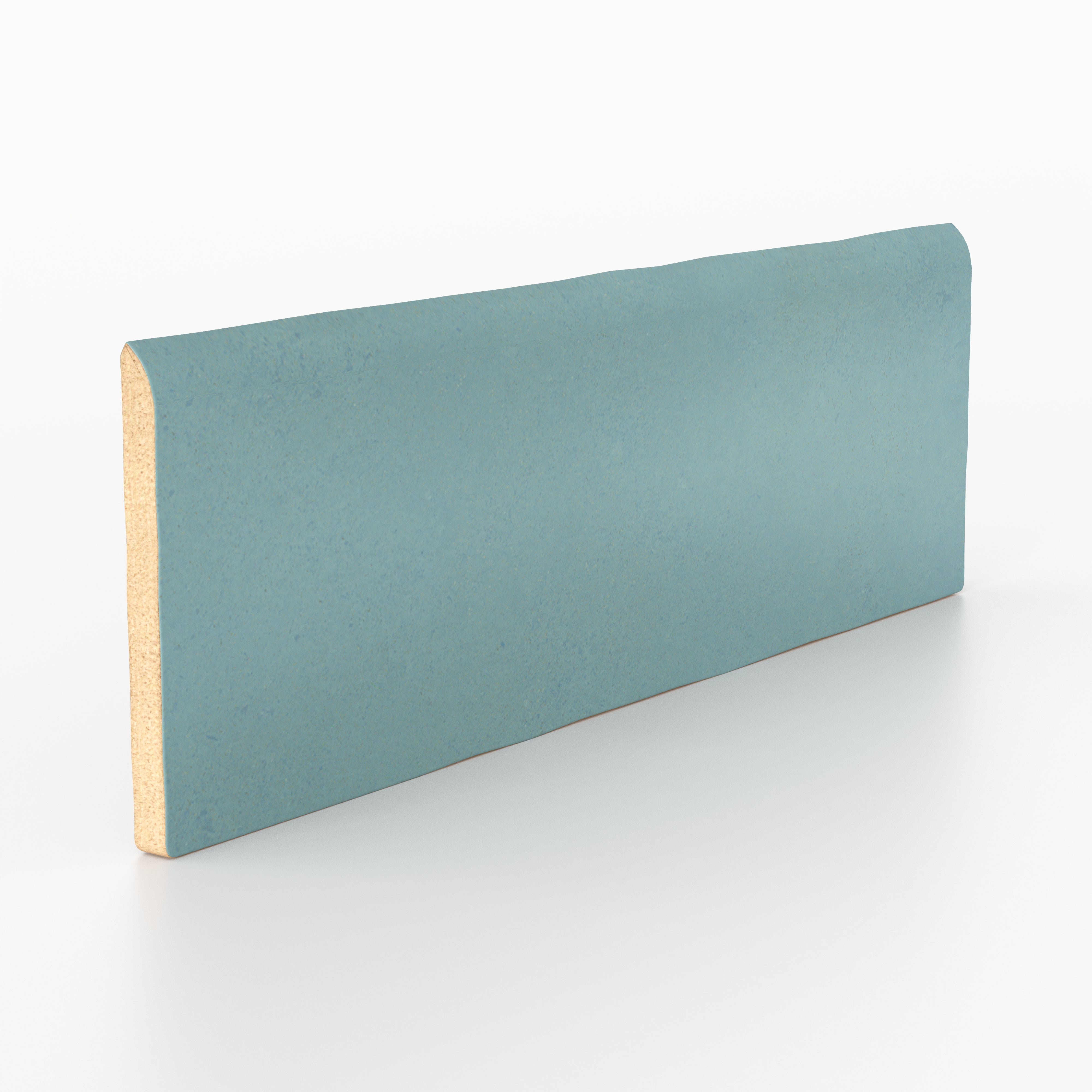 Our Ellie 2.5x8 Matte Ceramic Bullnose Tile in Lake builds on the handcrafted look of its field tiles with the same earthy, layered look and subtly varied, greenish blue shade. Its slim rectangular format is designed to neatly finish edges, corners, and tub surrounds with a compact size that complements modern, space-conscious interiors.