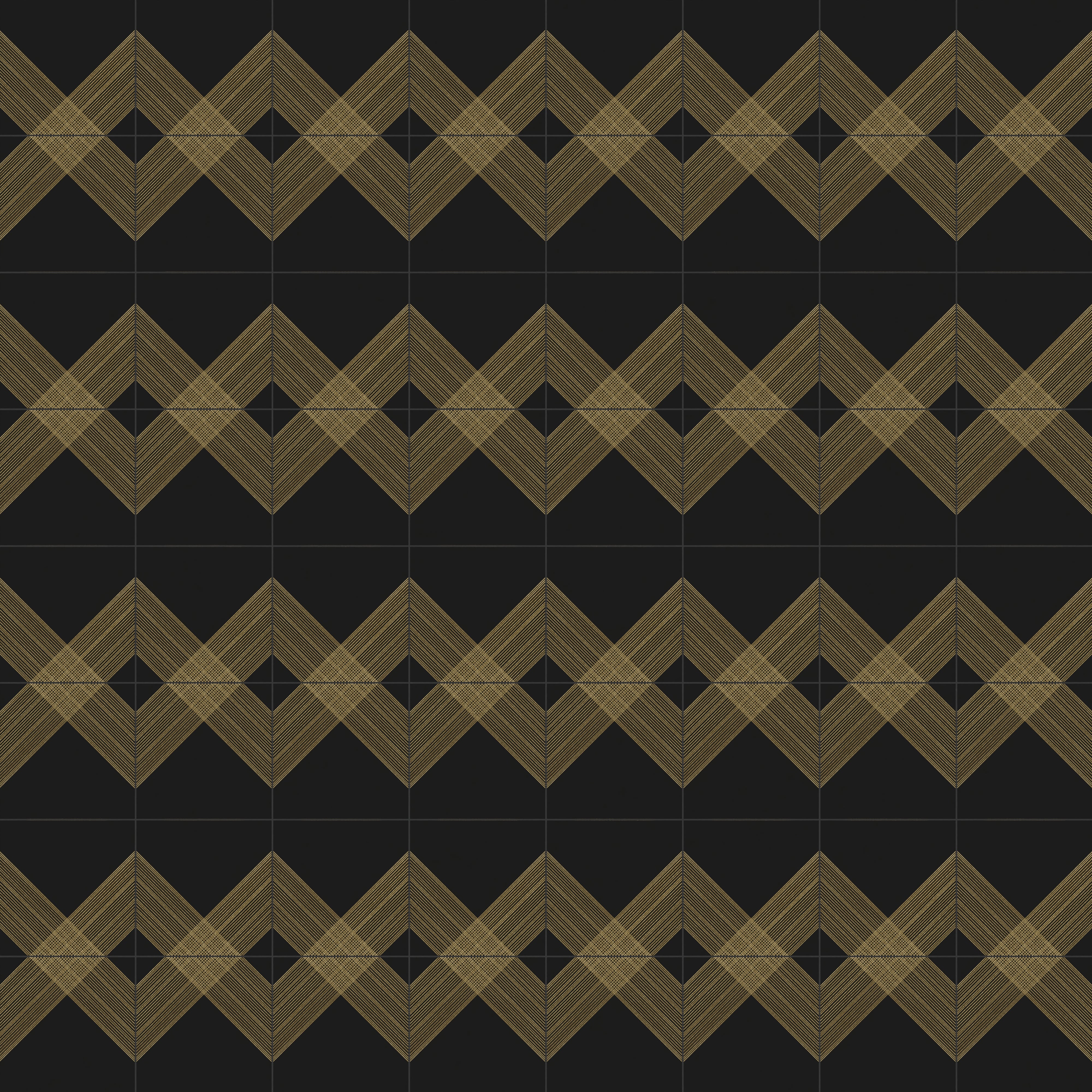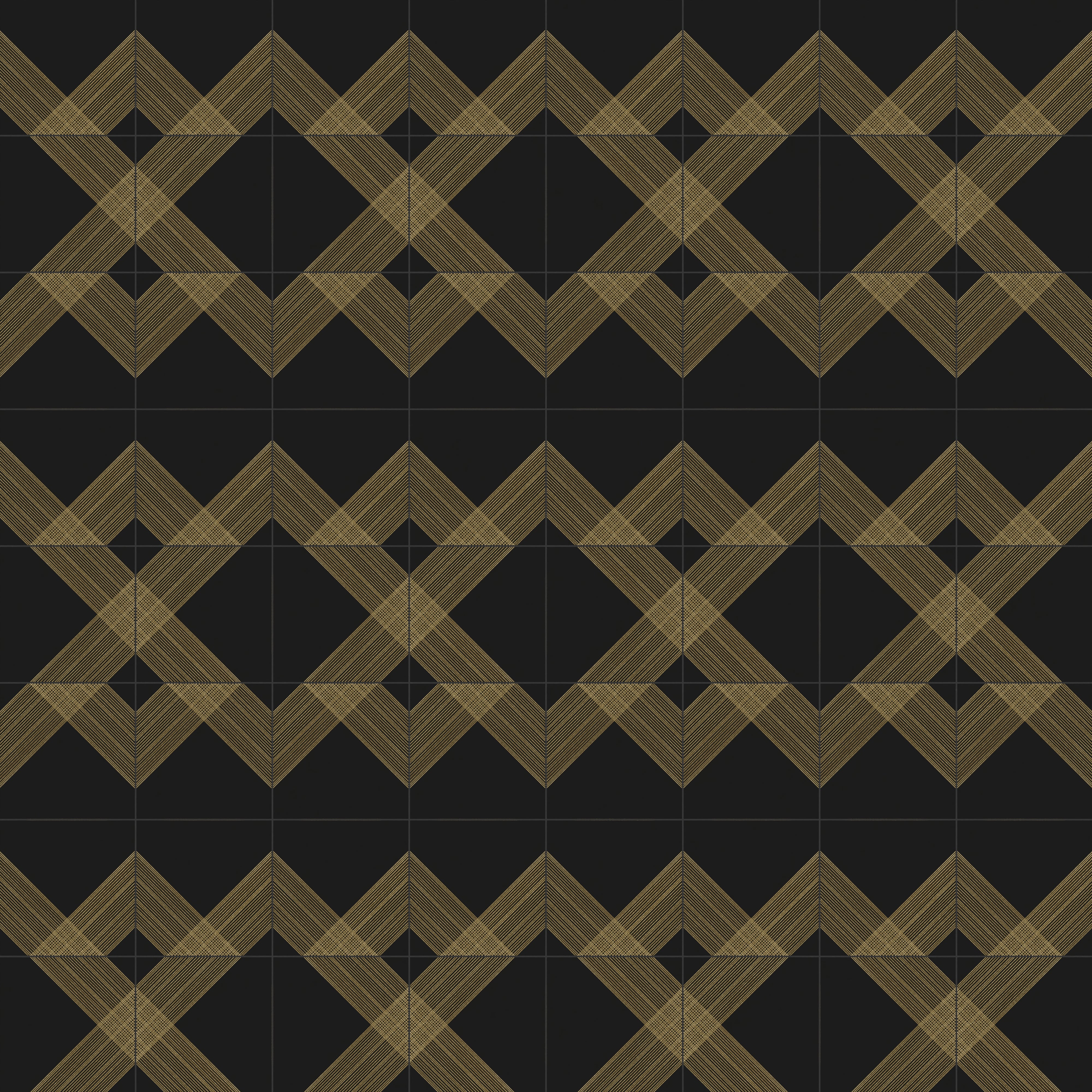 Our Estelle 12x12 Satin Ceramic Tile in Deco 2 Black Gold dazzles with a patterned design across its black surface, featuring twin diagonal bands of gold lines that extend from opposing sides and intersect at the center. These transform into an expansive plaid-inspired motif when laid side by side, elevated by a velvety finish that contrasts beautifully against the subtle shimmer of its metallic accents.
