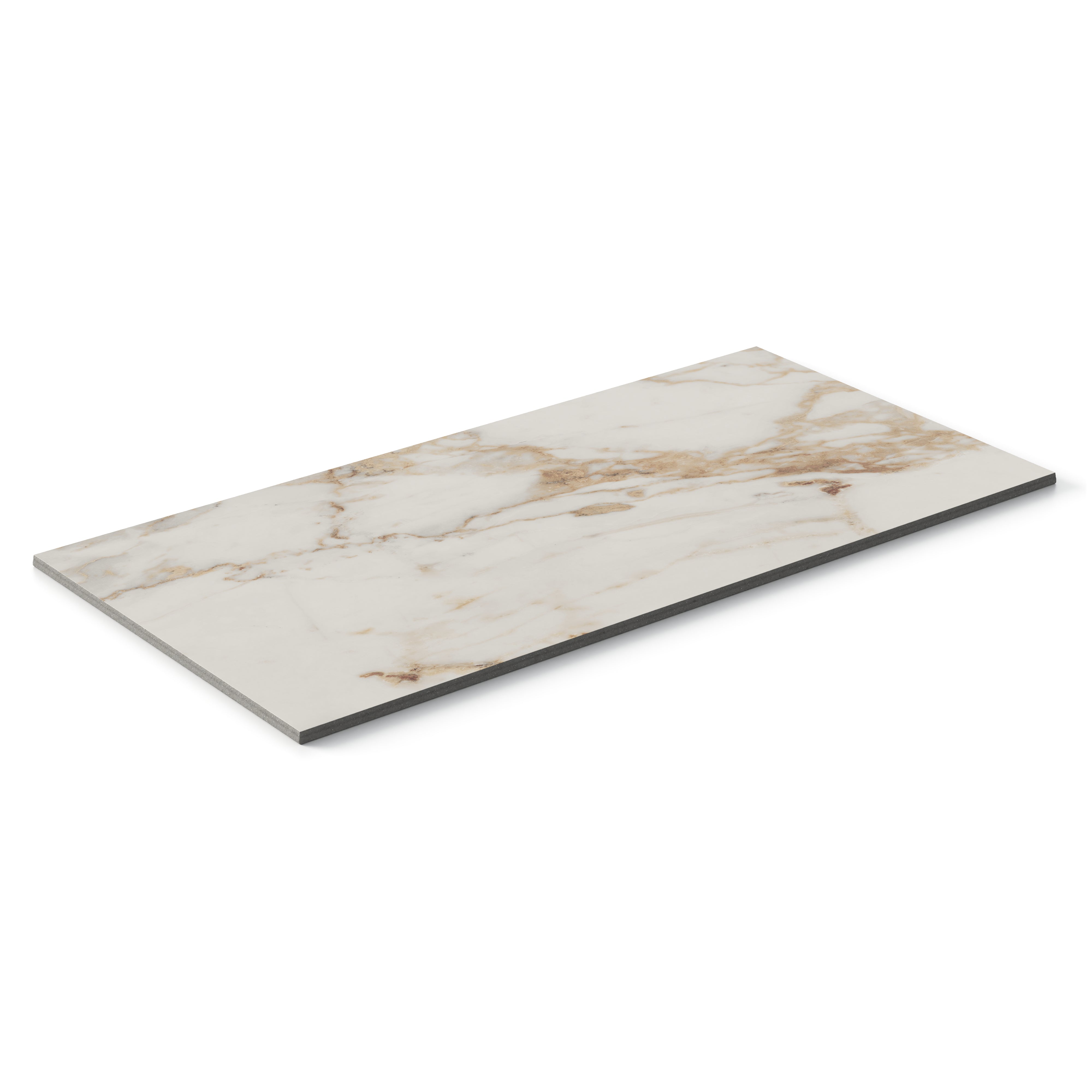 Our Giada 12x24 Matte Porcelain Tile in Calacatta Gold reimagines the prized Calacatta marble—long celebrated by artists and architects for its striking balance of purity and depth—into a surface designed for modern life. Each piece carries the essence of the Italian original, where a soft beige body is laced with an almost painterly, organic veining in shades of gray and brown.