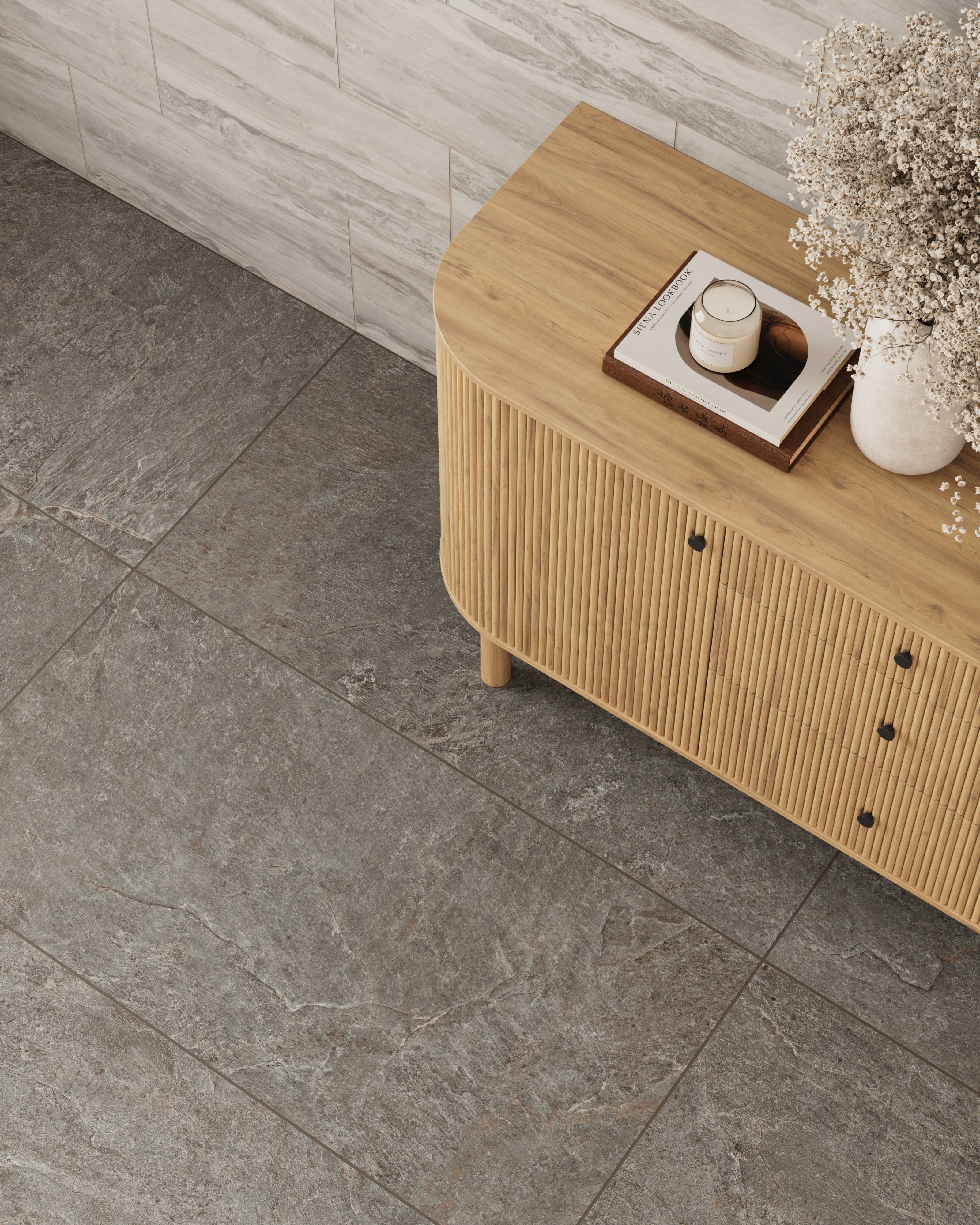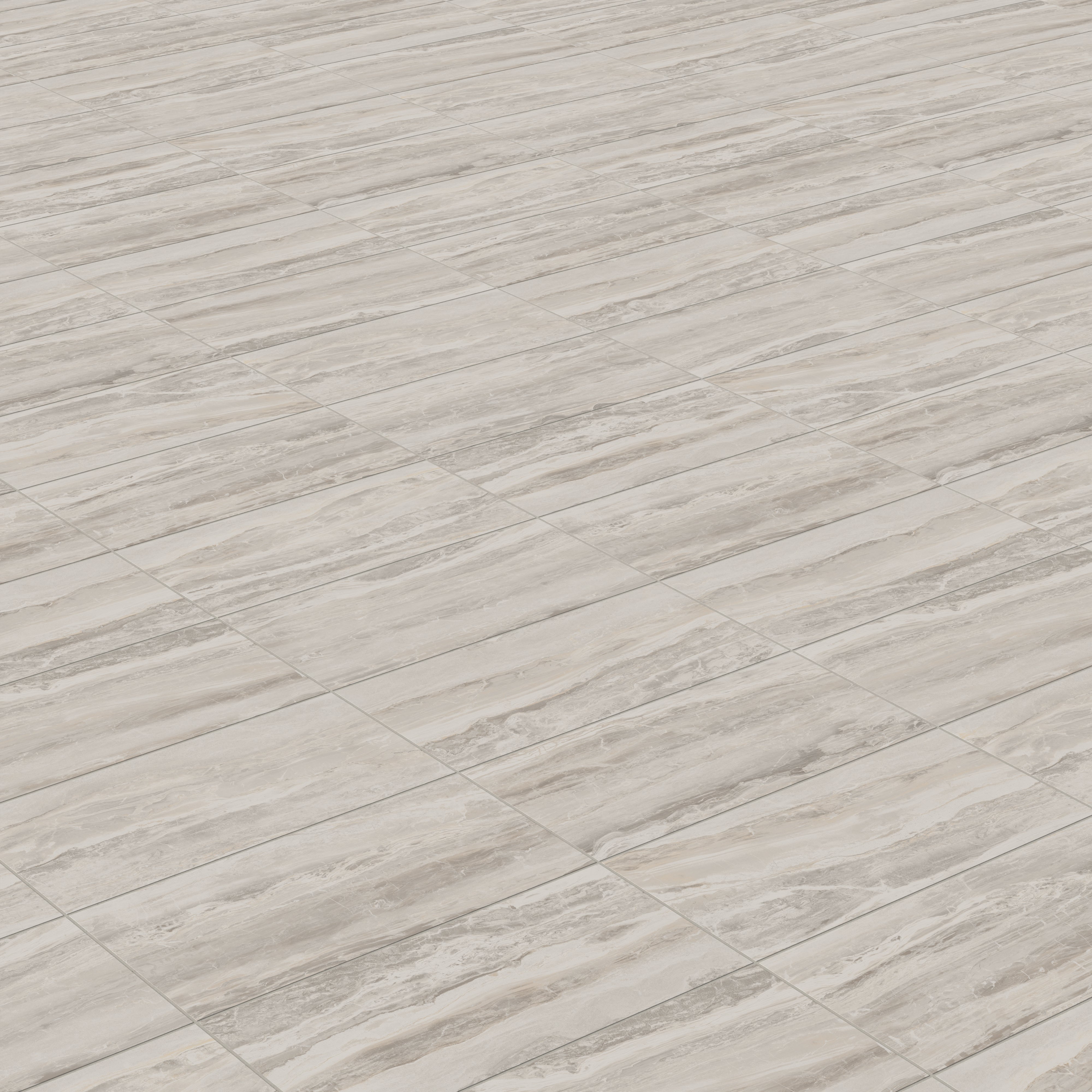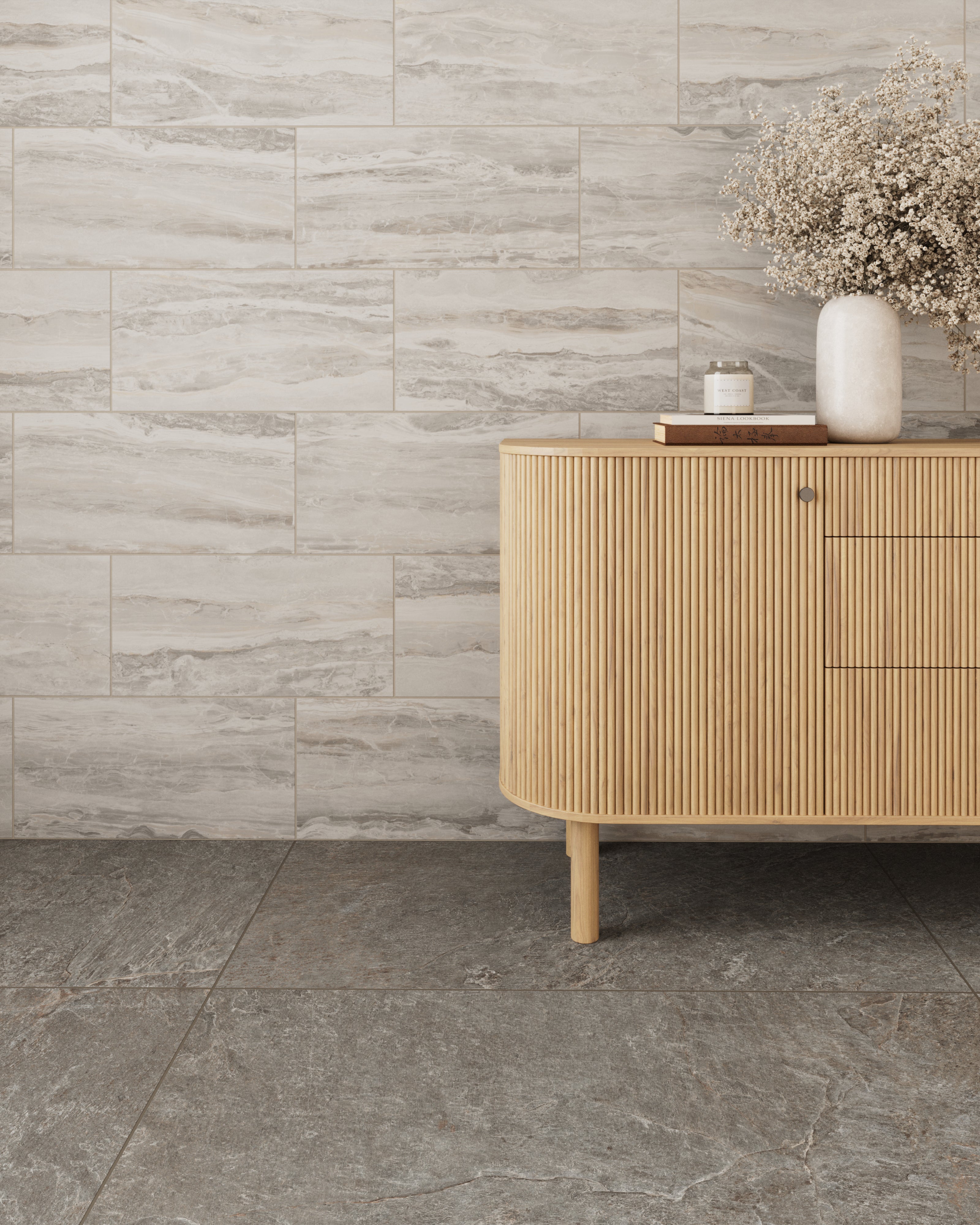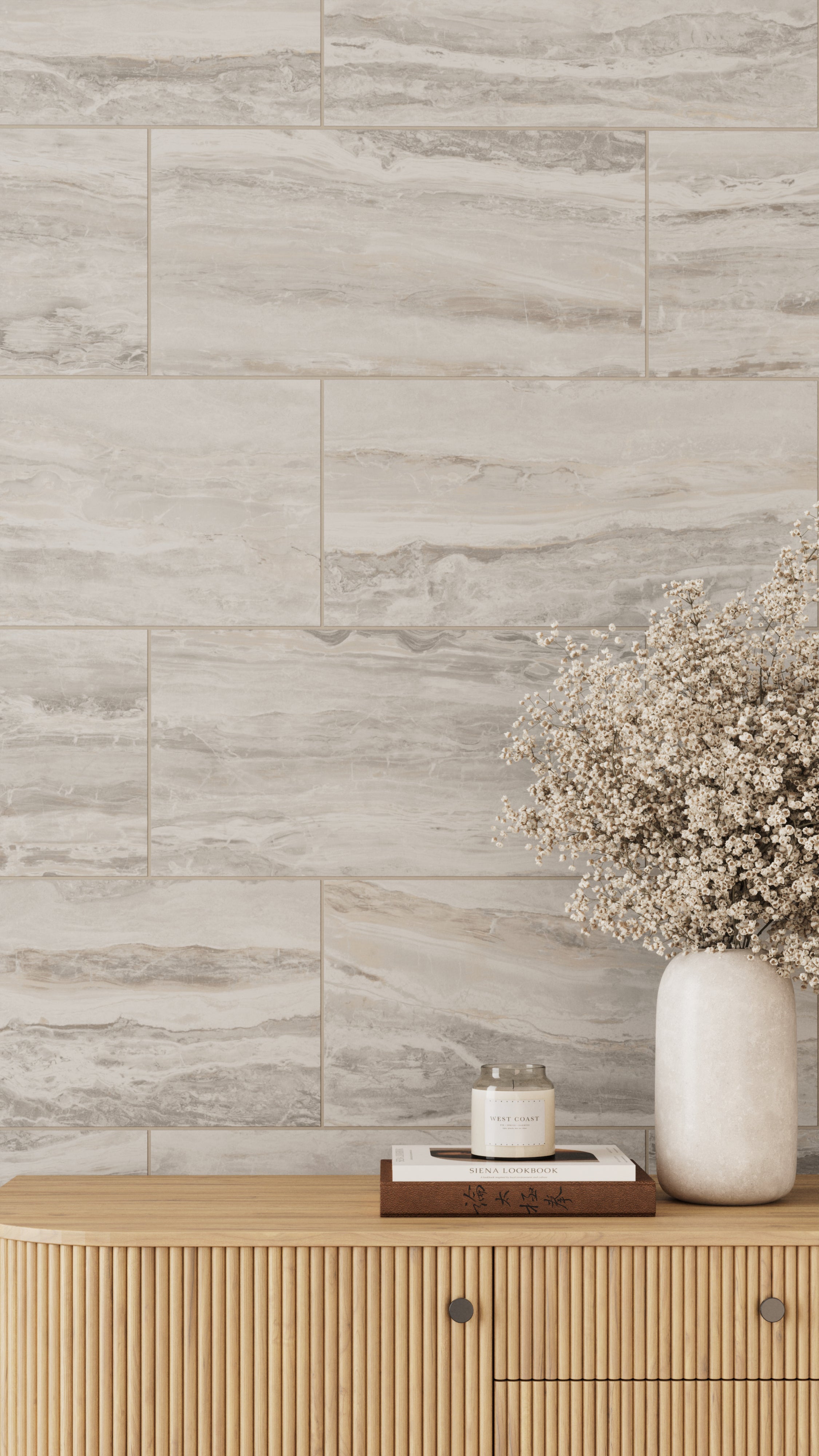 Our Harley 12x24 Matte Porcelain Tile in Greige translates the beauty of natural fragmentation into a classic rectangular format, where layered, grayish beige hues and fluid, interlocking veining dynamically meld — a visual metaphor for the earth’s process of breaking and reassembling form. Its subtly textured finish softens this organic complexity, gently diffusing light, creating a calm, refined surface that allows spaces to relive marble’s timeless elegance.