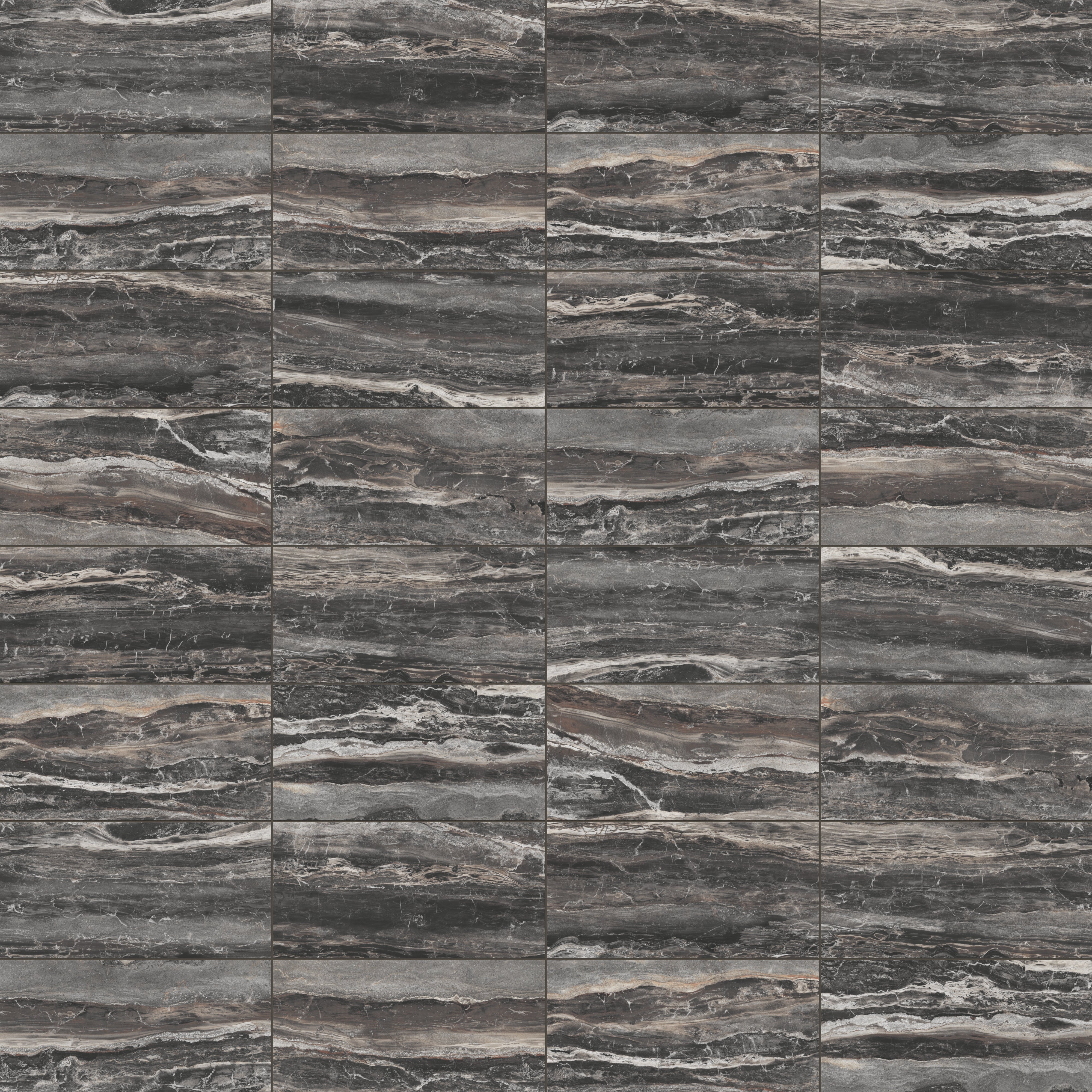 Our Harley 12x24 Polished Porcelain Tile in Graphite translates the beauty of natural fragmentation into a classic rectangular format, where layered, dark gray hues with brown undertones and fluid, interlocking veining dynamically meld — a visual metaphor for the earth’s process of breaking and reassembling form. Its reflective finish accentuates this organic complexity, creating a luminous, refined surface that allows spaces to relive marble’s timeless elegance.