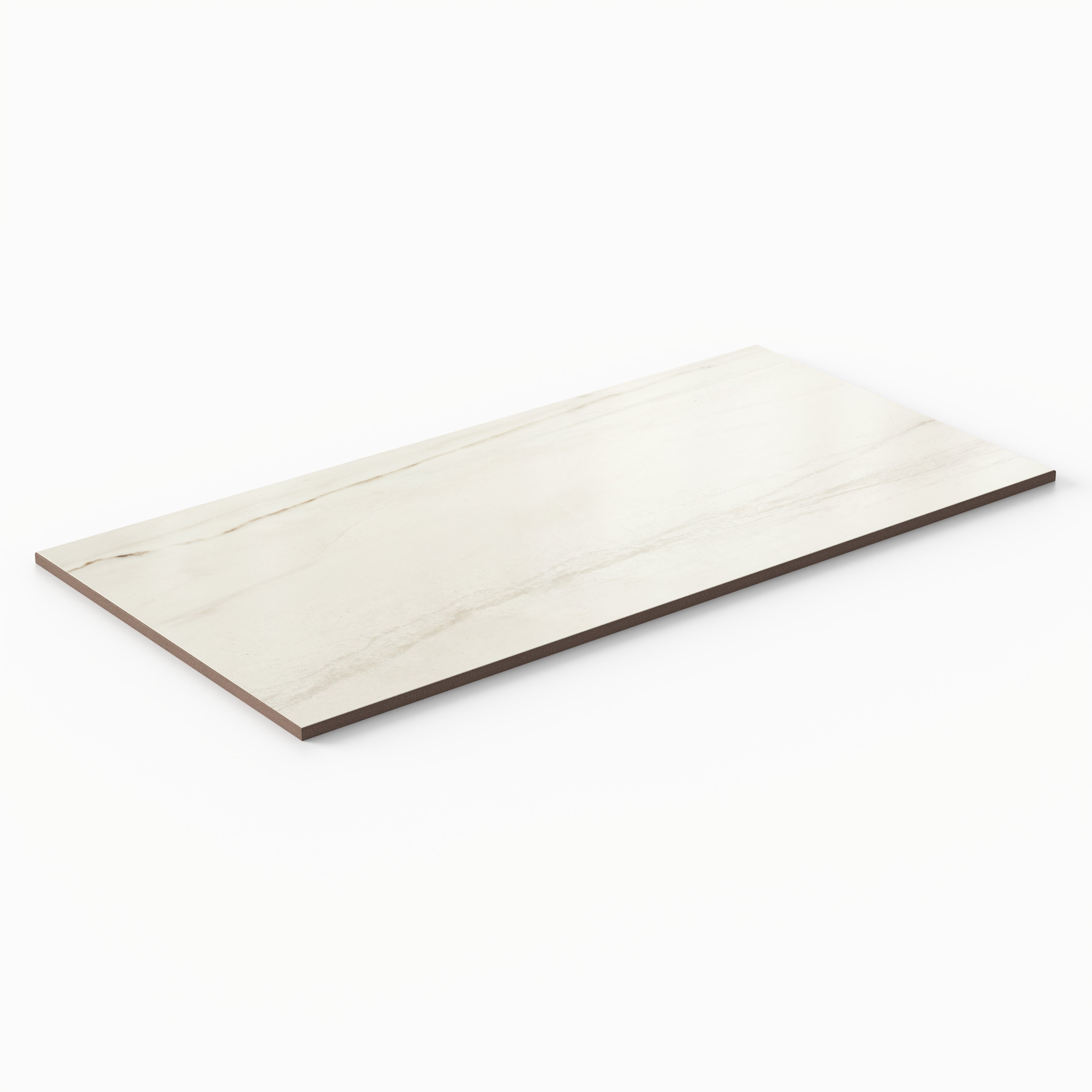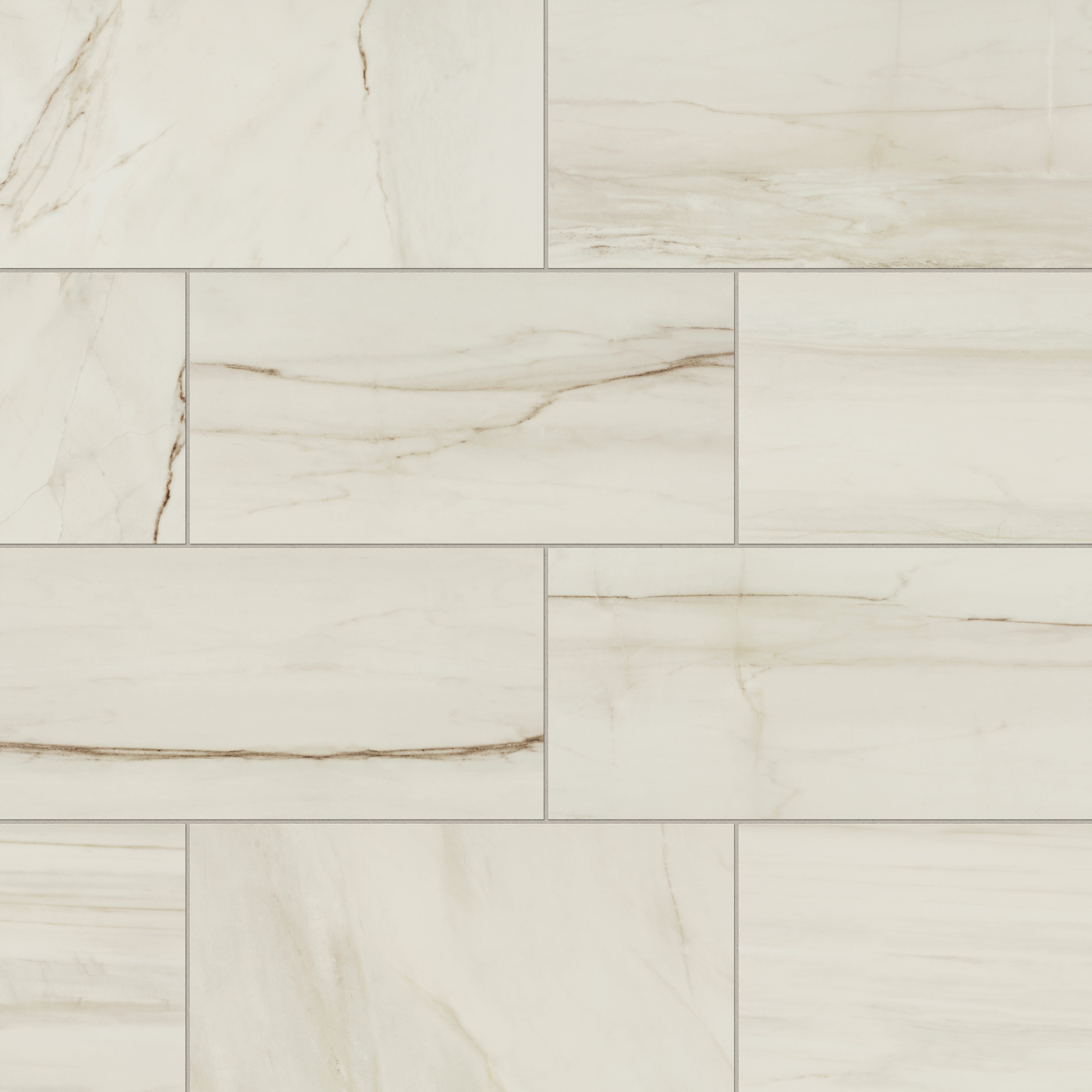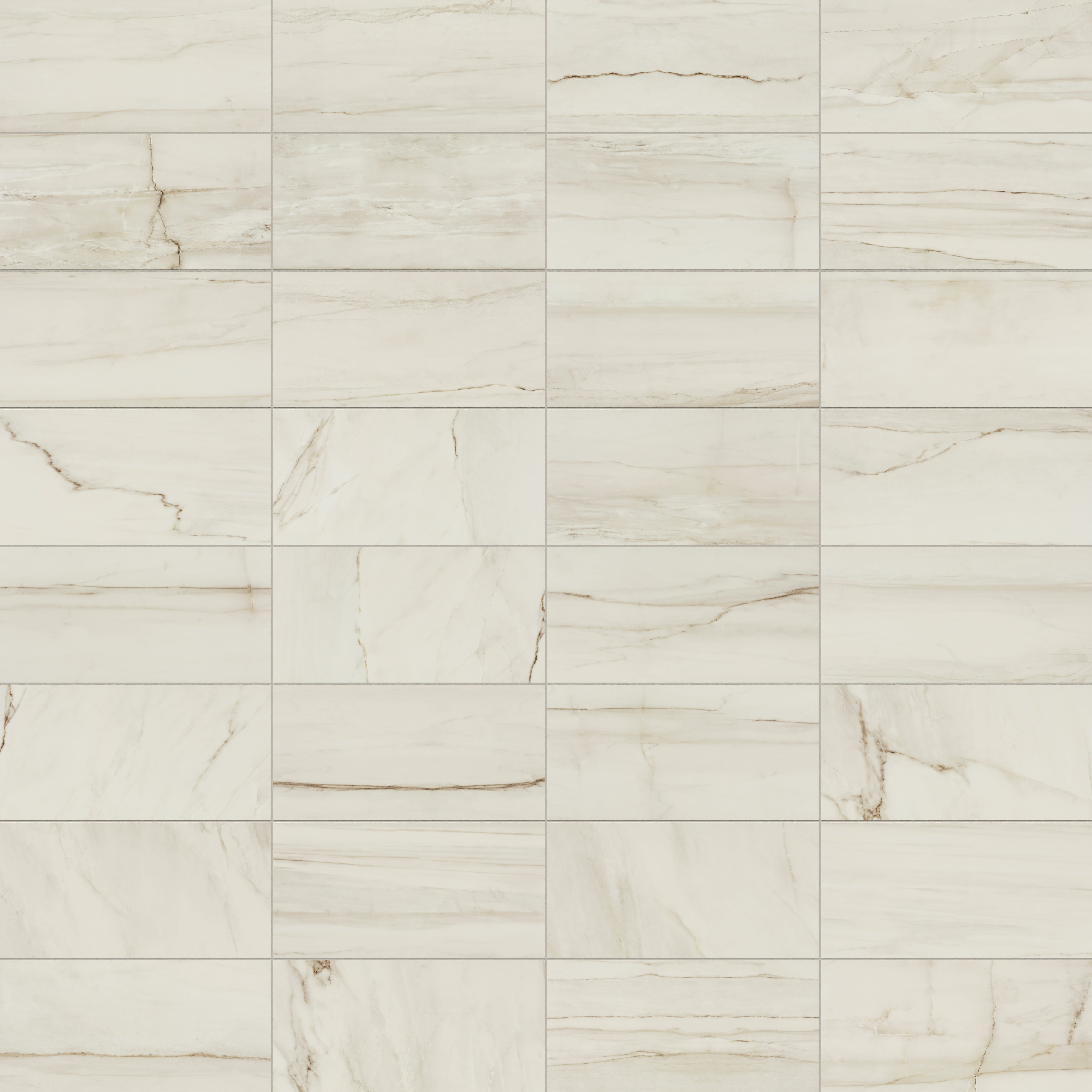 Our Kendrick 12x24 Satin Porcelain Tile in Sand draws inspiration from ancient imprints preserved by nature to reinvent the classic marble through a modern lens, showcasing fossil-like veining across a classic rectangular format in light beige. This is further enhanced by a velvety finish, offering a softened feel with subtle light diffusion.