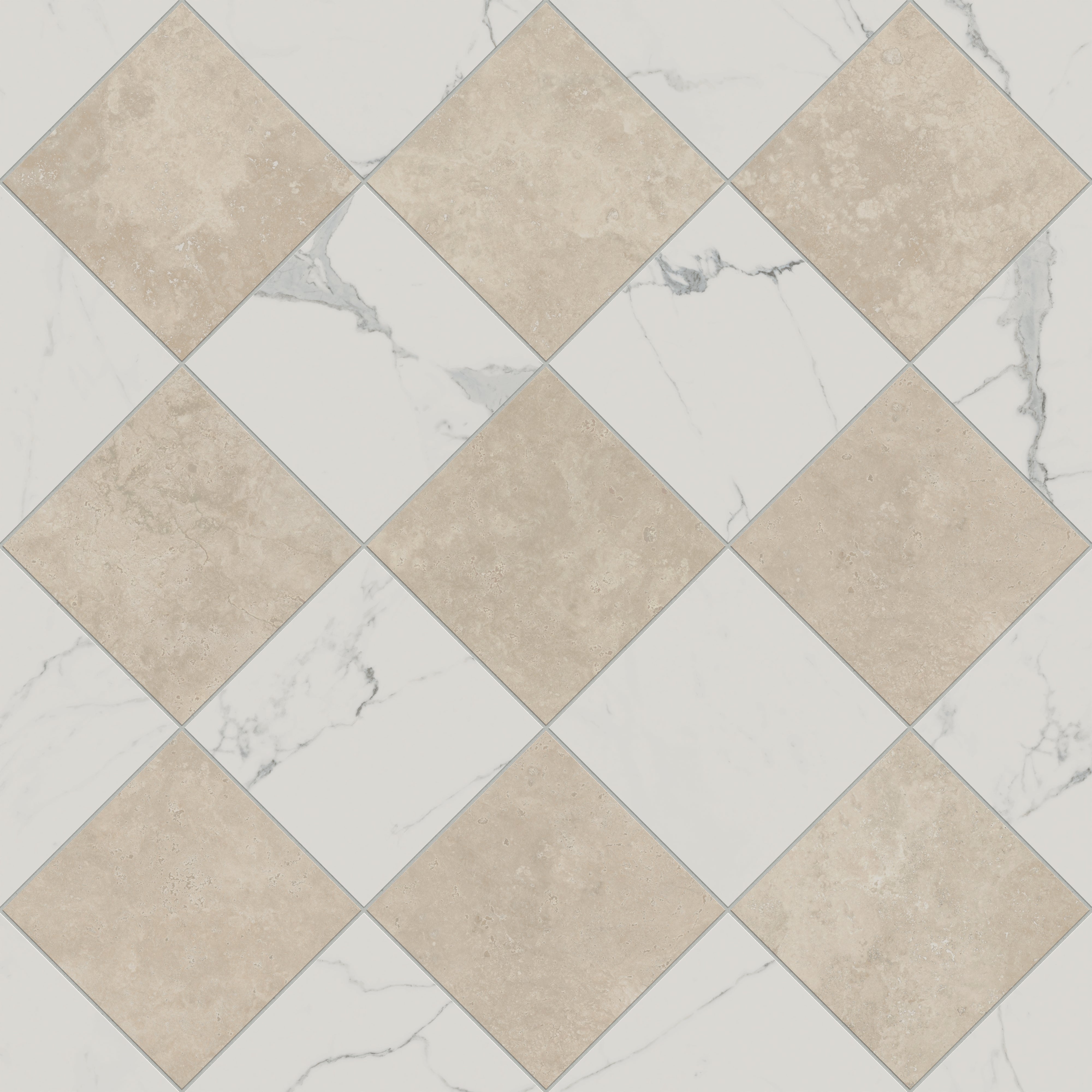 - Marble-inspired porcelain pairs for a low-maintenance checkerboard look