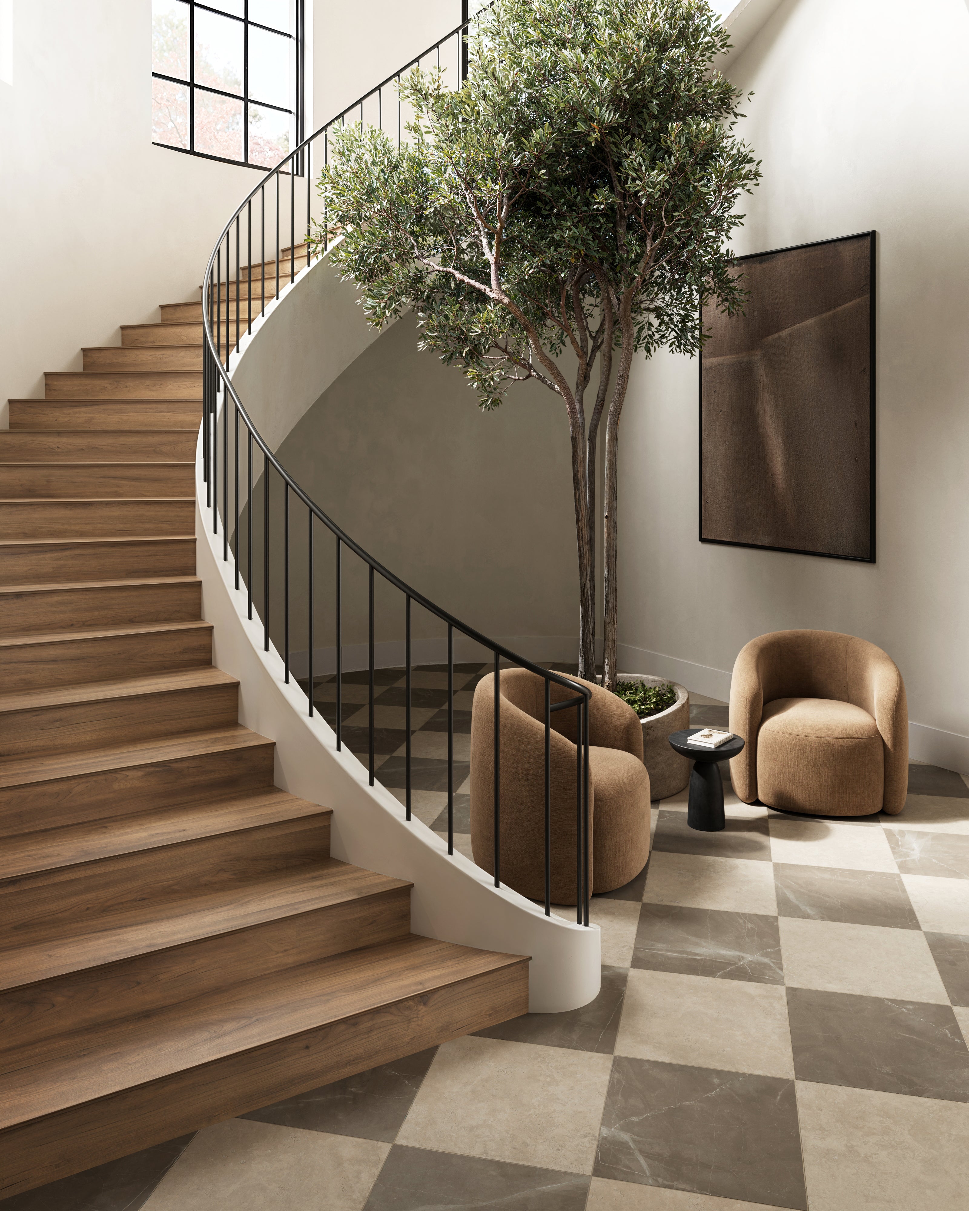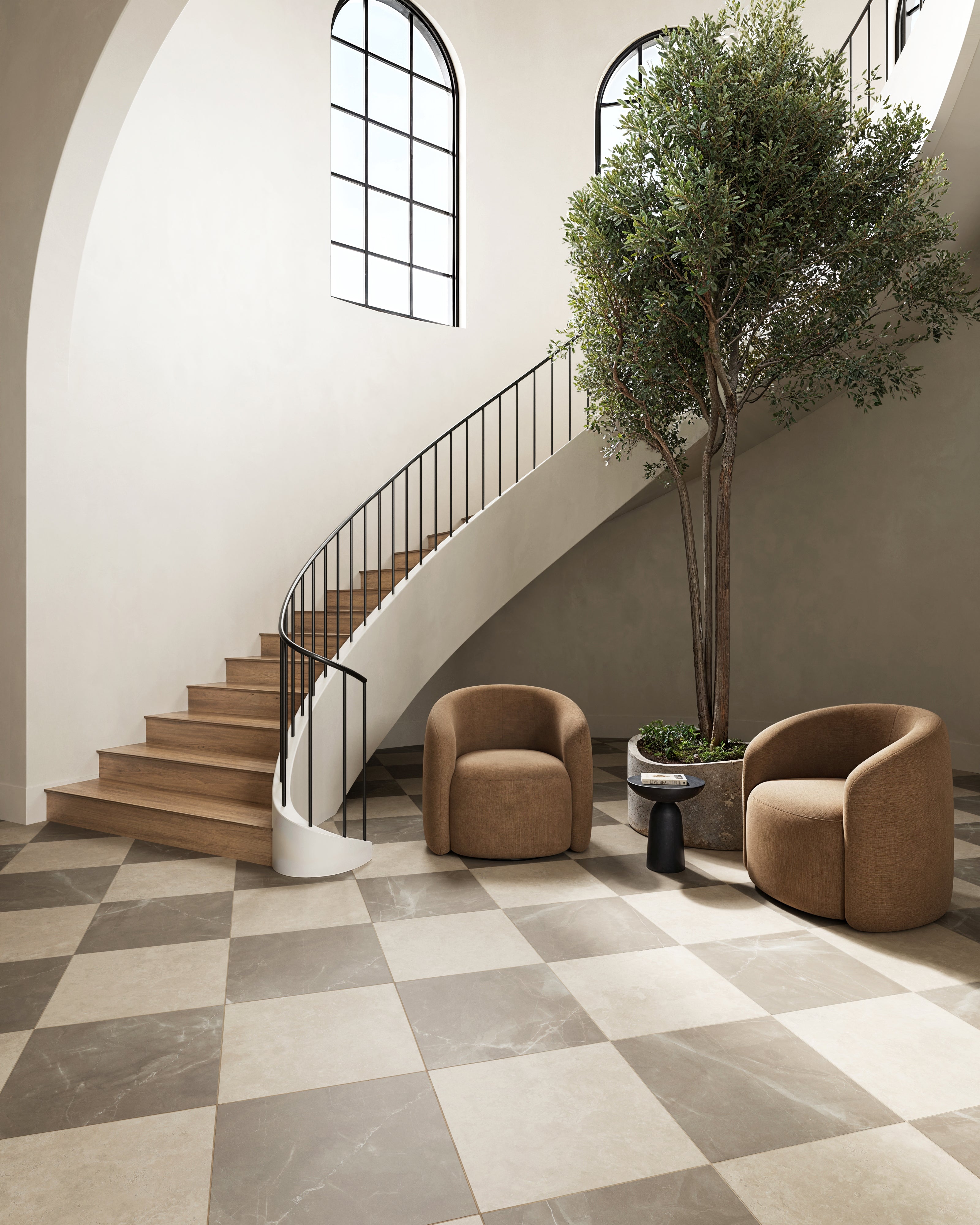 - Marble-inspired porcelain pairs for a low-maintenance checkerboard look