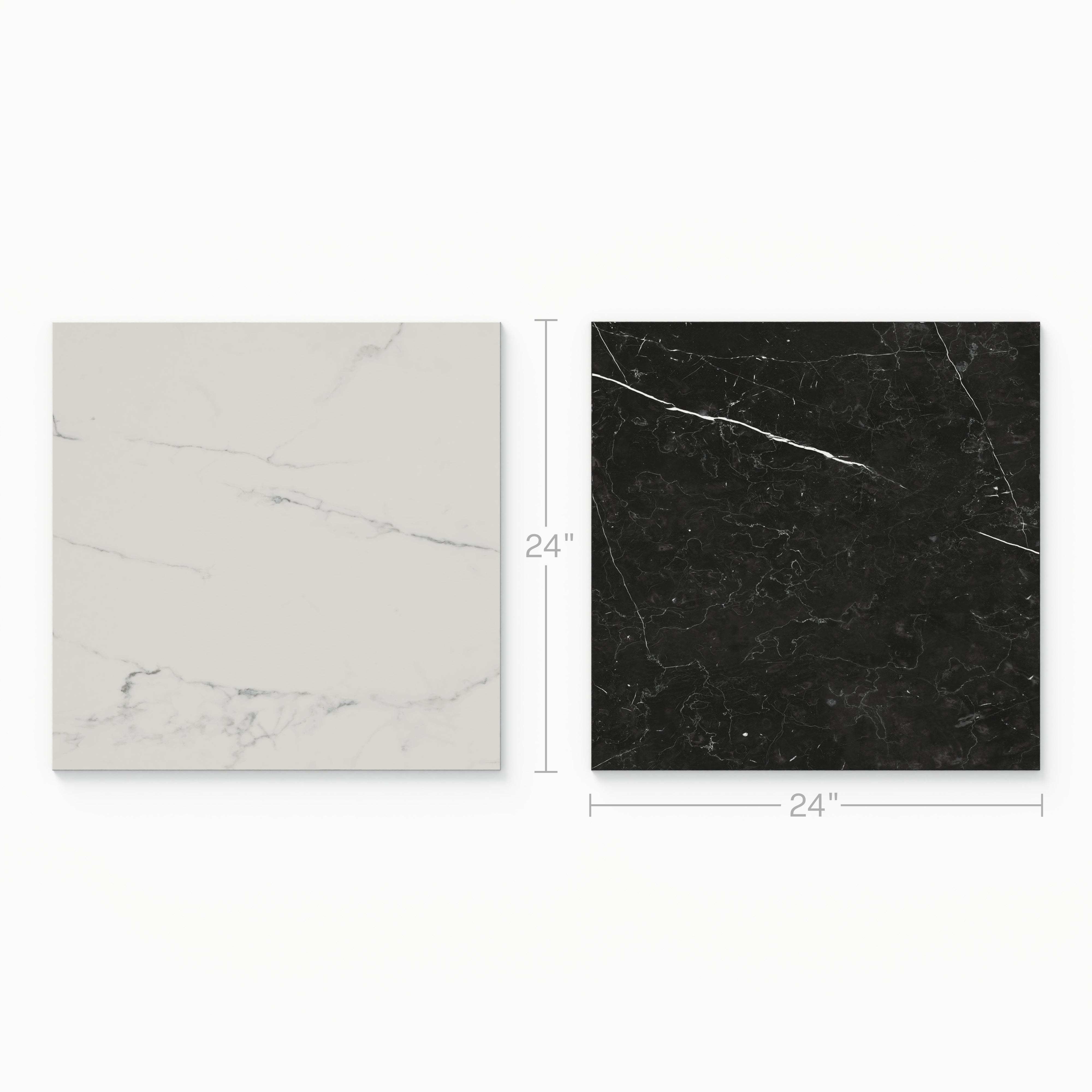 Classic elegance redefined—this is the essence of our Leona 24x24 Checkerboard Polished Porcelain Tile in Calacatta and Nero Marquina. Designed for those seeking a refined take on the timeless black-and-white checkered pattern, these large format square tiles strike the perfect balance between the soft gray veining of white Calacatta and the deep, dramatic black of Nero Marquina. Its polished finish also lends a sophisticated shine that further highlights the natural marble aesthetic, adding a sleek touch to this vintage-inspired style for a brighter, more open feel.