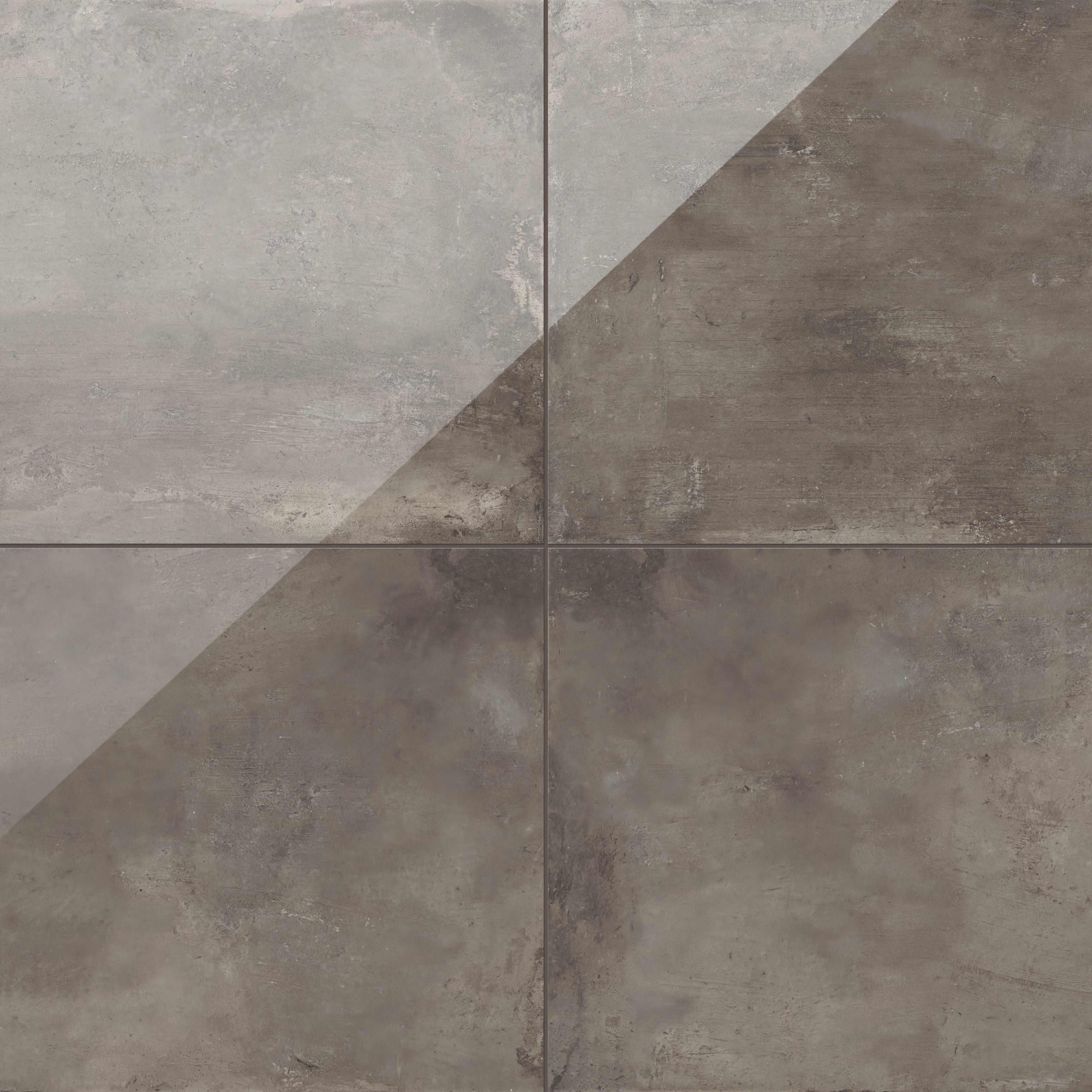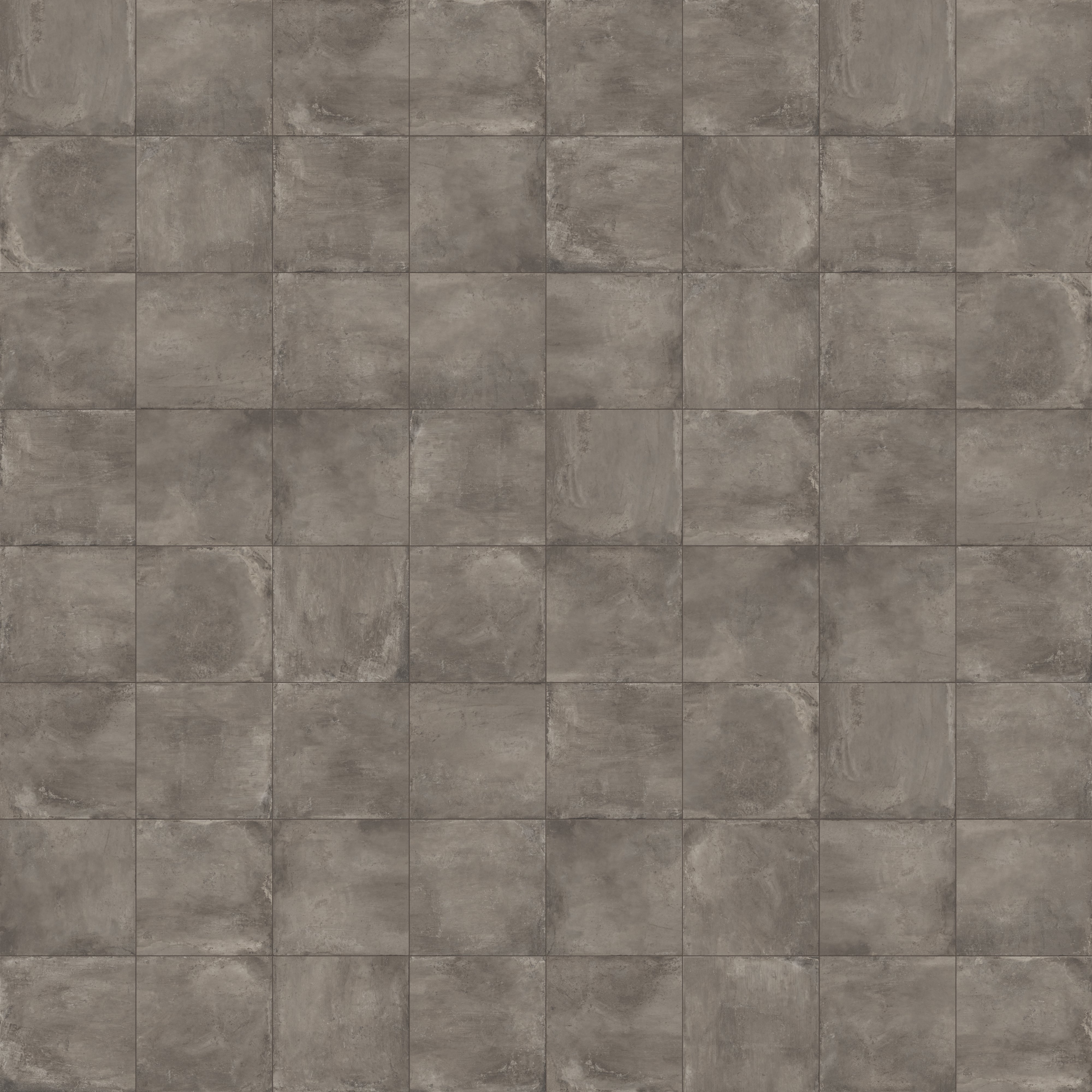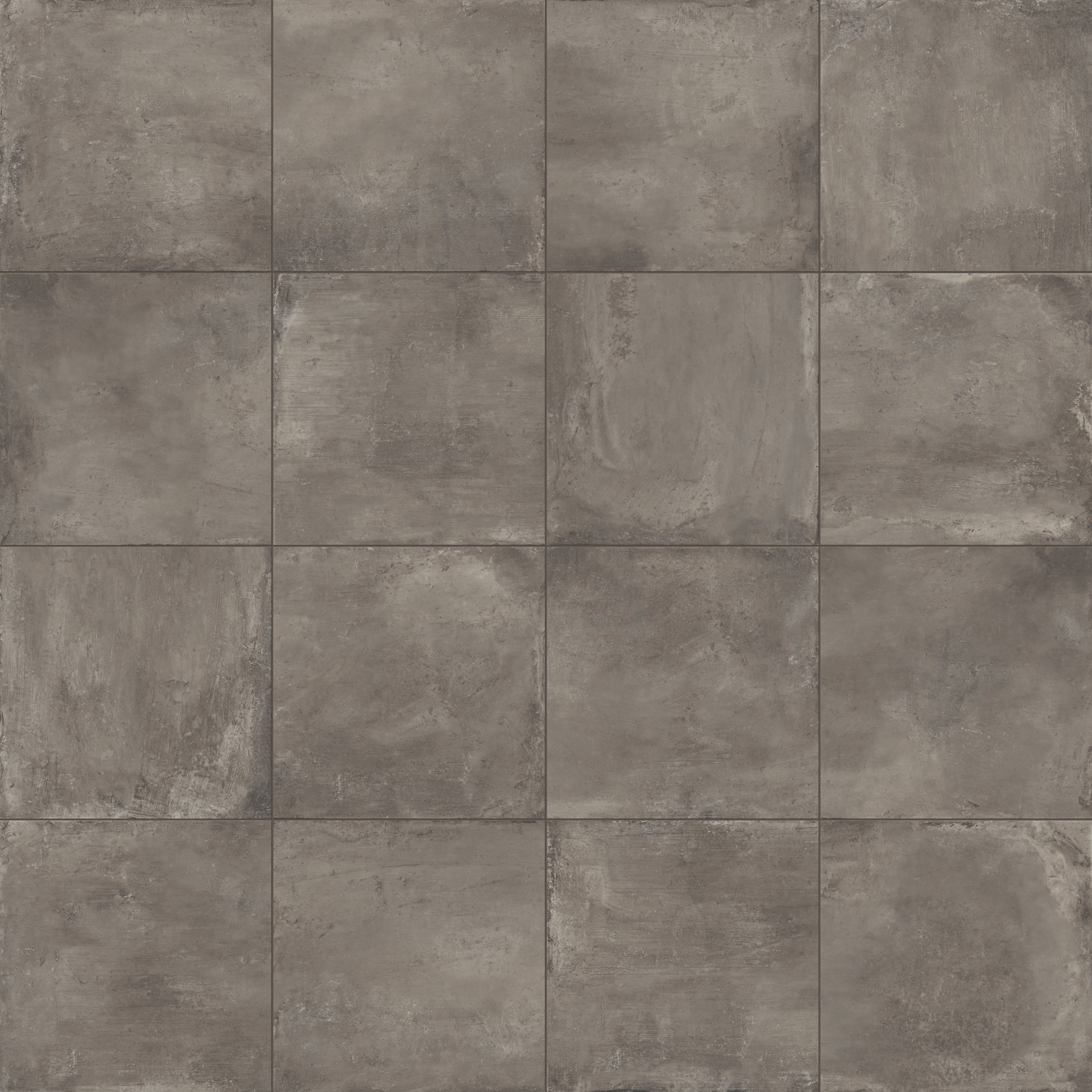 Rooted in American industrial design, our Ramsey 24x24 Polished Porcelain Tile in Smoke layers a refined neutral palette and dynamic, life-like visual textures to elevate the familiar look of hand-troweled concrete. Its large square format features a gleaming, earthy brown shade with dark gray undertones, bringing a sense of warmth to modern, minimalist settings.