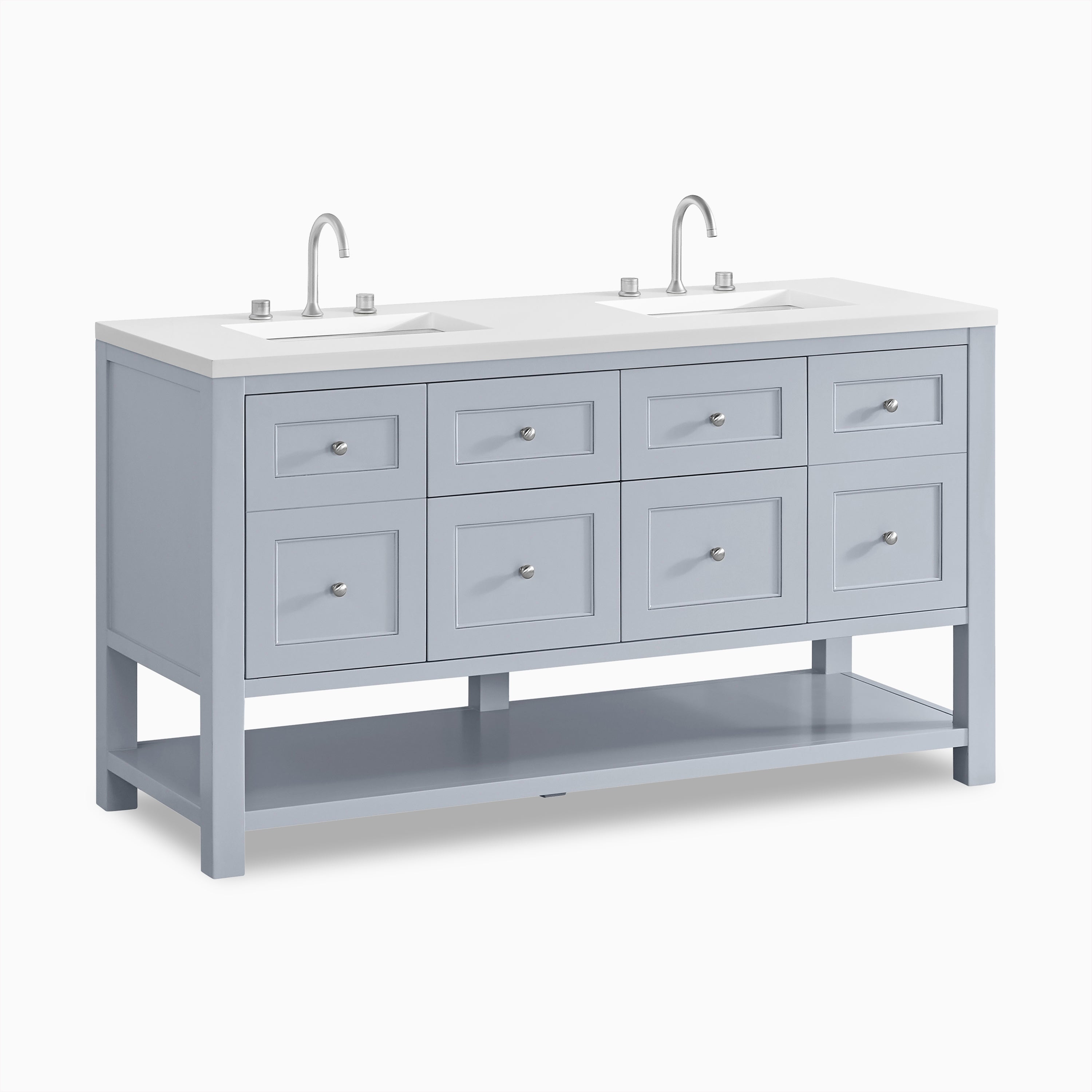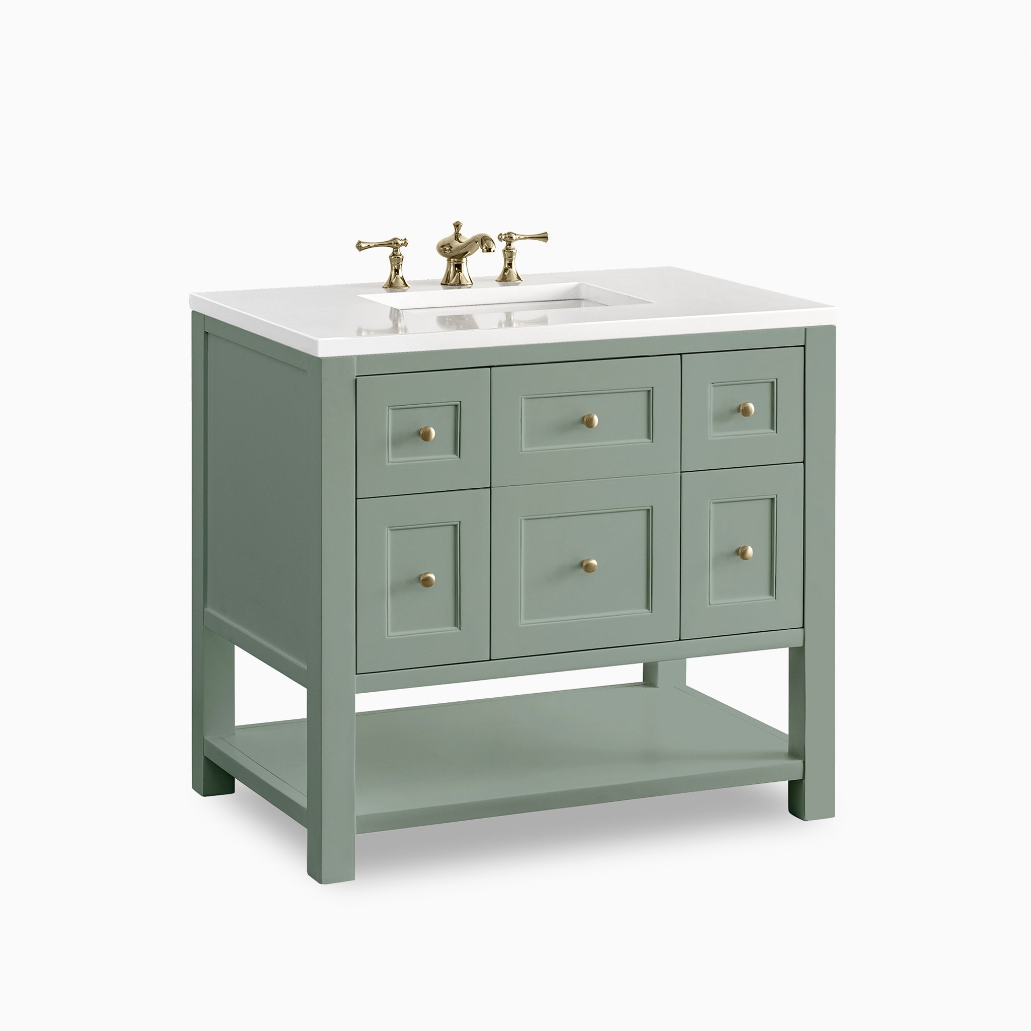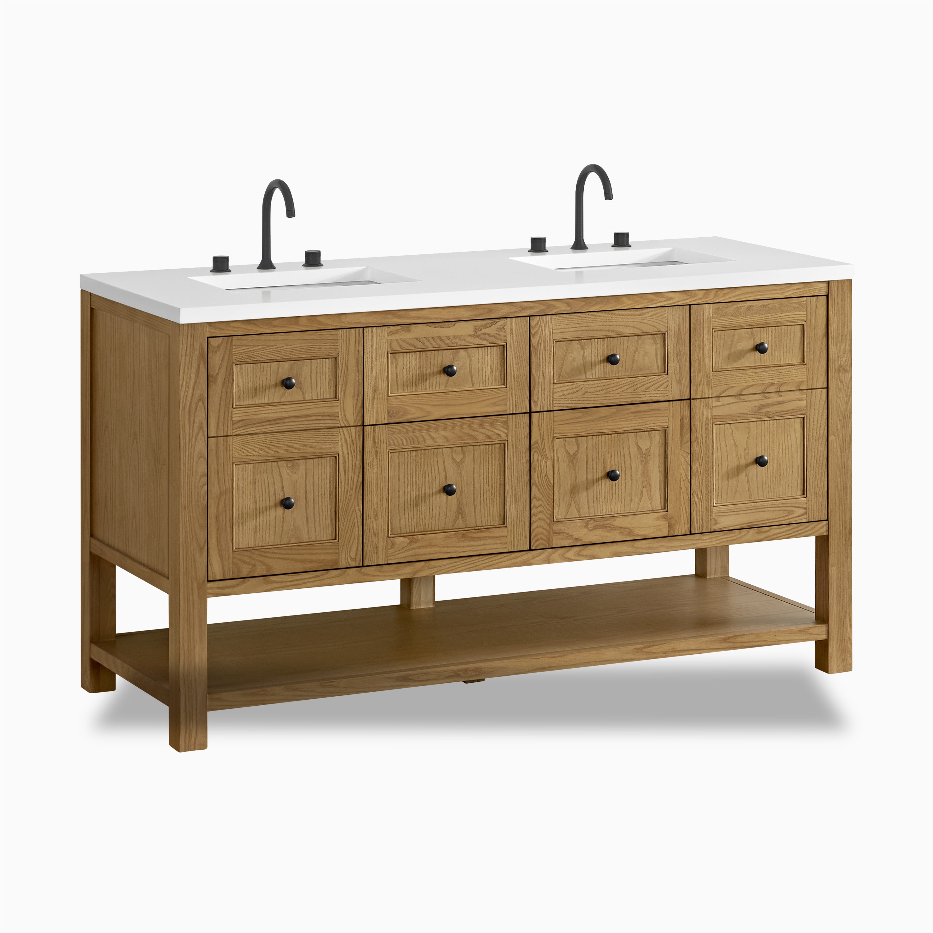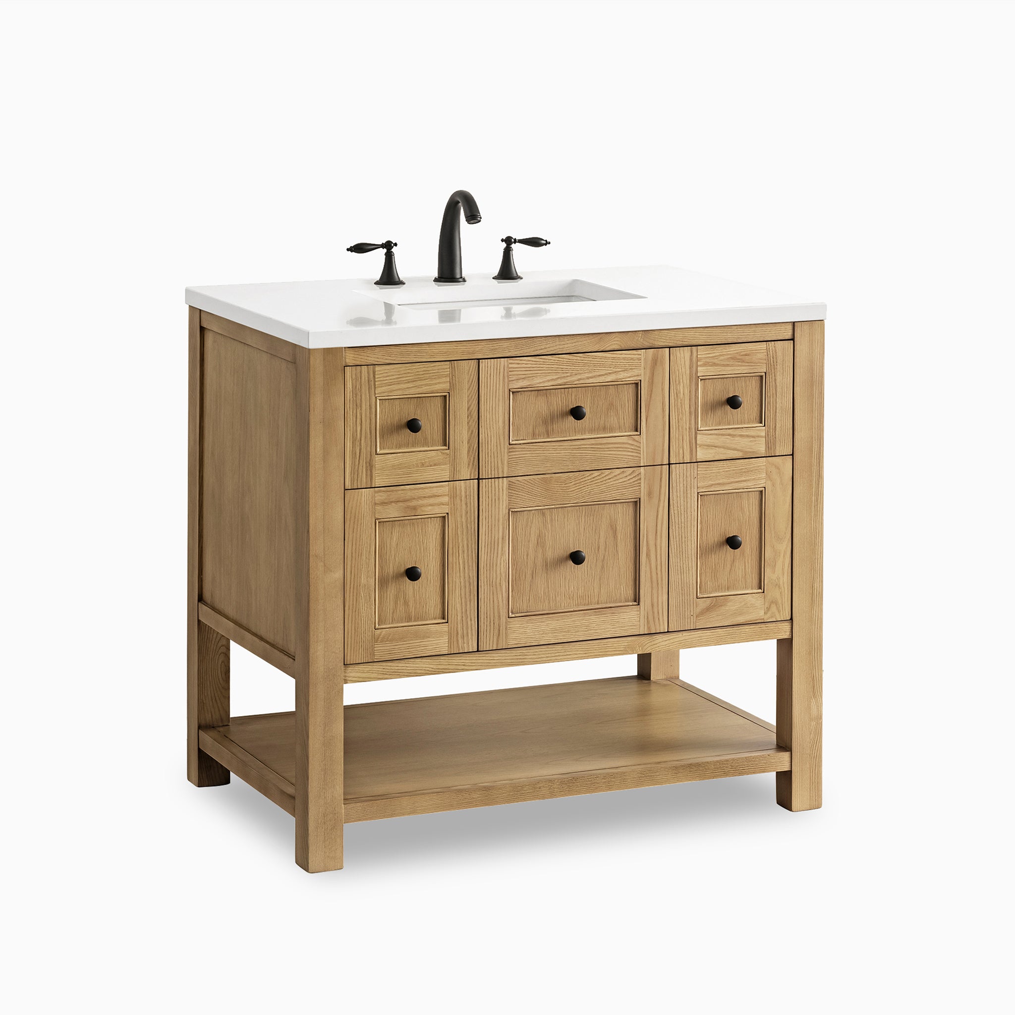 A modern update on the traditional Mission style furniture, Bridgette features framed panels and a rich solid hue that fits seamlessly in transitional and modern farmhouse bathrooms. Thoughtfully designed storage includes a single-door cabinet, 2 tip-out and full-extension drawers, and an open shelf at the base.
