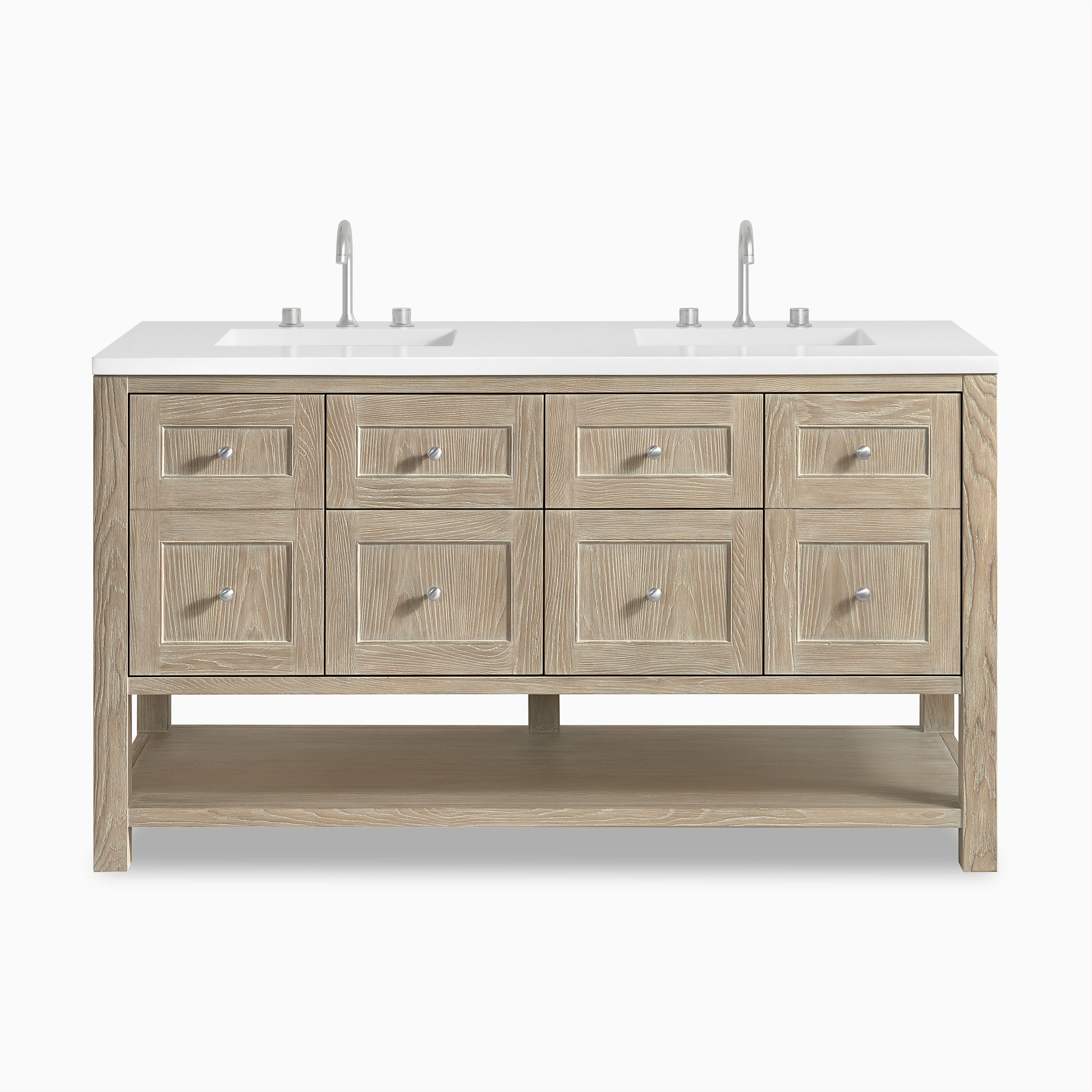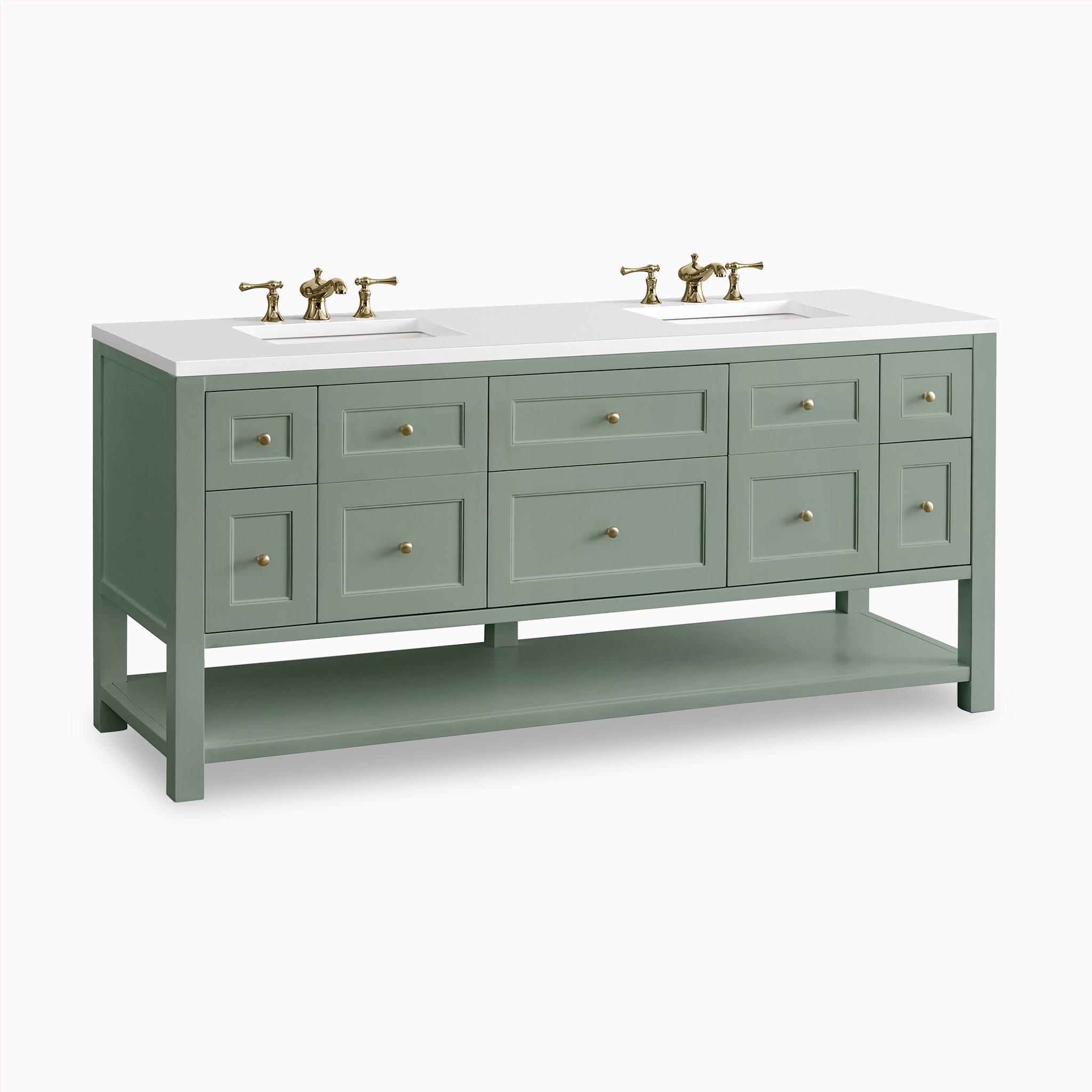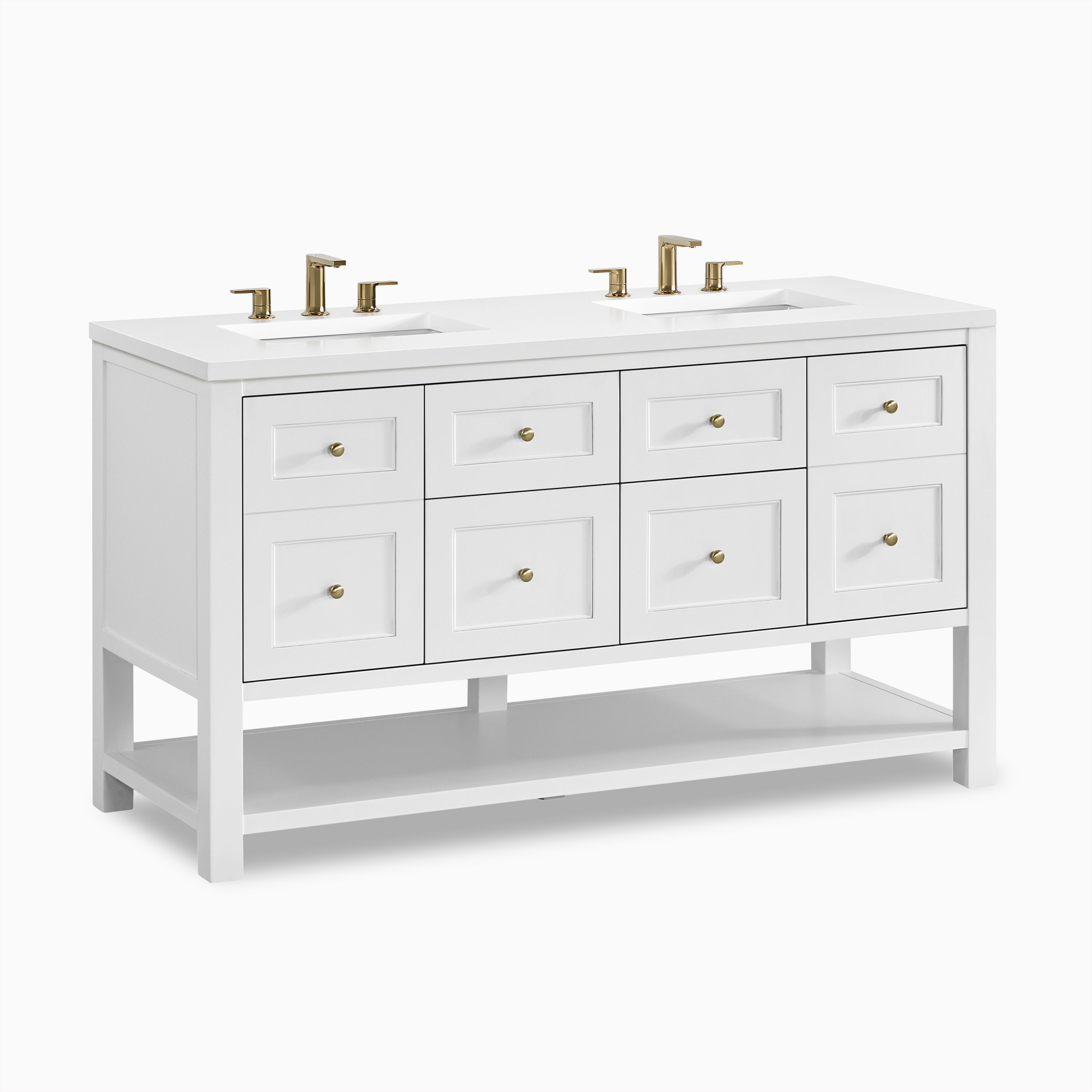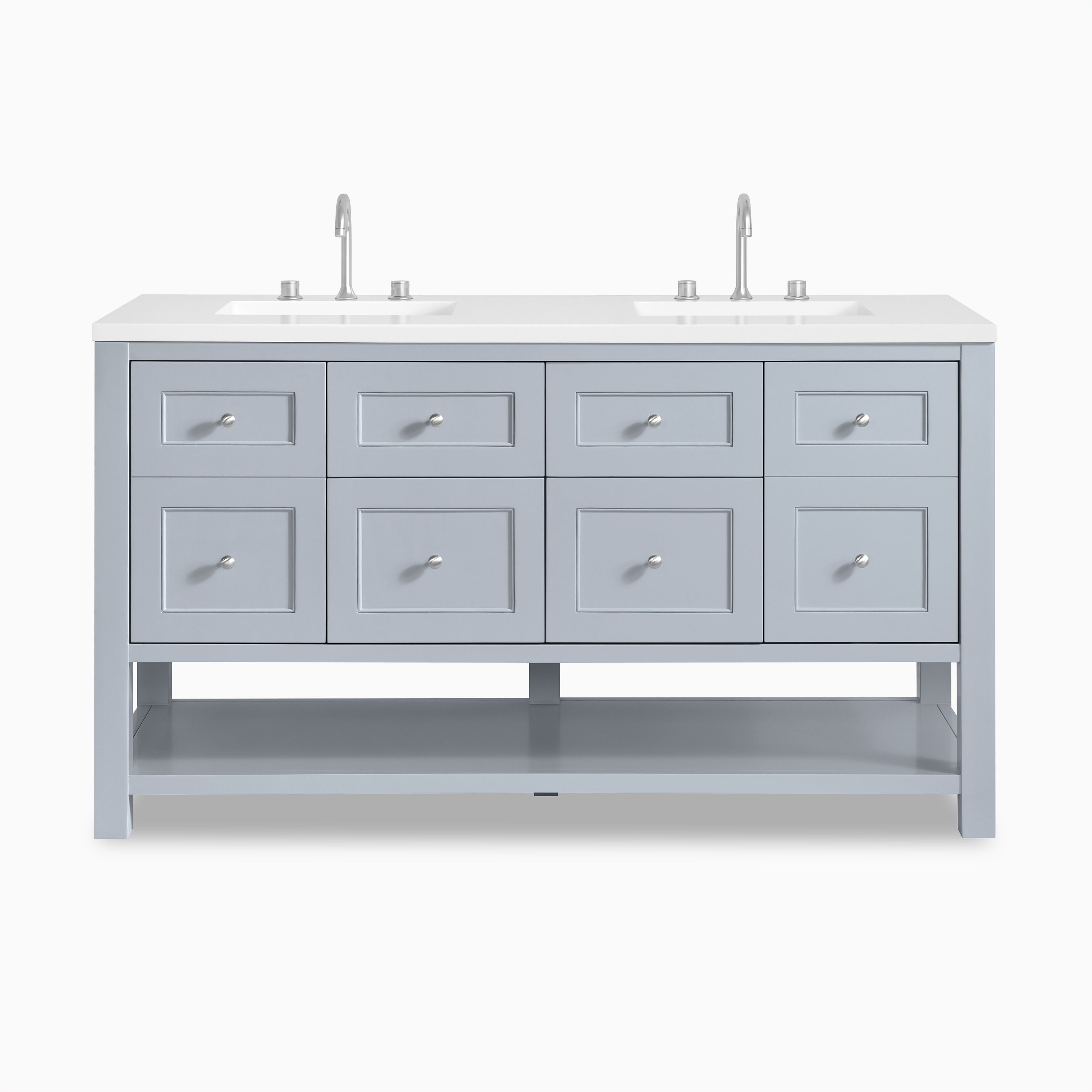 A modern update on the traditional Mission style furniture, Bridgette features framed panels and a rich solid hue that fits seamlessly in transitional and modern farmhouse bathrooms. Thoughtfully designed storage includes a single-door cabinet, 2 tip-out and full-extension drawers, and an open shelf at the base.