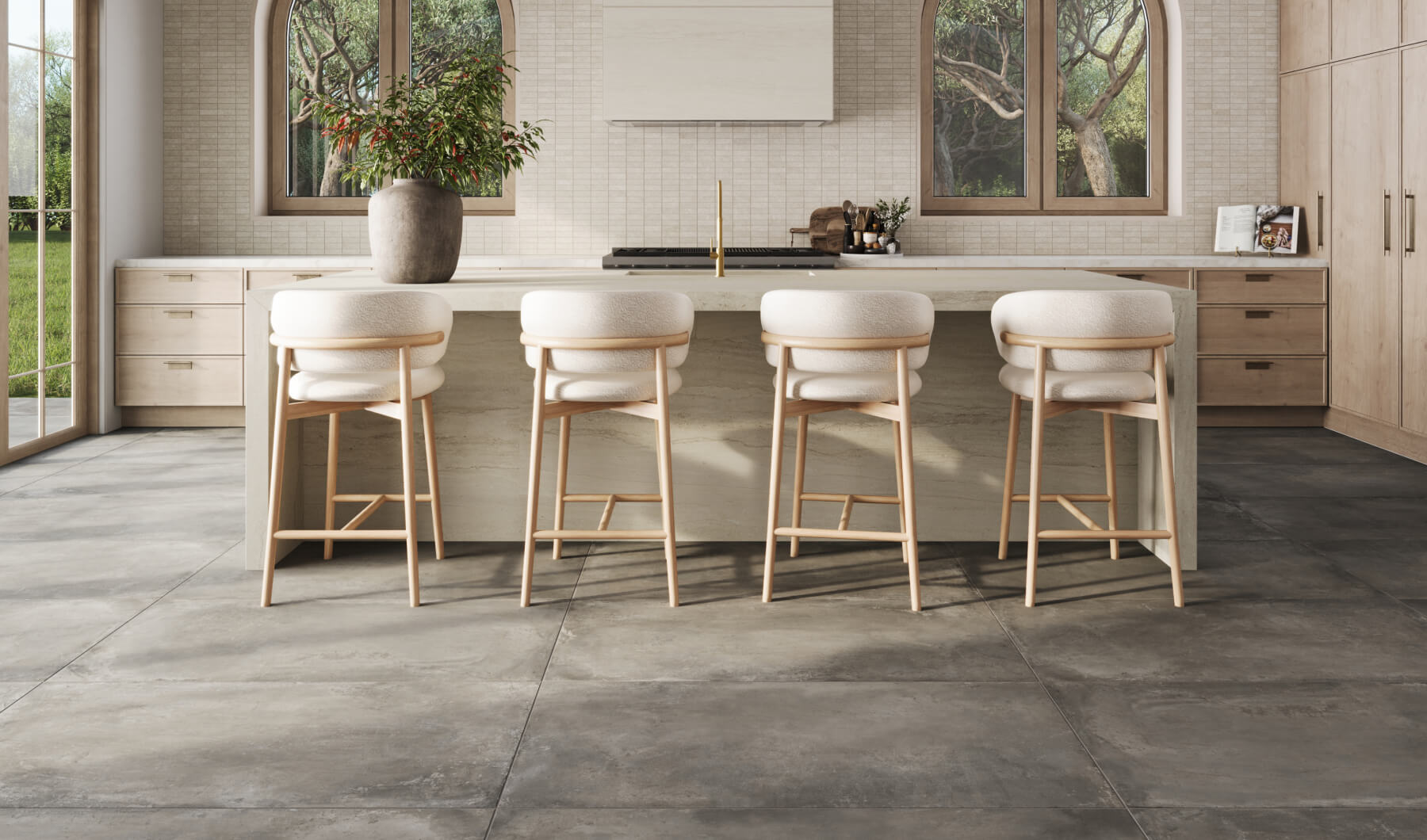Modern kitchen with large-format concrete-look floor tiles, paired with a neutral island and light wood stools, creating a sleek yet natural ambiance