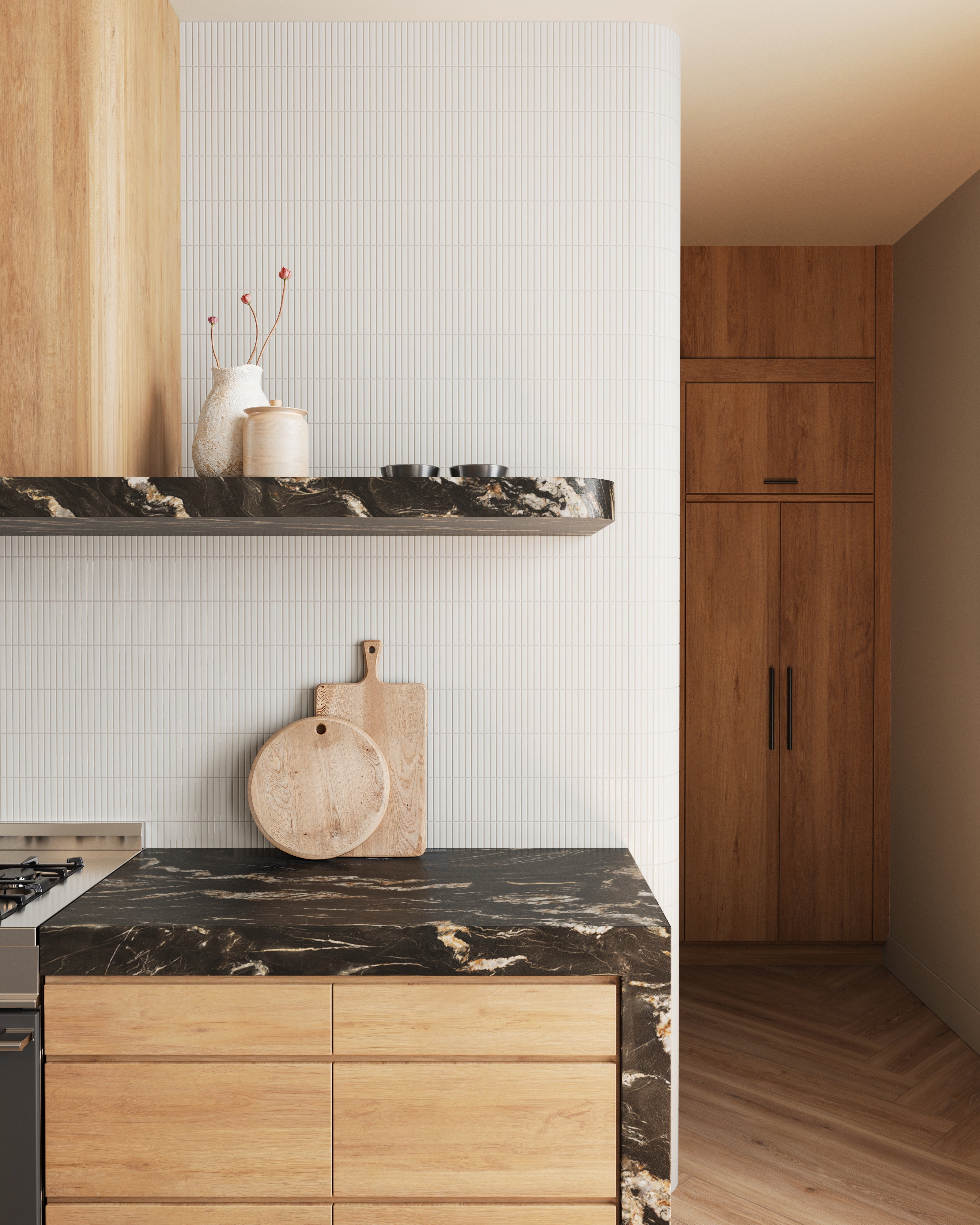 A 2x6 porcelain subway tile in deep navy blue, featuring a matte finish, and a clean stacked layout with fine grout lines.Blue matte tiles create a rich, textured backsplash, complementing warm wood shelves and a marble countertop.