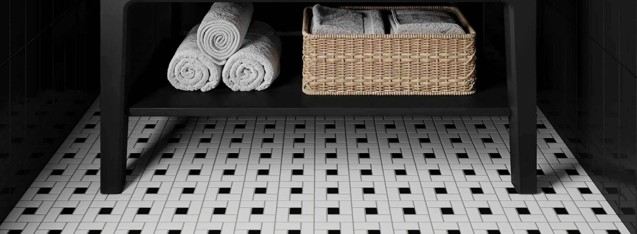 Quinn brings timeless black-and-white patterns to life through classic geometric forms like octagons, pinwheels, and floral hexagons. Crafted from durable matte porcelain, each 12x12 mosaic tile offers a glare-free surface ideal for high-traffic floors.