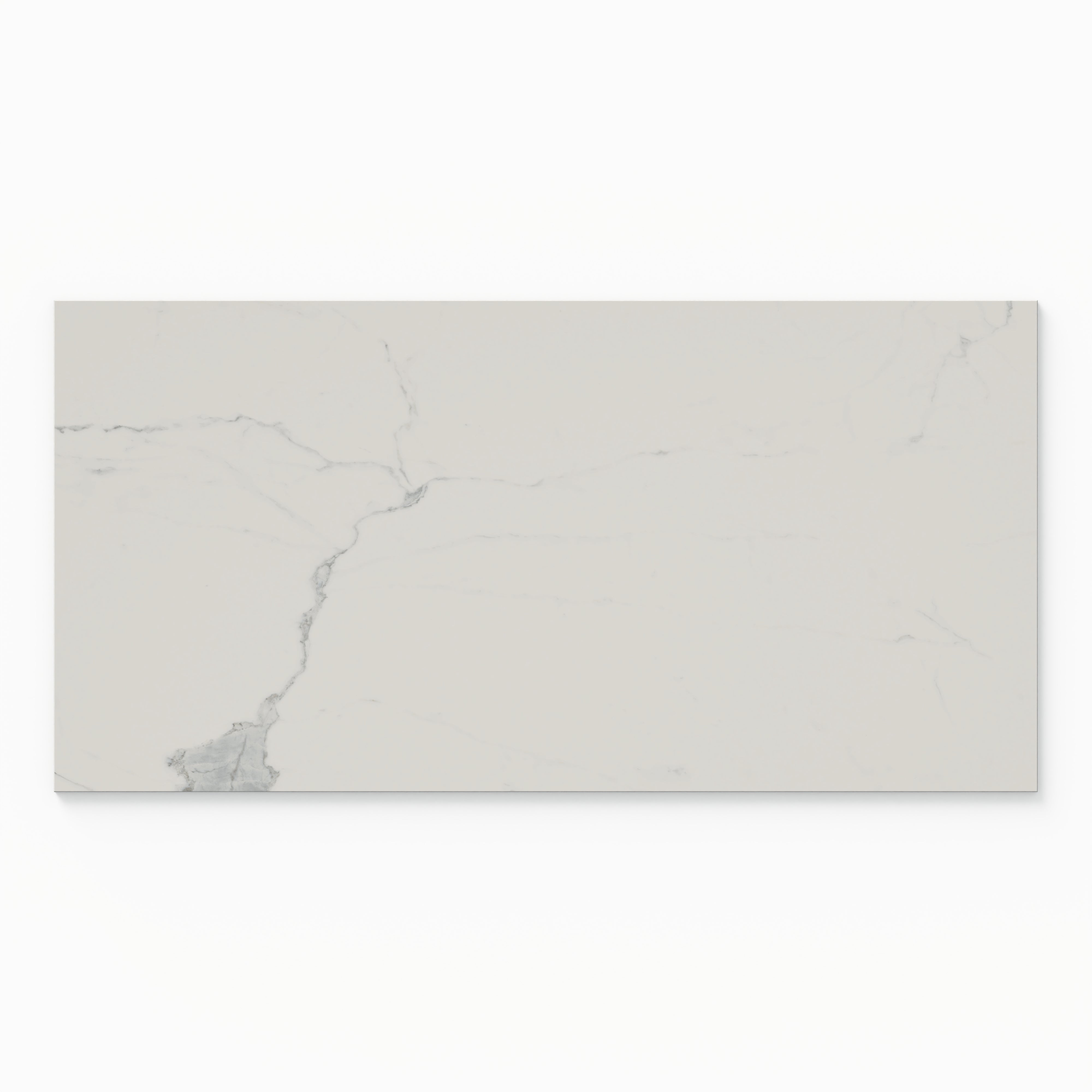 Matte Carrara Bianco porcelain marble look tile in 12x24 format, featuring light grey veining on a bright white base for a classic, versatile design.Aniston 12x24 Matte Porcelain Tile in Carrara Bianco