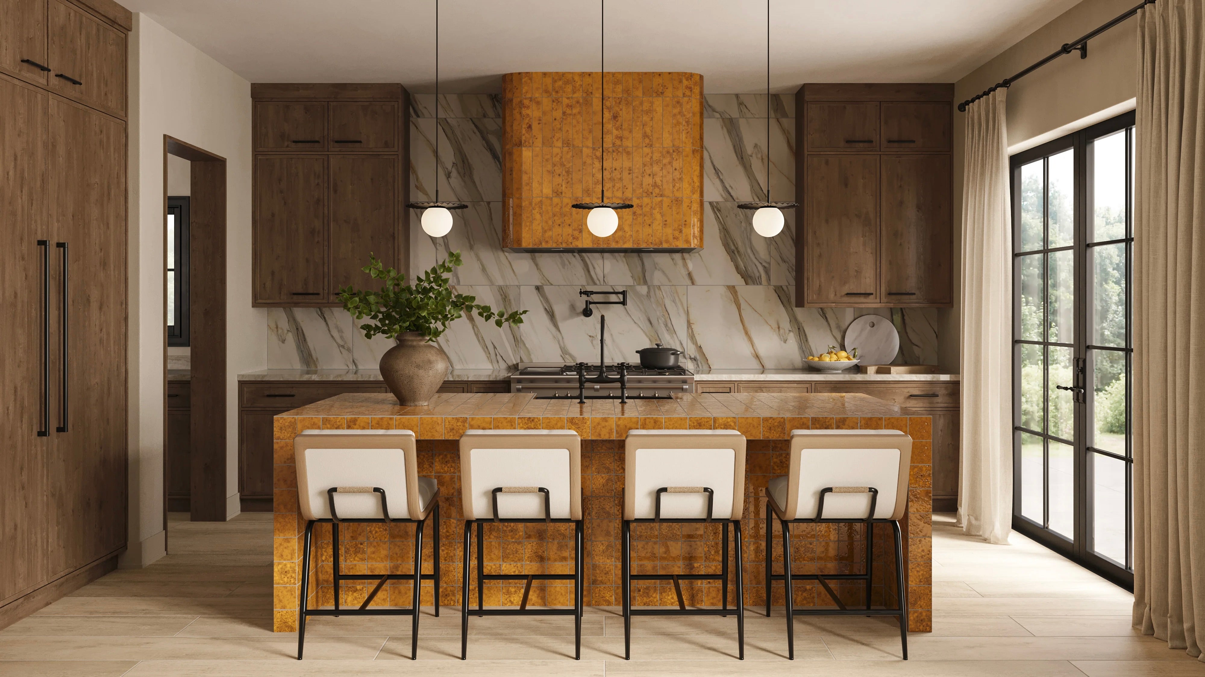 Earthy terracotta tile blends perfectly with natural stone and warm wood tones. The result is a space that feels grounded, inviting, and effortlessly elegant.