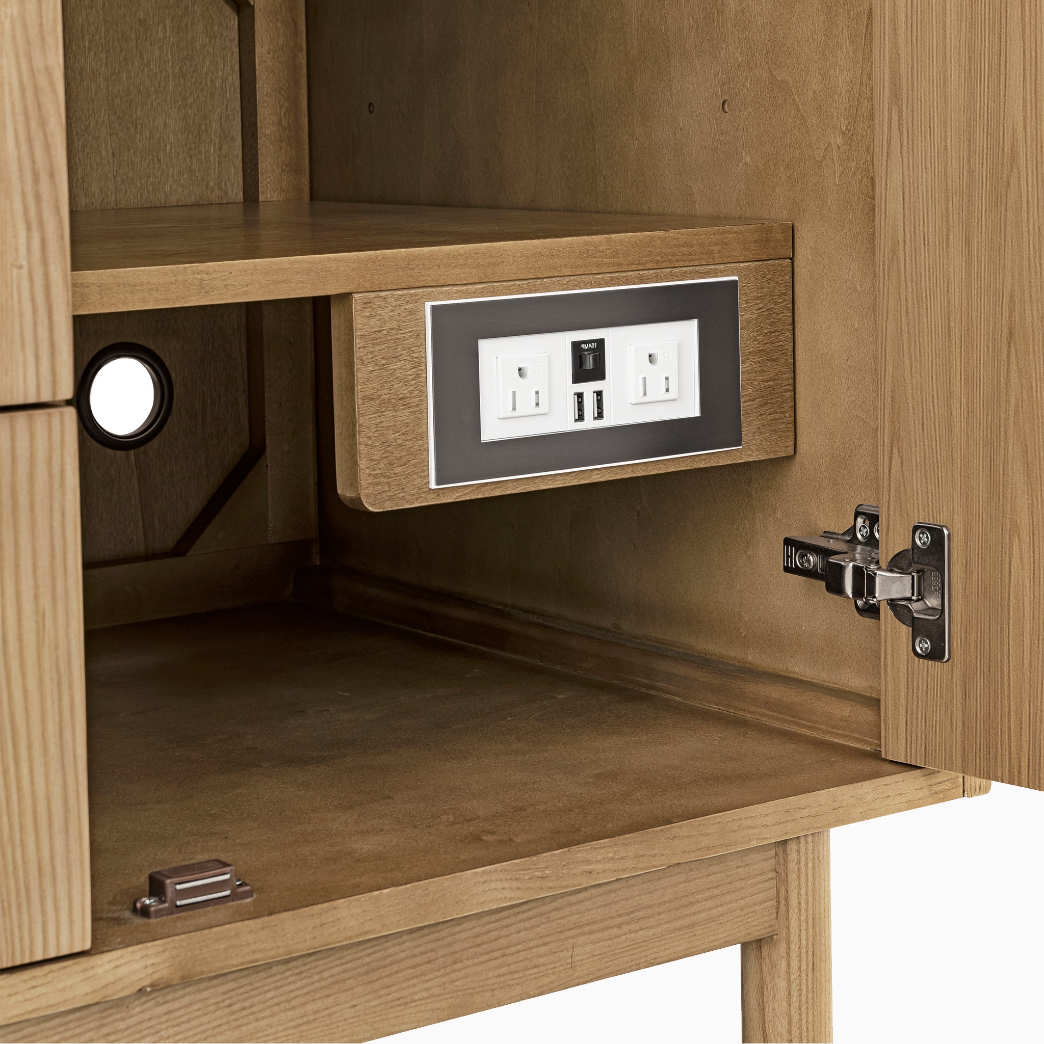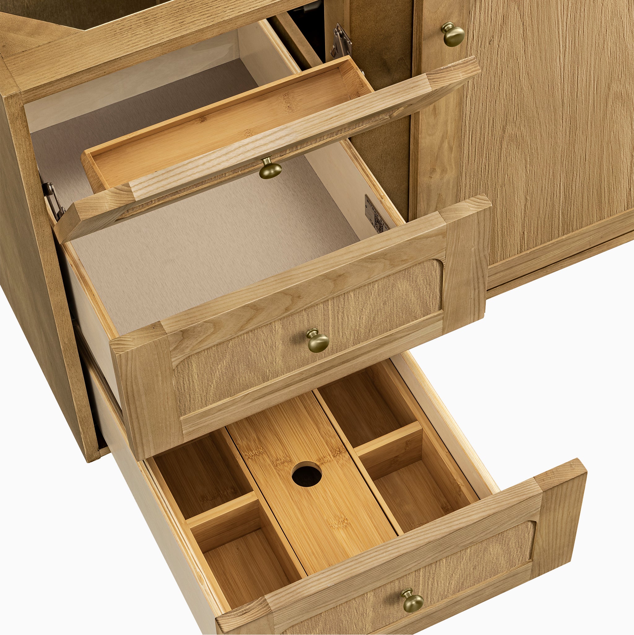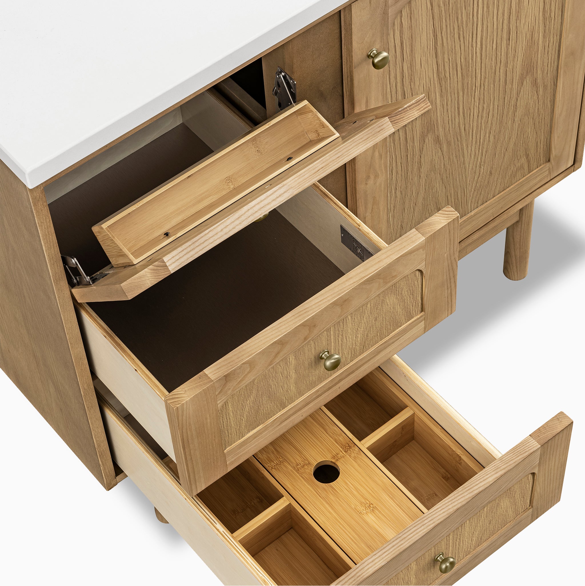 Warm, pared-back, and quietly functional, our Abigail 36" Single Vanity in Light Natural Oak with 3 cm White Zeus Quartz Top is designed to bring a sense of ease to the everyday. The soft curves of the cabinet panel meet the linear detailing of a classic picture frame profile, all finished in a light natural tone that highlights the subtle grain of cathedral ash veneers. Behind the single door is an adjustable shelf with a discreet power and USB outlet making room for the small routines, while adjacent to it are stacked drawers of 3 with a removable bamboo organizer. Whether installed as a freestanding piece with a contemporary wood base or mounted to the wall with a sturdy French cleat, this vanity adapts easily to its space.