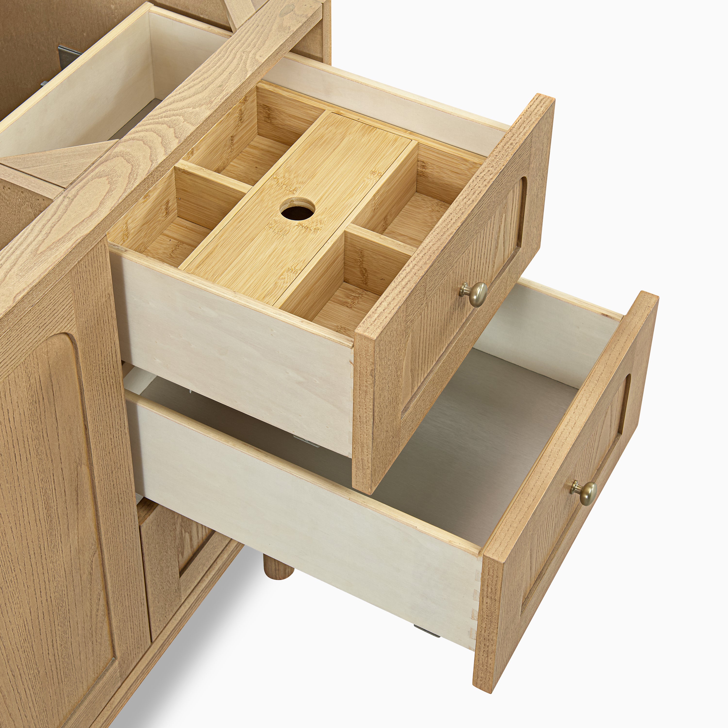 Warm, pared-back, and quietly functional, our Abigail 60" Single Vanity in Light Natural Oak with 3 cm White Zeus Quartz Top is designed to bring a sense of ease to the everyday. The soft curves of the cabinet panels meet the linear detailing of a classic picture frame profile, all finished in a light natural tone that highlights the subtle grain of cathedral ash veneers. Behind the double doors is an adjustable shelf with a discreet power and USB outlet making room for the small routines, while on both sides are stacked full-extension drawers of 3 with a removable bamboo organizer. Whether installed as a freestanding piece with a contemporary wood base or mounted to the wall with a sturdy French cleat, this vanity adapts easily to its space.