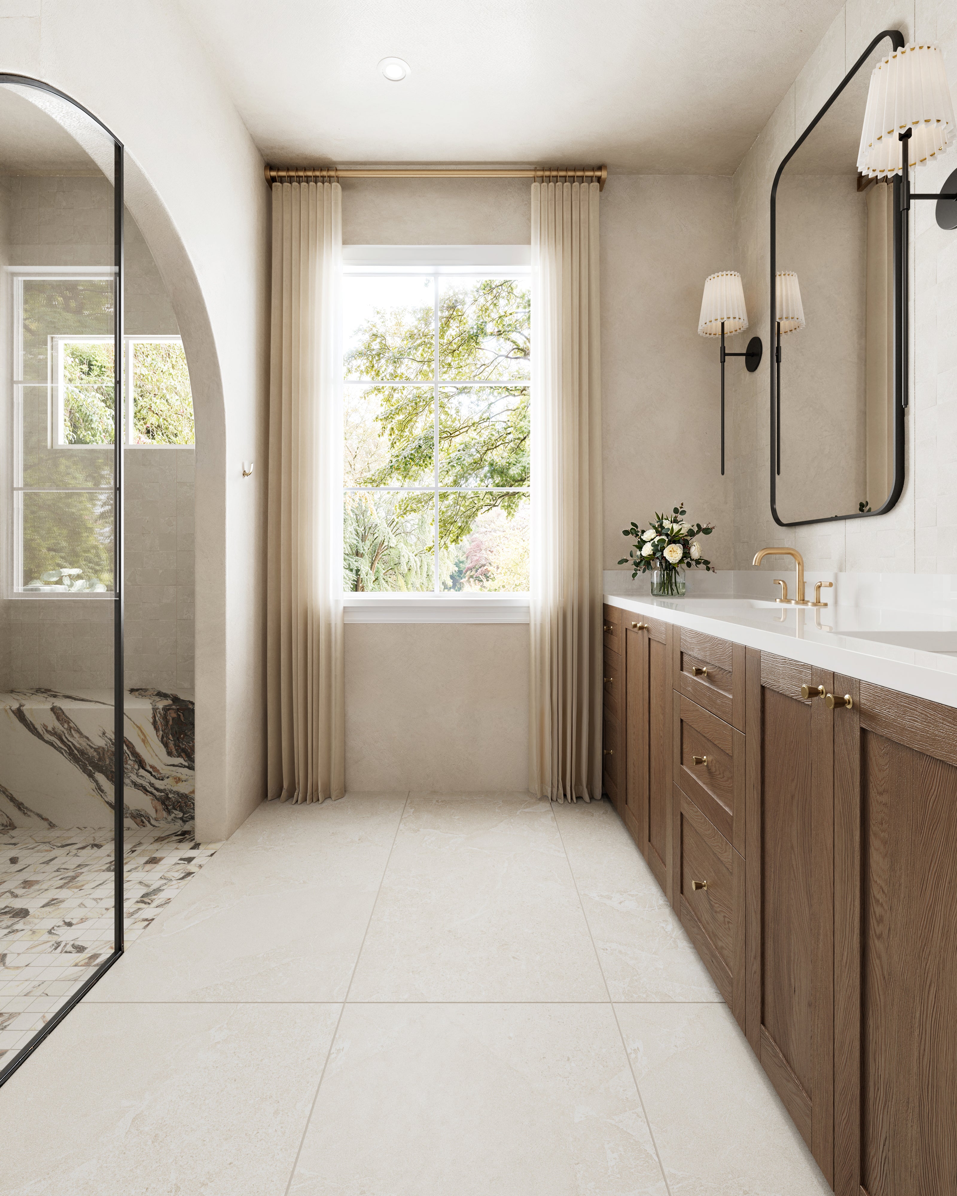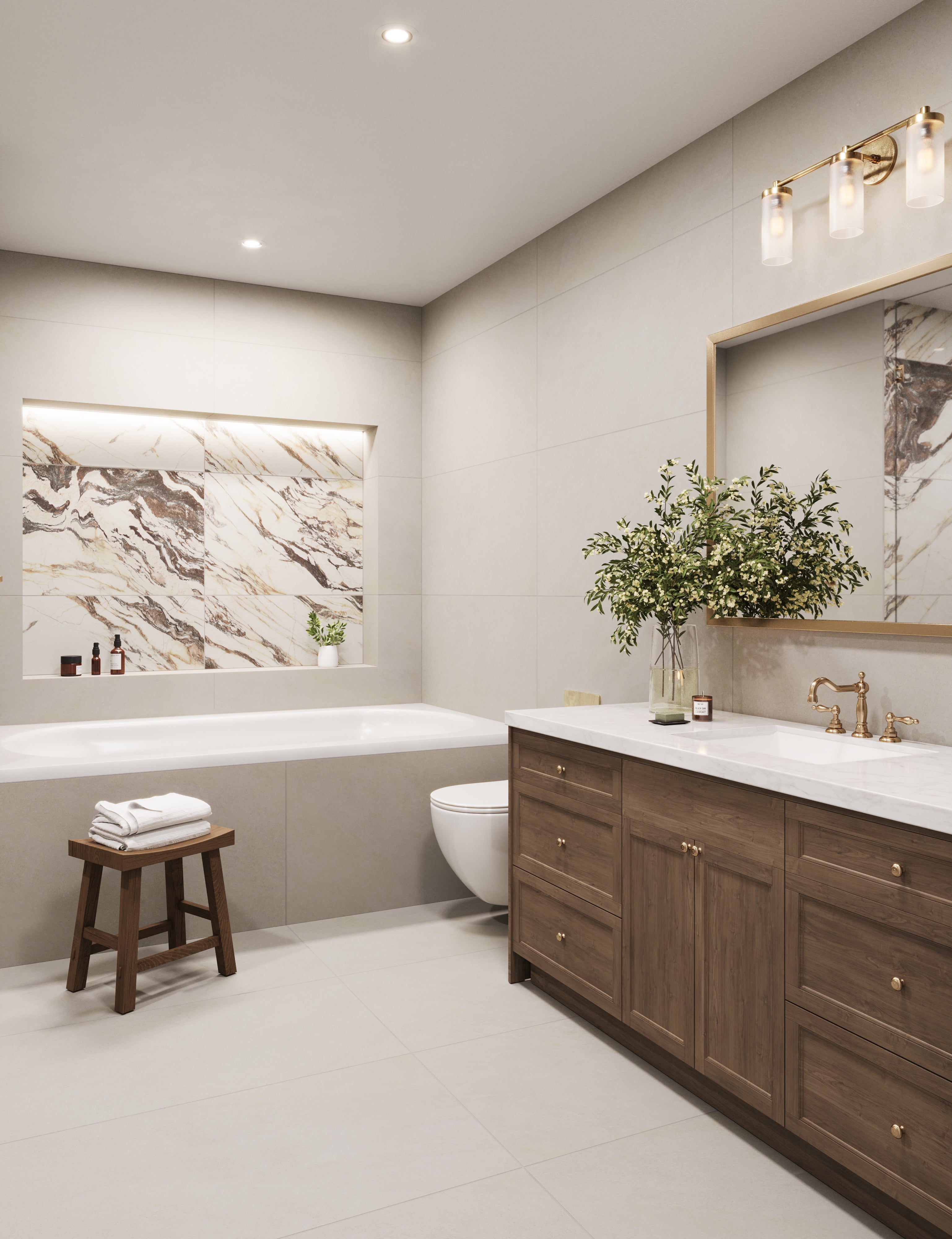 A tribute to marble’s most noble form, our Aniston 24x48 Matte Porcelain Tile in Calacatta Viola features striking currents of brown and beige that drift across a large, white rectangular canvas. With a smooth finish that diffuses light like silk, it envelopes any space with a modern sense of grandeur that transcends time.