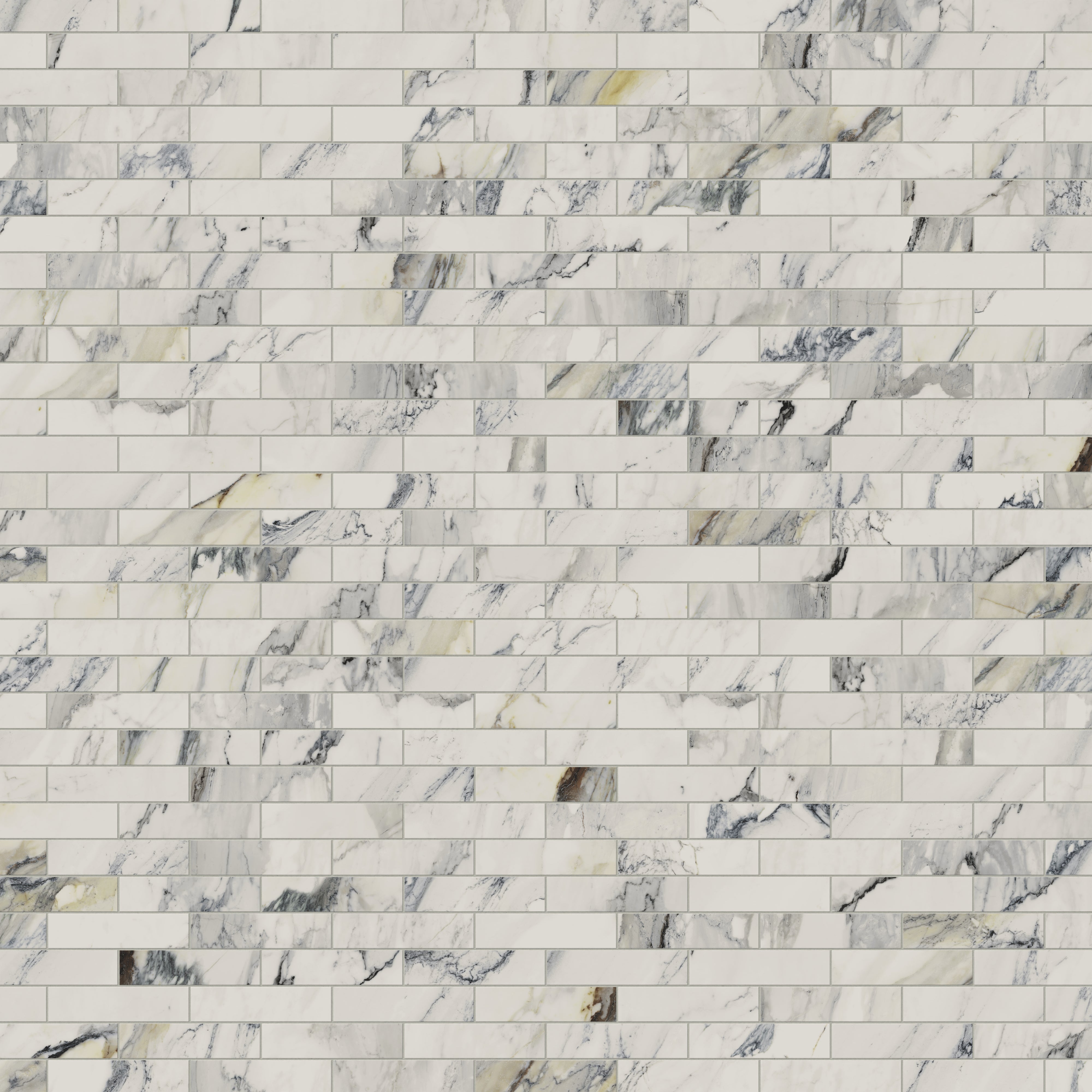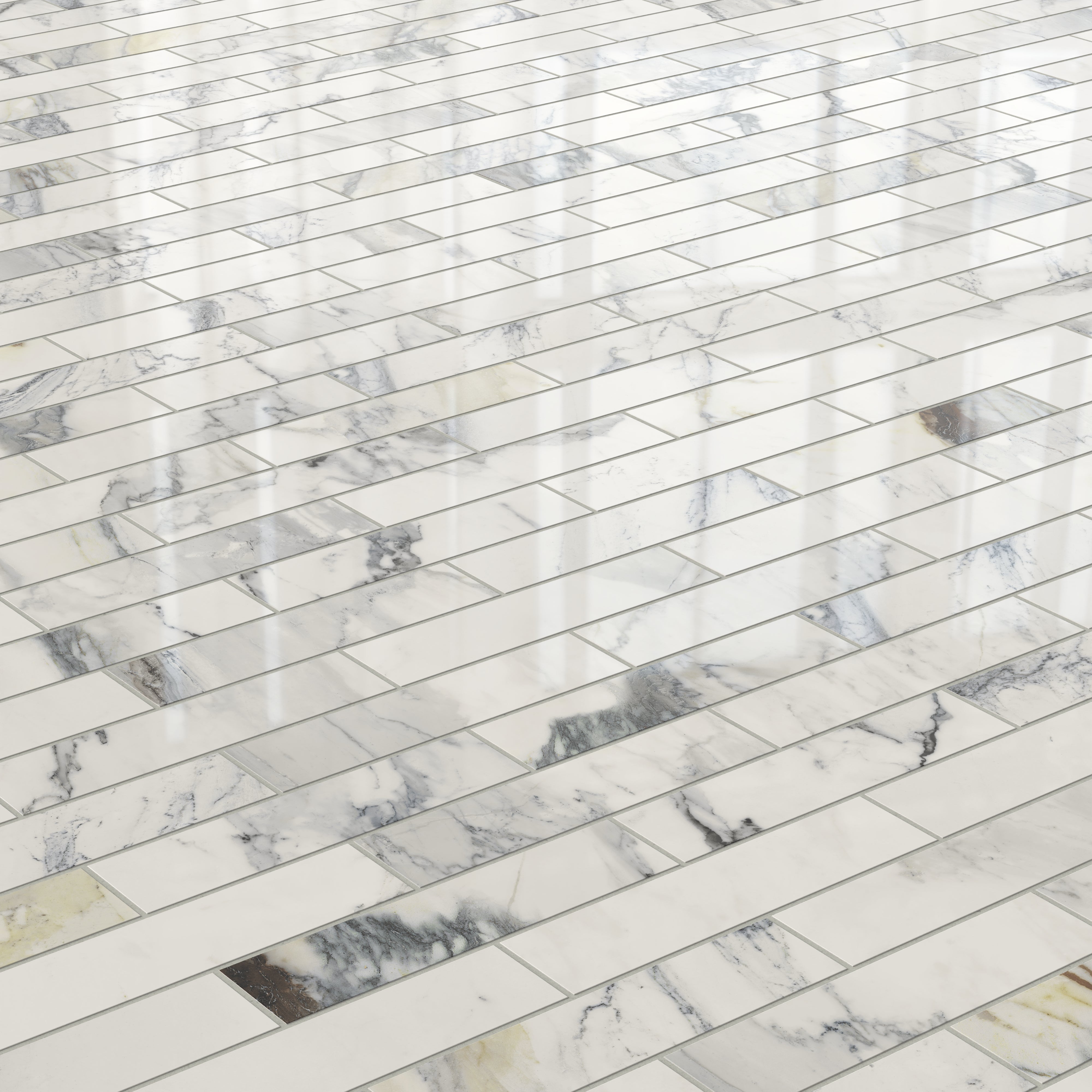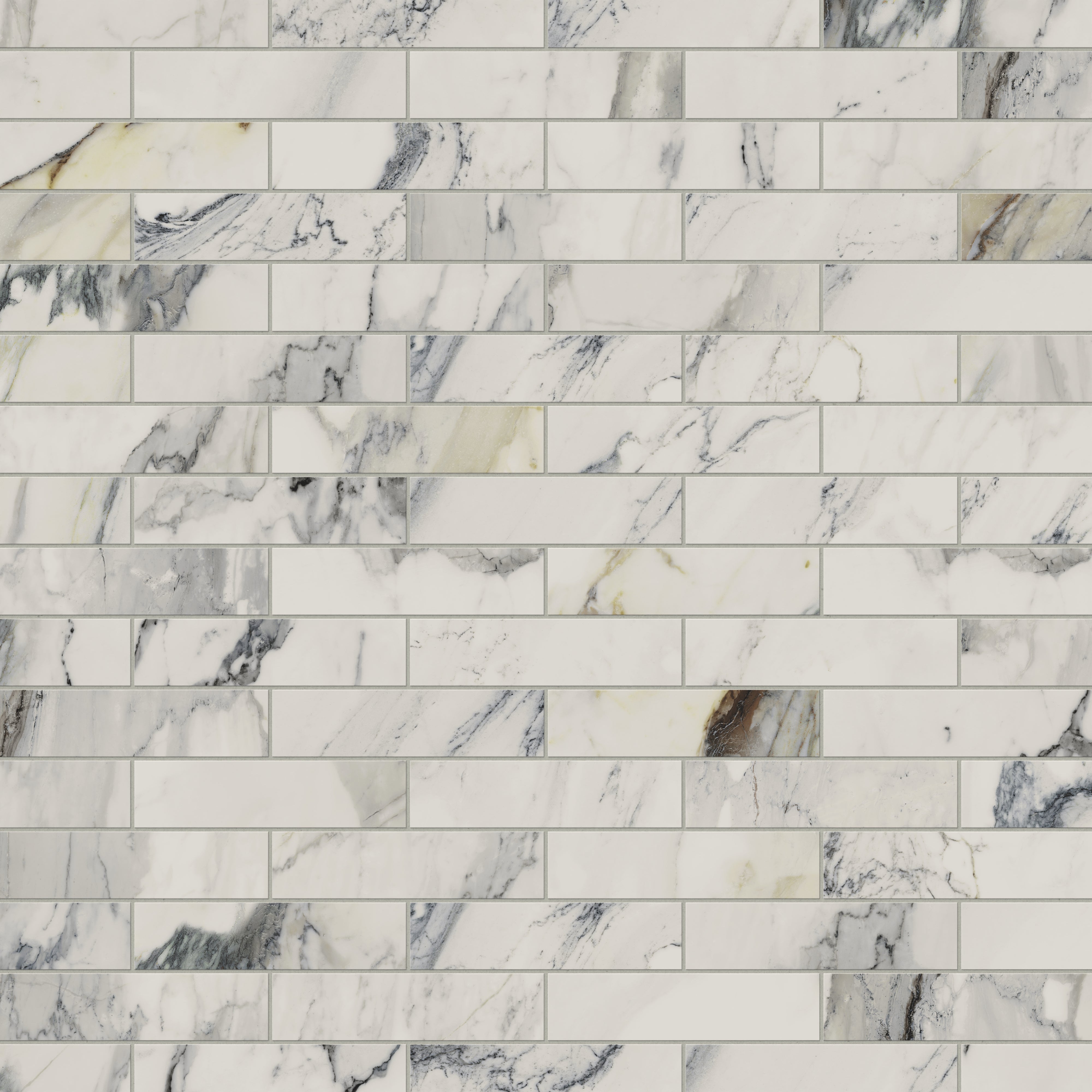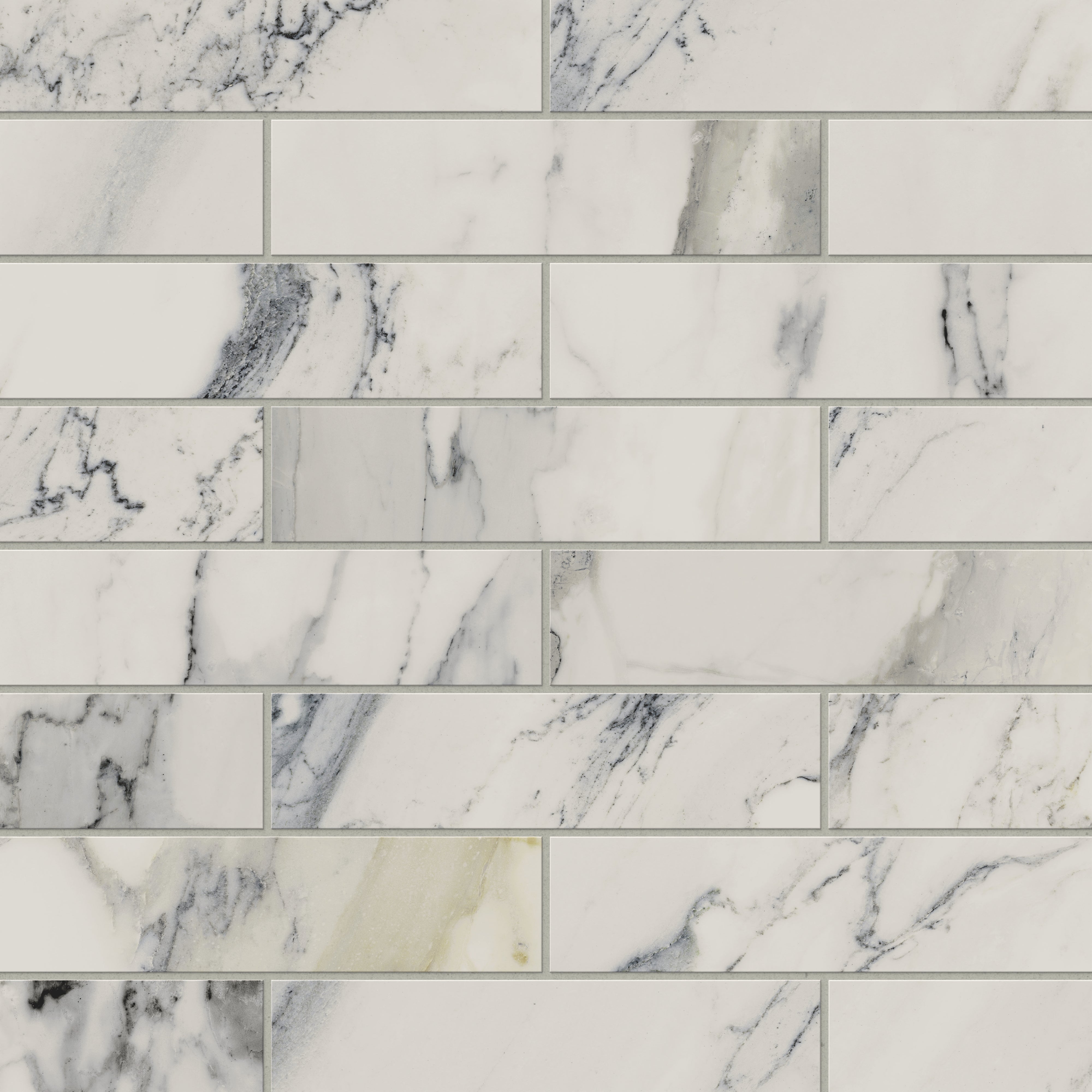 A tribute to marble’s most noble form, our Aniston 3x12 Polished Porcelain Tile in Calacatta Antico features delicate shades of silvery-gray and bluish streams that drift across an extended, white subway canvas. With a lustrous finish that reflects light like silk, it envelopes any space with a modern sense of grandeur that transcends time.