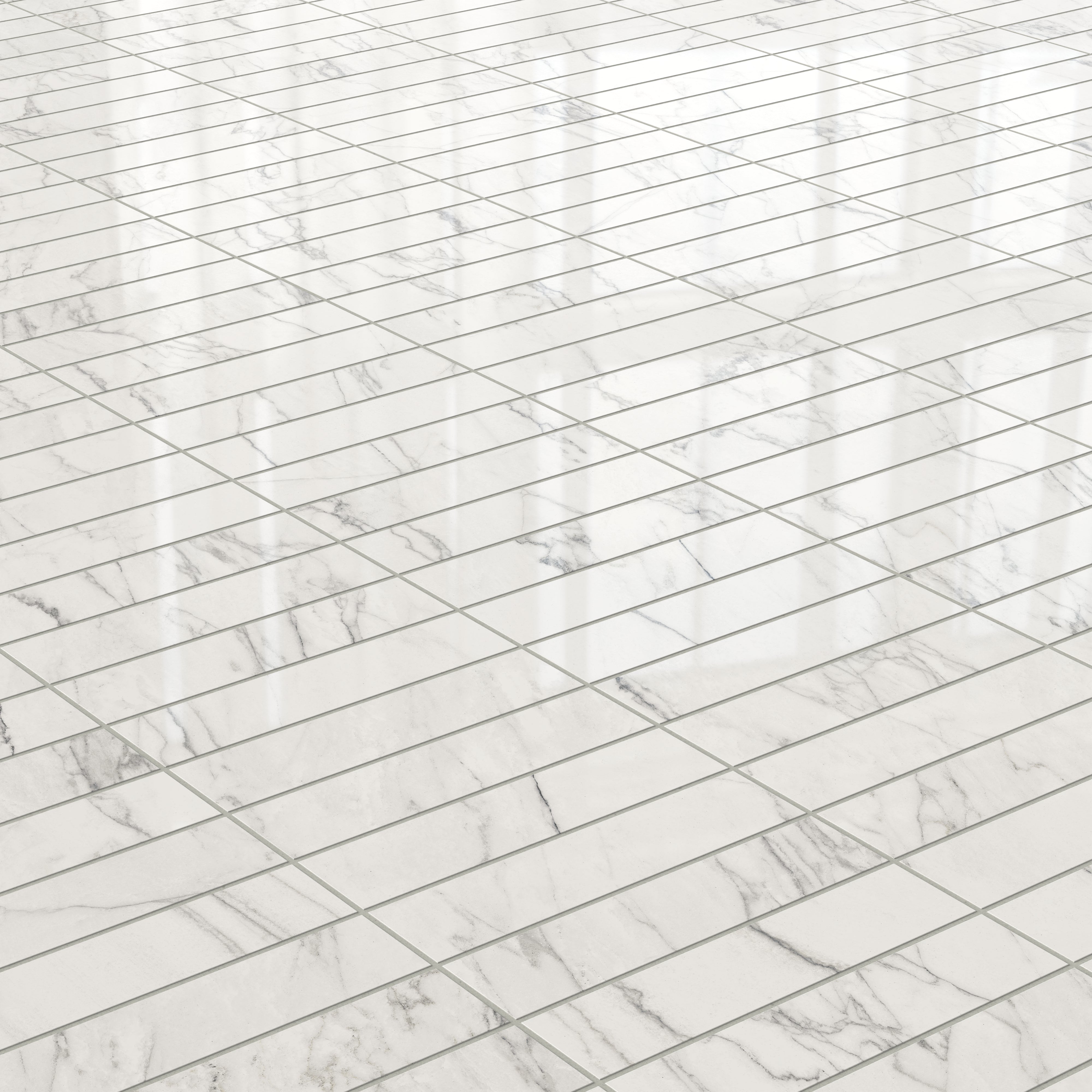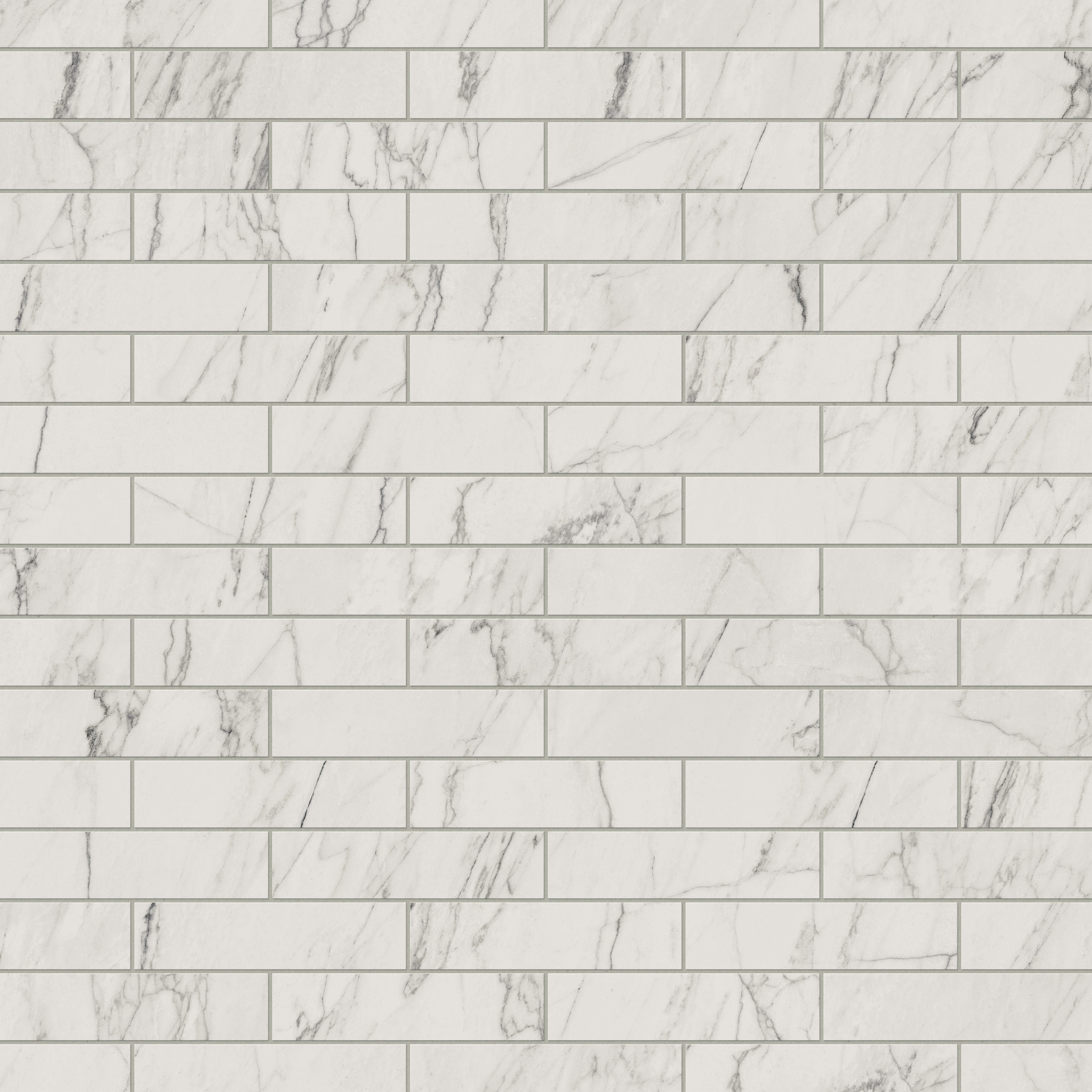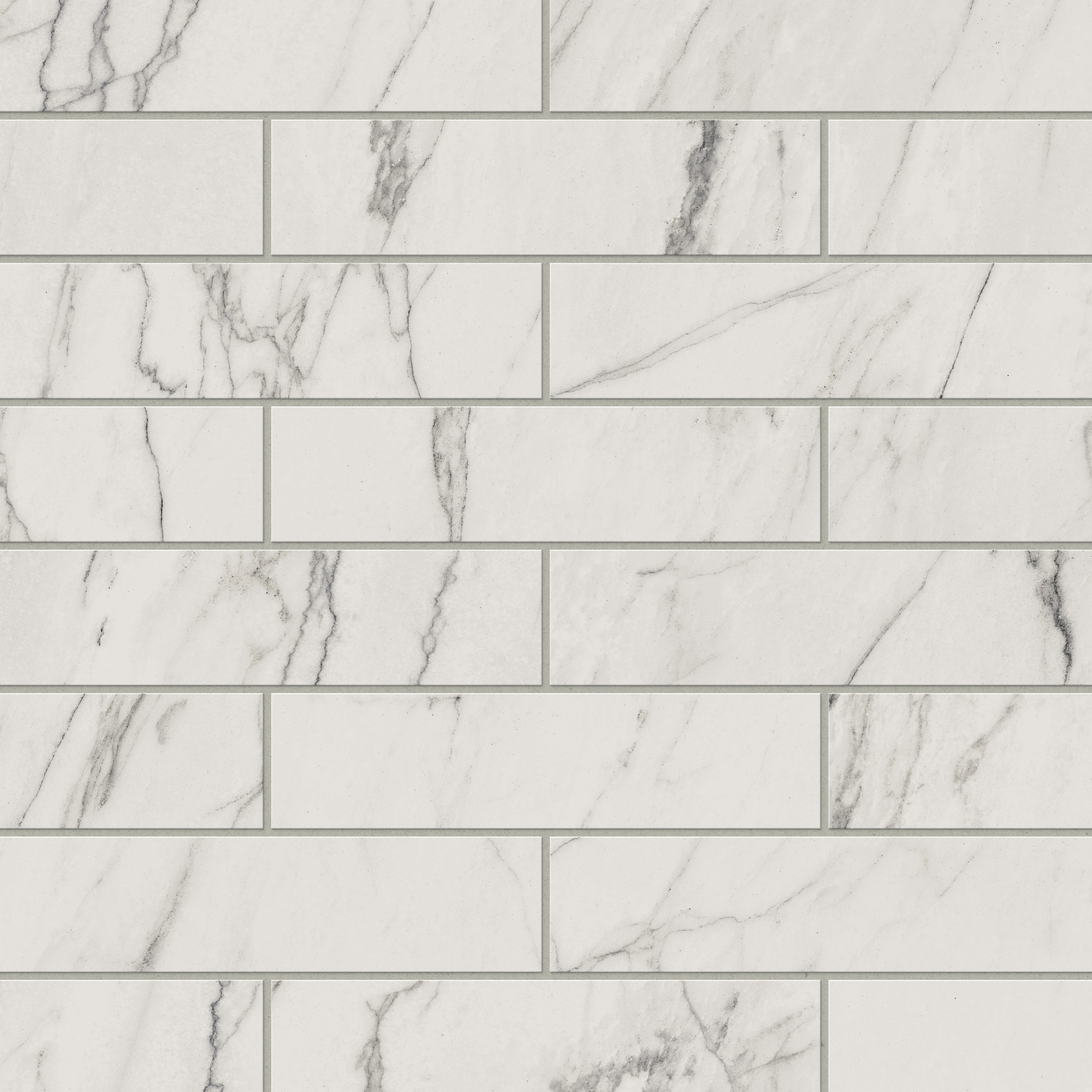 A tribute to marble’s most noble form, our Aniston 3x12 Polished Porcelain Tile in Calacatta Quarzite features linear veins of cool gray that drift across an extended, white subway canvas. With a lustrous finish that reflects light like silk, it envelopes any space with a modern sense of grandeur that transcends time.
