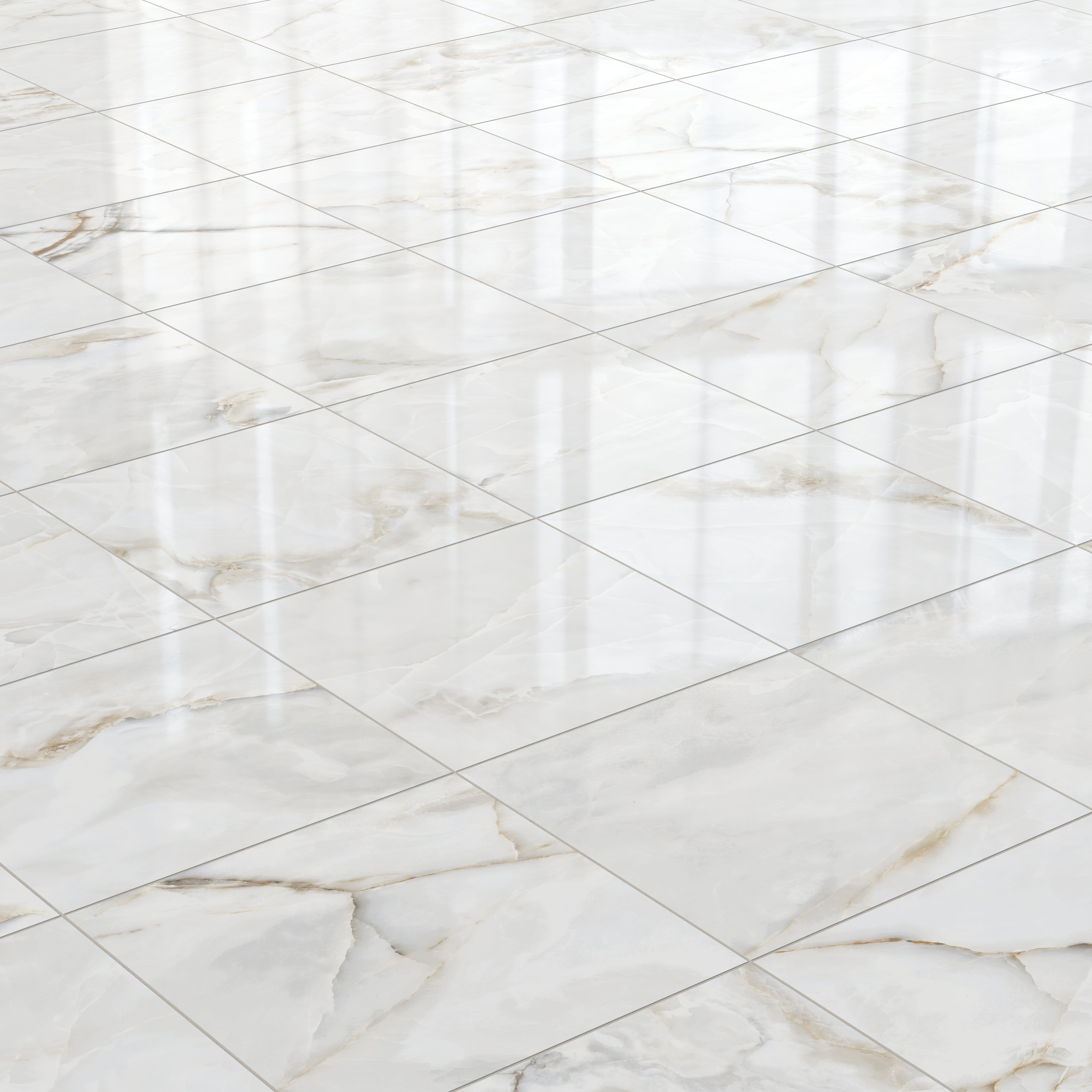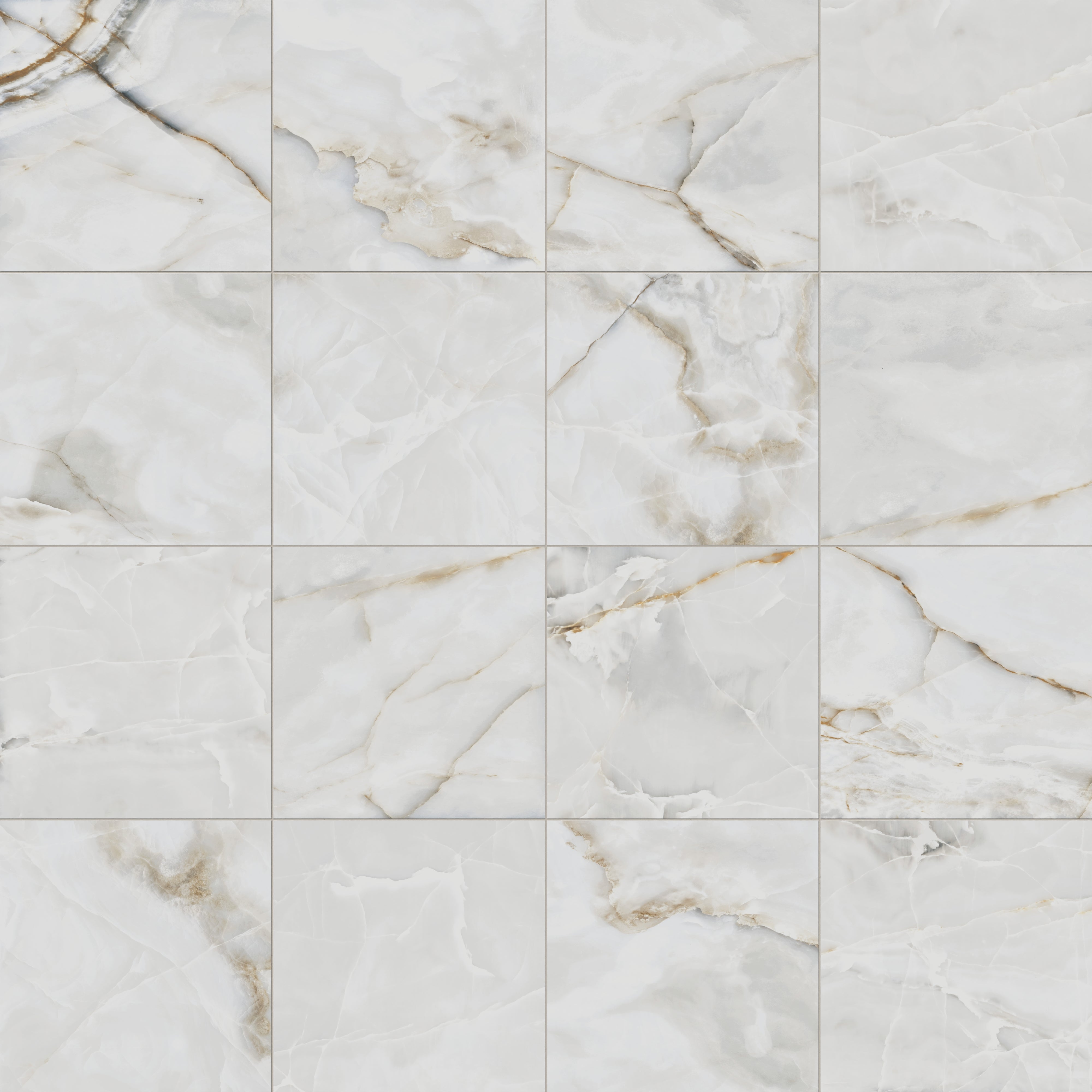 Prized for its ethereal beauty since Egypt’s second dynasty, onyx finds new life in our Astrid 24x24 Polished Porcelain Tile in Pearl—a modern expression of this revered gemstone. Each large square piece showcases delicate bands of gold and light gray veining flowing across an almost translucent white base, accentuated by a radiant finish that exudes modern glamour and elevates any interior.