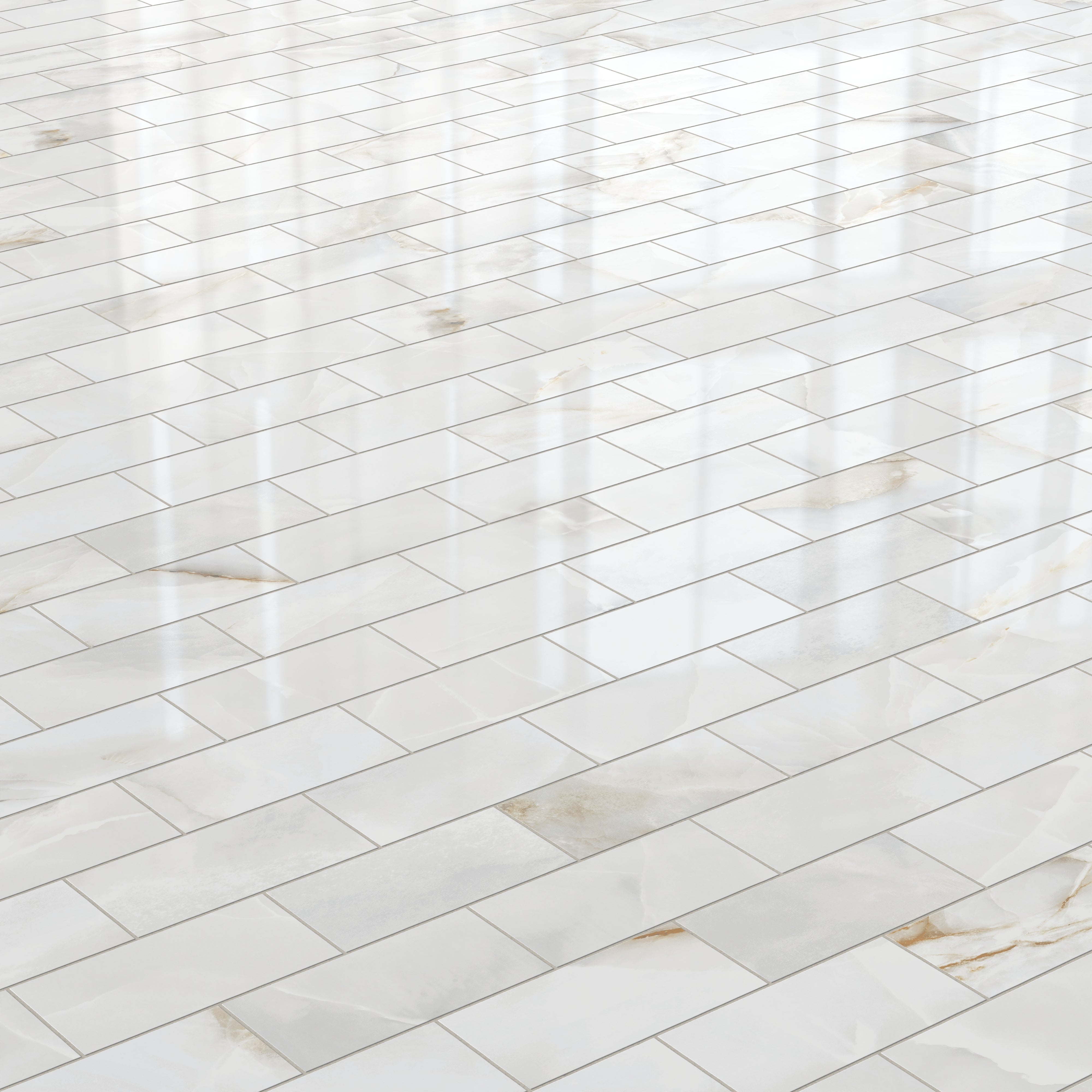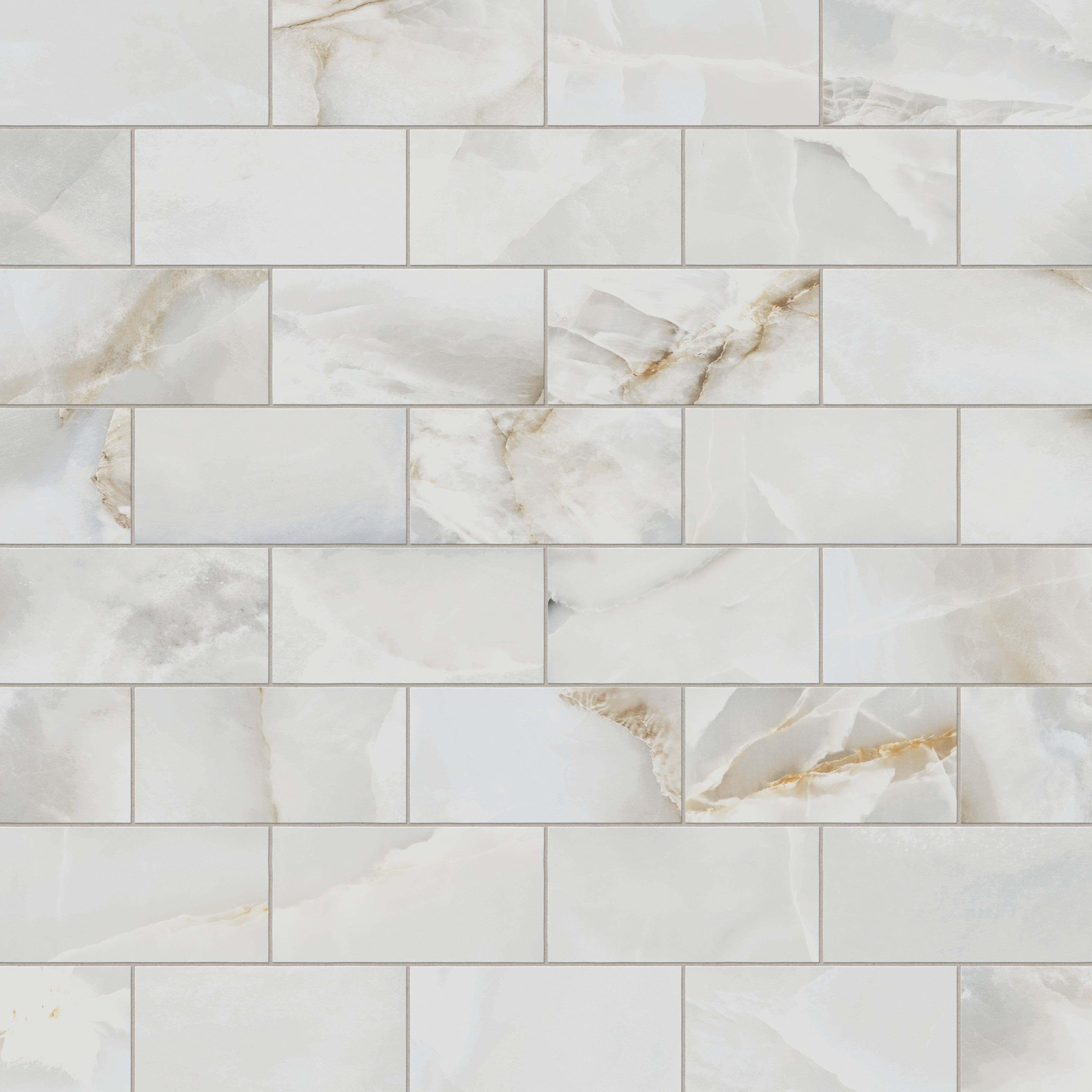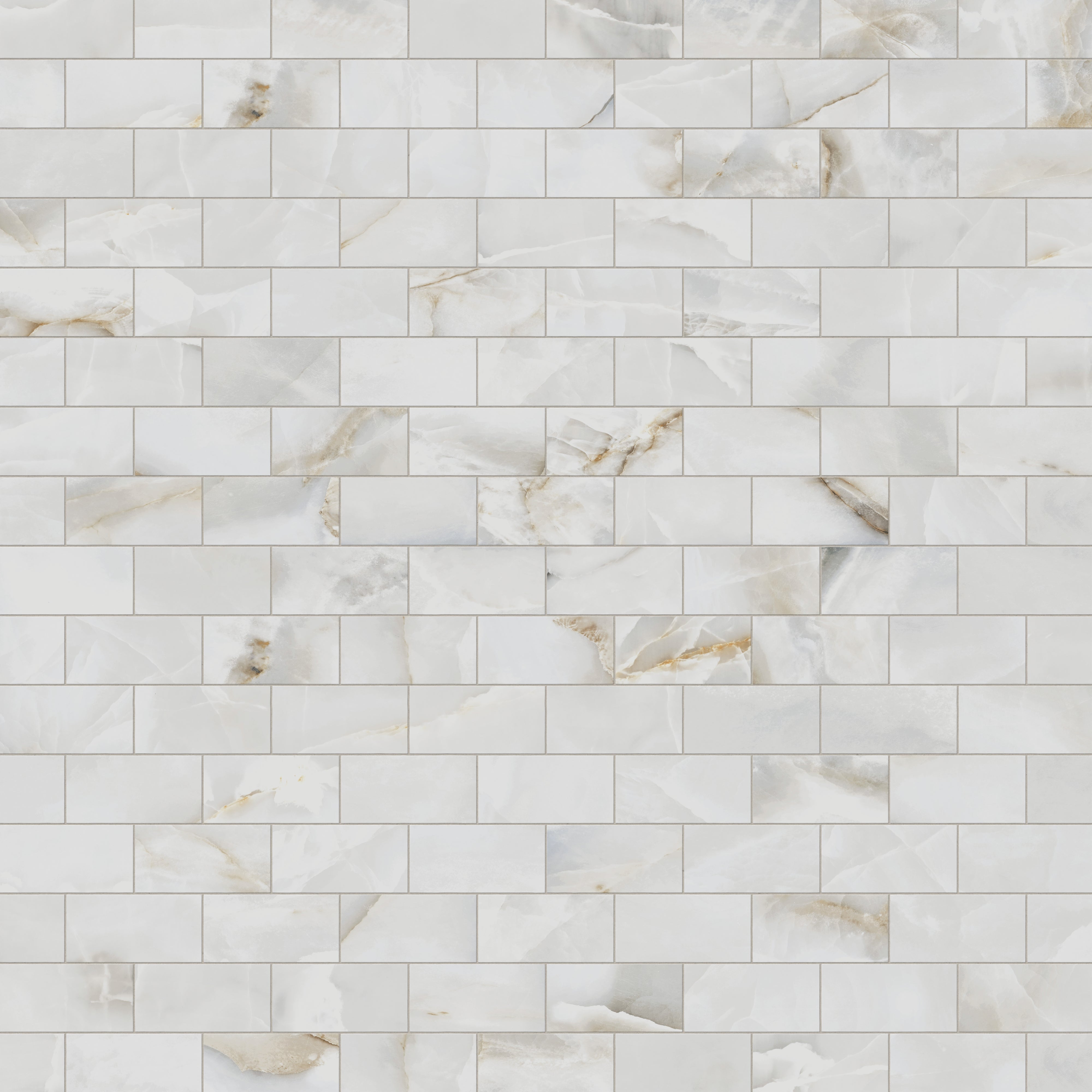 Prized for its ethereal beauty since Egypt’s second dynasty, onyx finds new life in our Astrid 3x6 Polished Porcelain Mosaic Tile in Pearl—a modern expression of this revered gemstone. Each subway-like piece, mesh-mounted in a staggered layout, showcases delicate bands of gold and light gray veining flowing across an almost translucent white base, accentuated by a radiant finish that exudes modern glamour and elevates any interior.