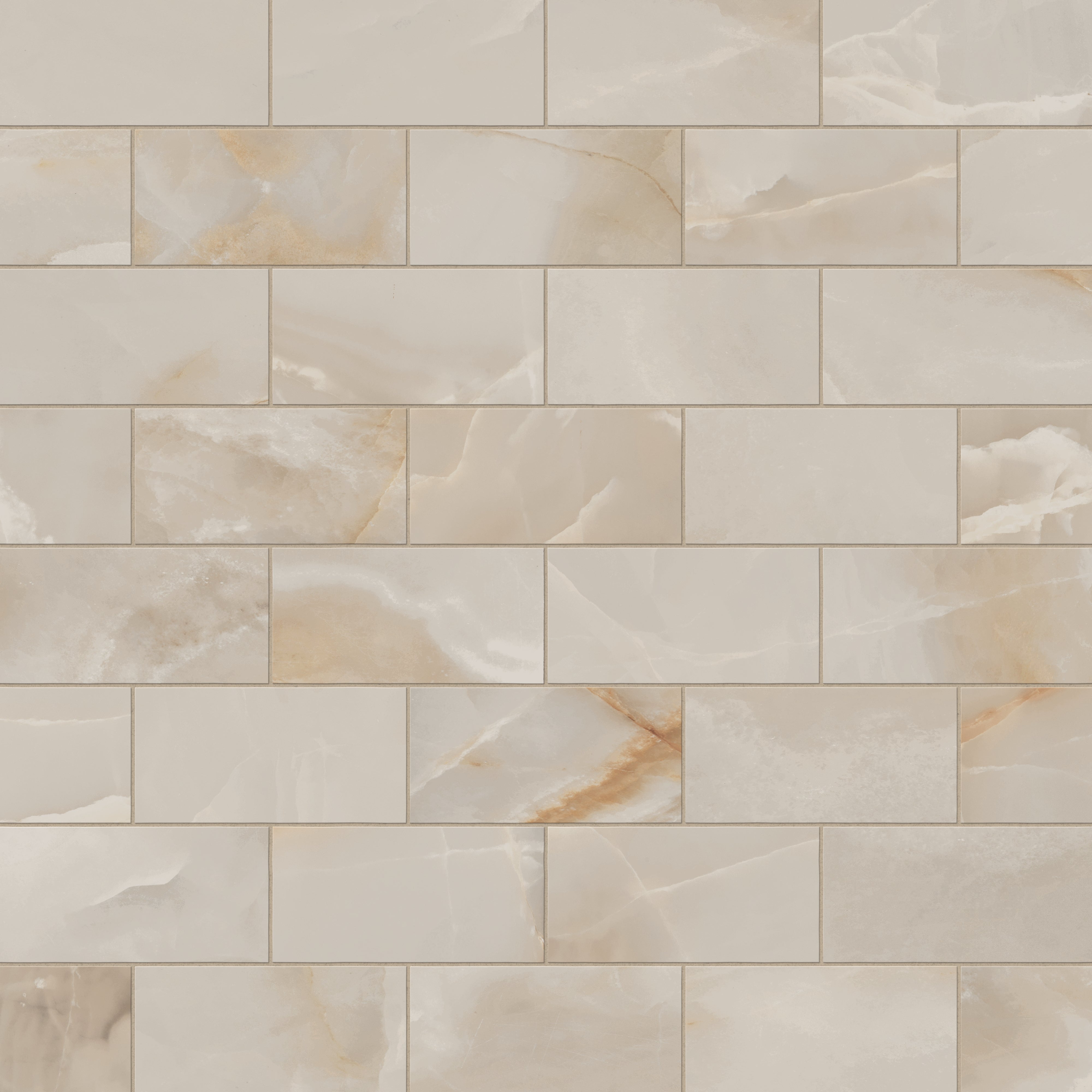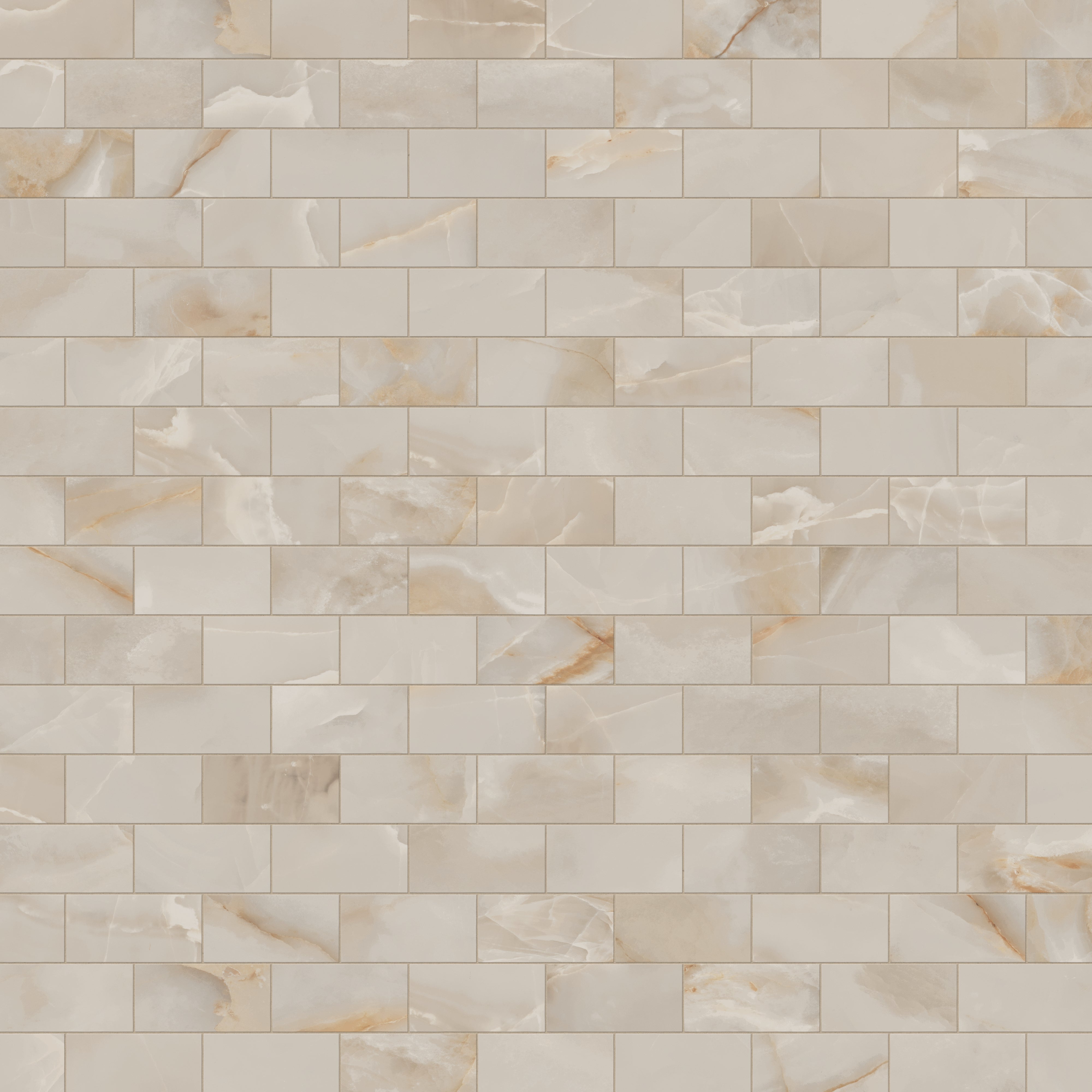 Prized for its ethereal beauty since Egypt’s second dynasty, onyx finds new life in our Astrid 3x6 Polished Porcelain Mosaic Tile in Sand—a modern expression of this revered gemstone. Each subway-like piece, mesh-mounted in a staggered layout, showcases delicate bands of gold and light gray veining flowing across an almost translucent beige base, accentuated by a radiant finish that exudes modern glamour and elevates any interior.