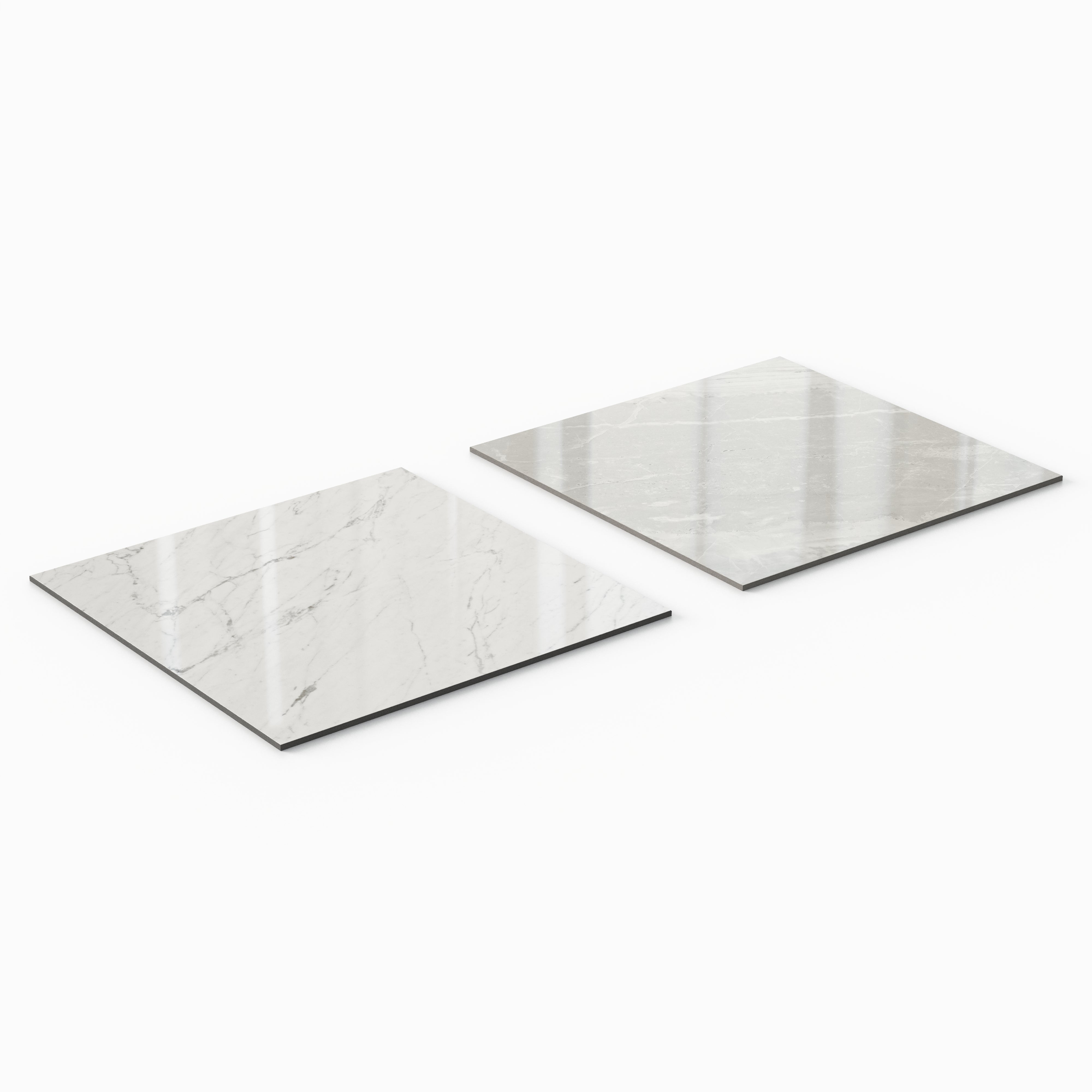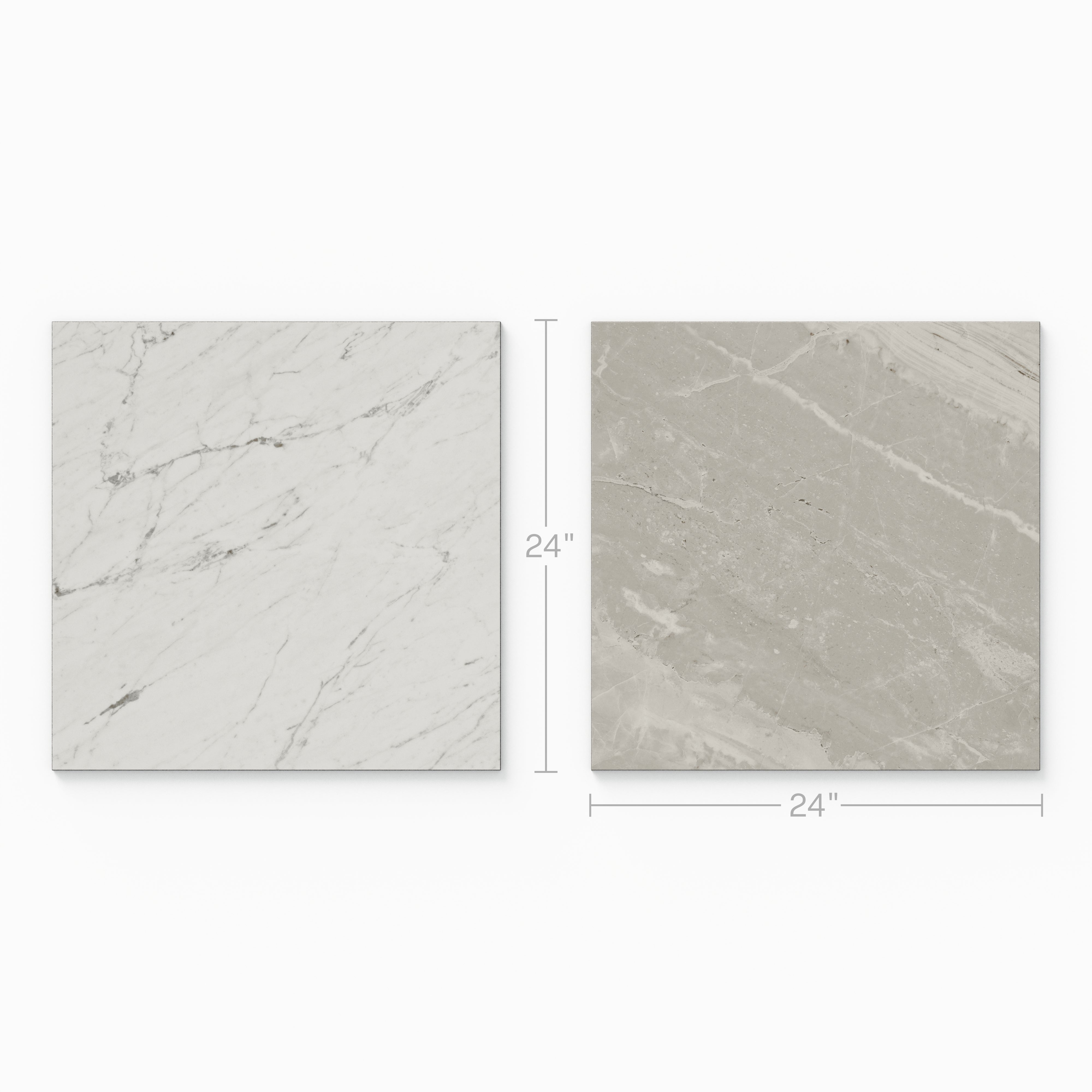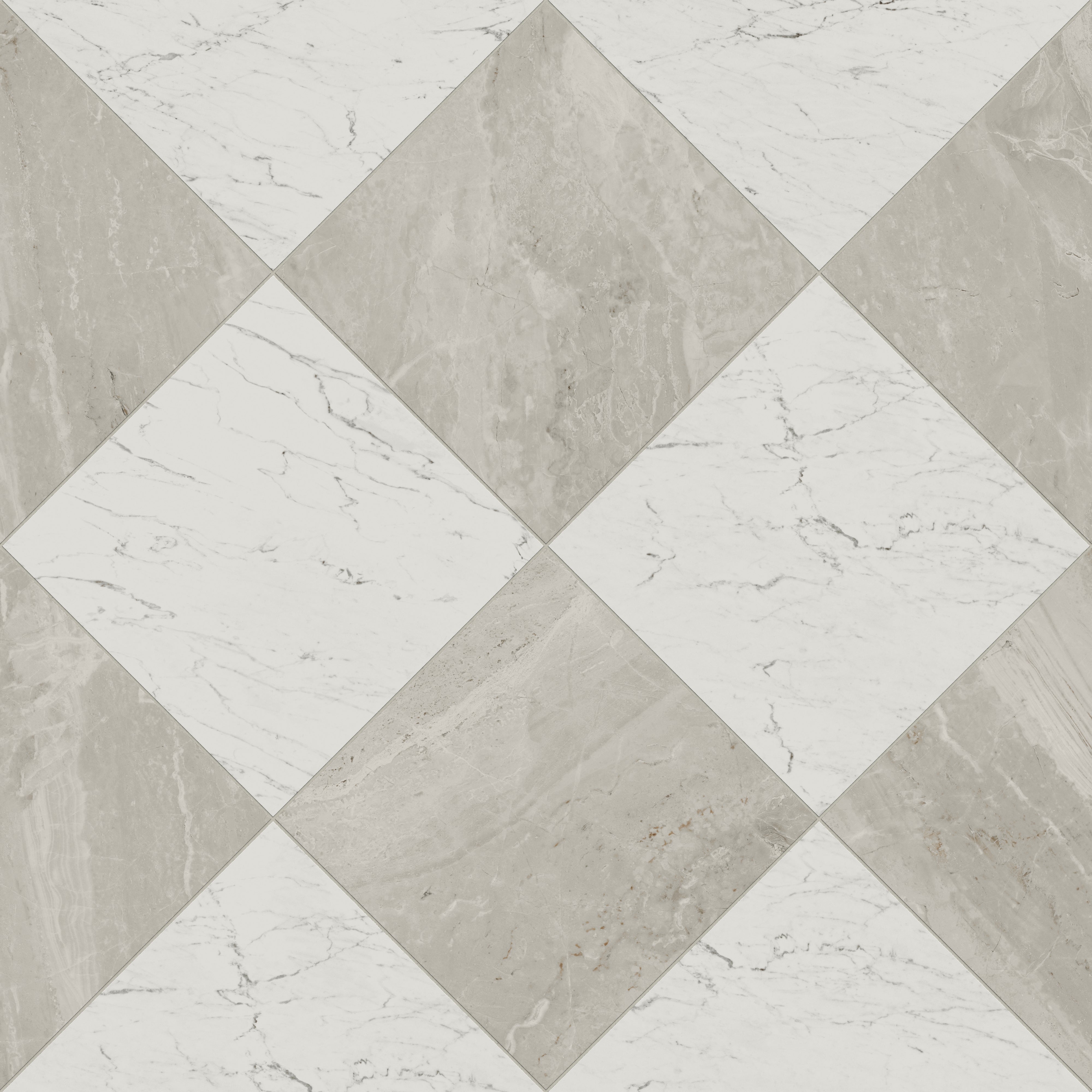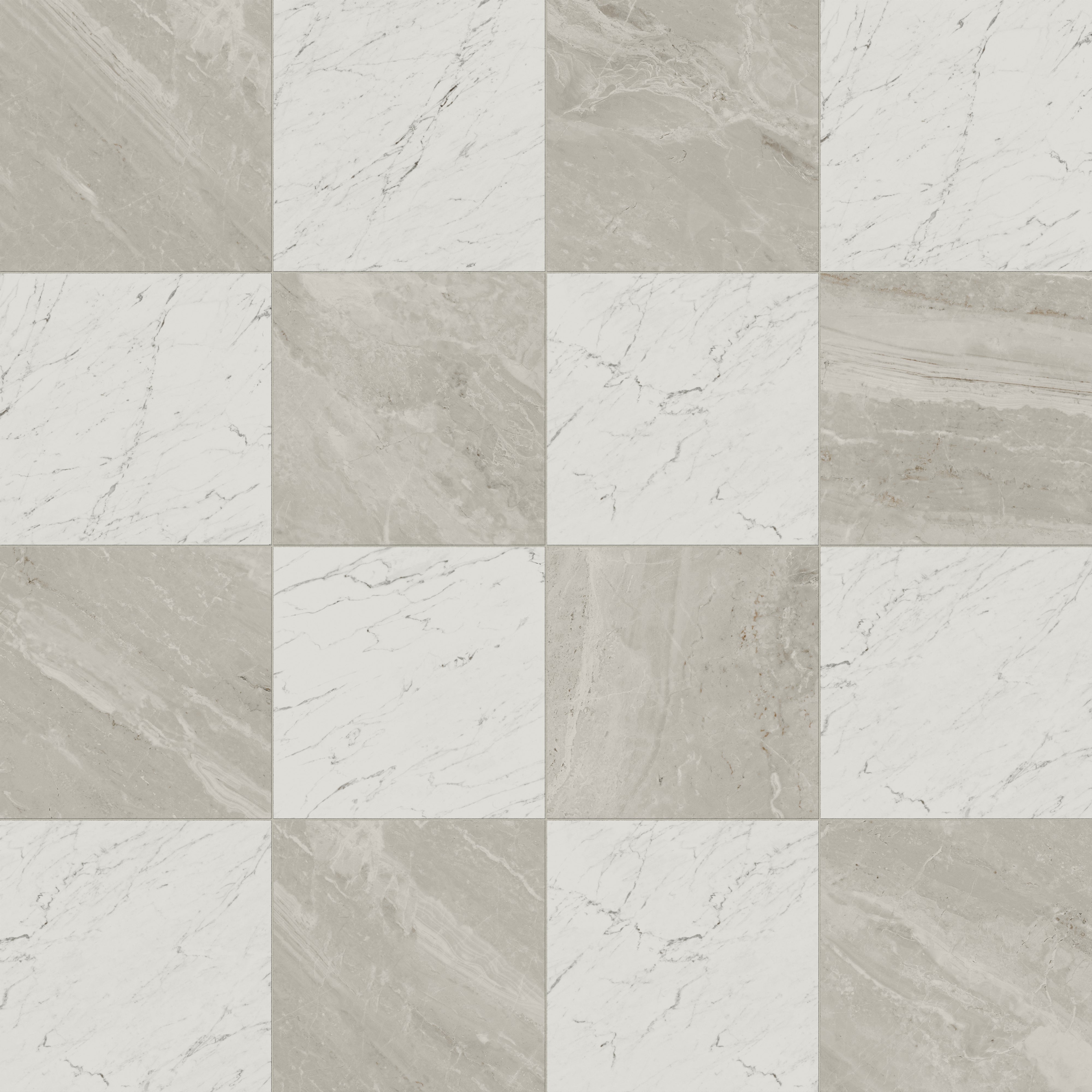 Our Blair 24x24 Checkerboard Polished Porcelain Tile in Oniciata Grey and White Carrara fuses the sophistication of timeless materials with a refined, modern scale, featuring large-format squares that alternate between two natural Oniciata stone looks—one in muted, mineral beige, the other in fine-lined white. The delicate veining also varies across each piece, capturing the layered depth of this opulent marble to enhance its sense of movement and authenticity.