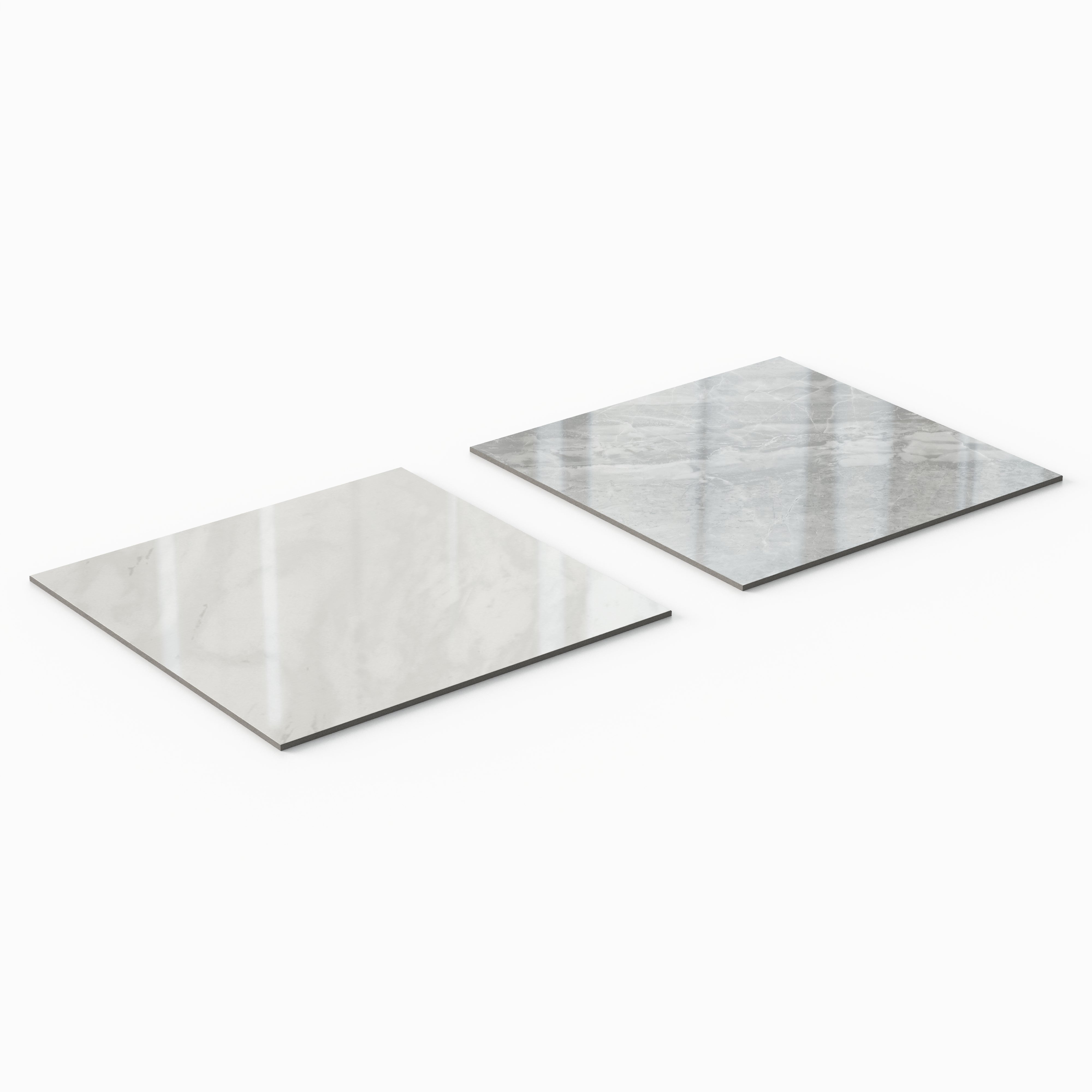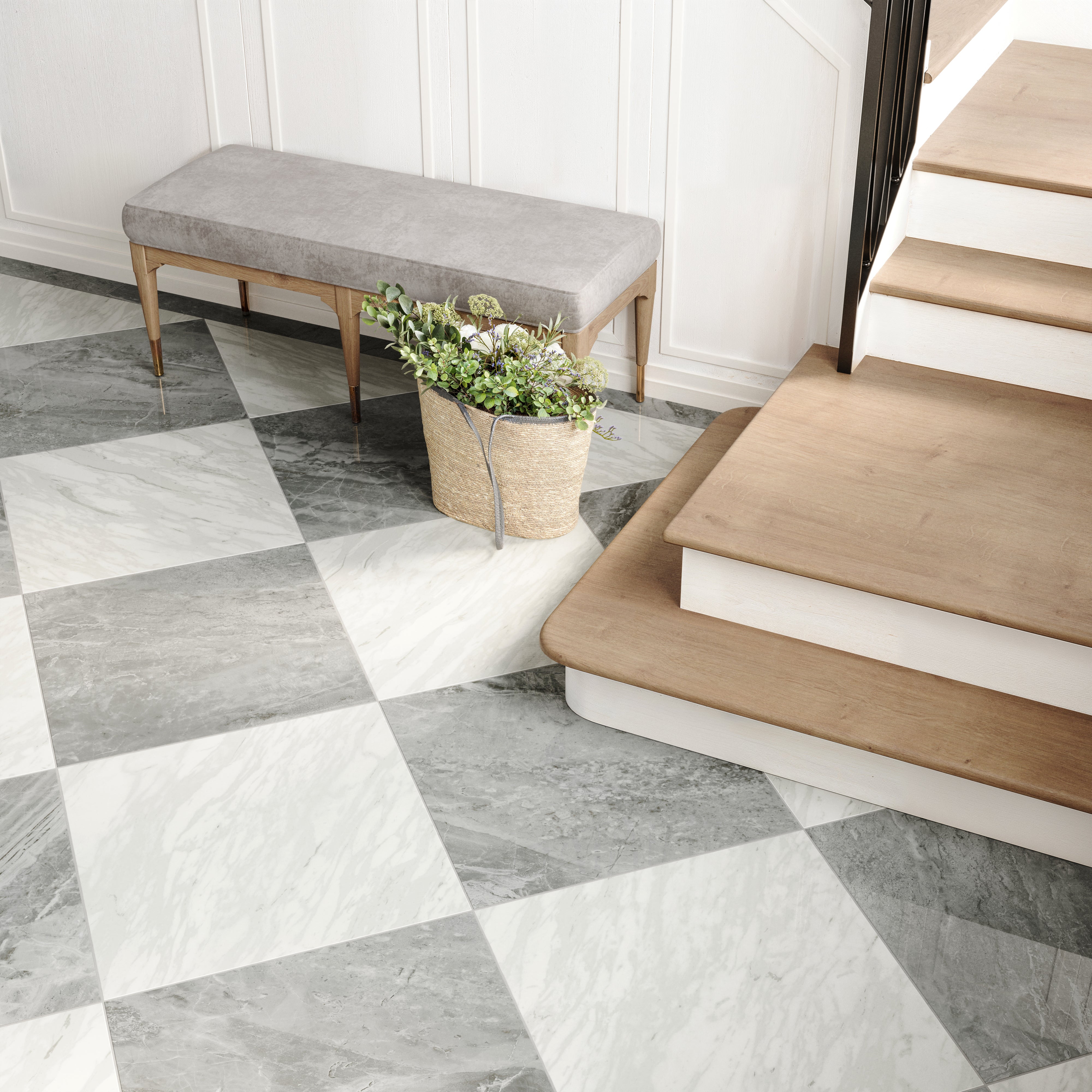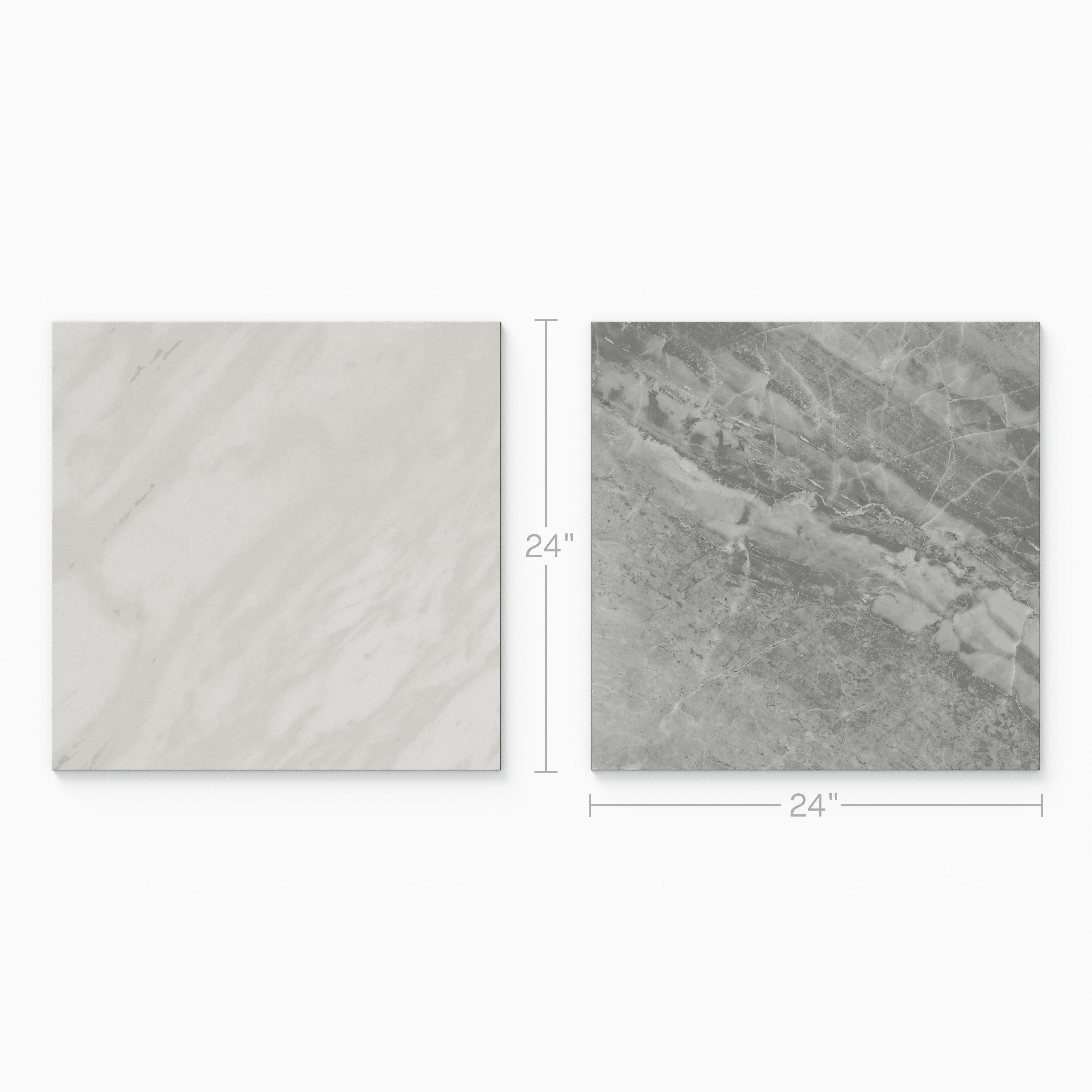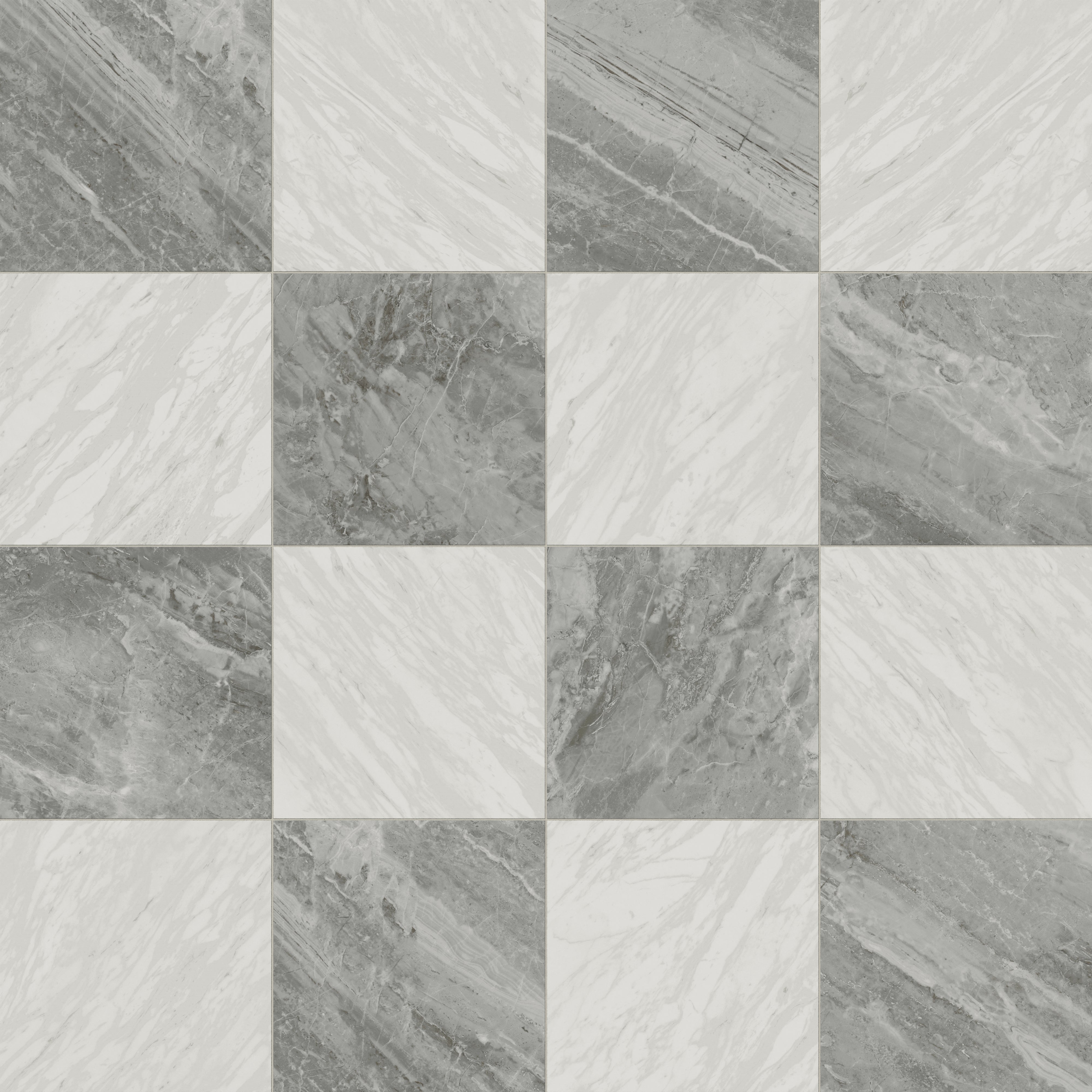 Our Blair 24x24 Checkerboard Polished Porcelain Tile in Oniciata Grey and Volakas White fuses the sophistication of timeless materials with a refined, modern scale, featuring large-format squares that alternate between two natural Oniciata stone looks—one in cool, earthen grey, the other in gray-tinted white. The delicate veining also varies across each piece, capturing the layered depth of this opulent marble to enhance its sense of movement and authenticity.