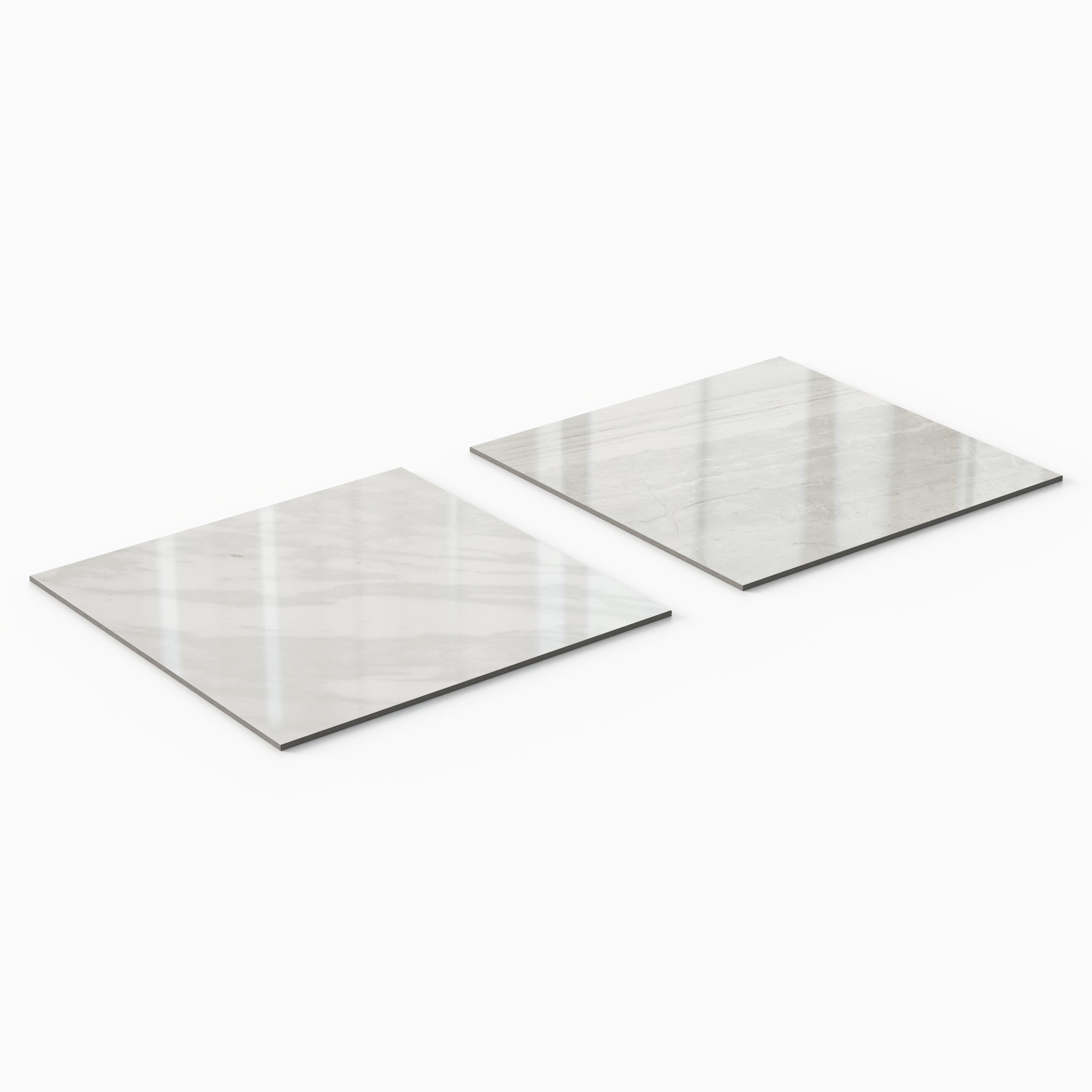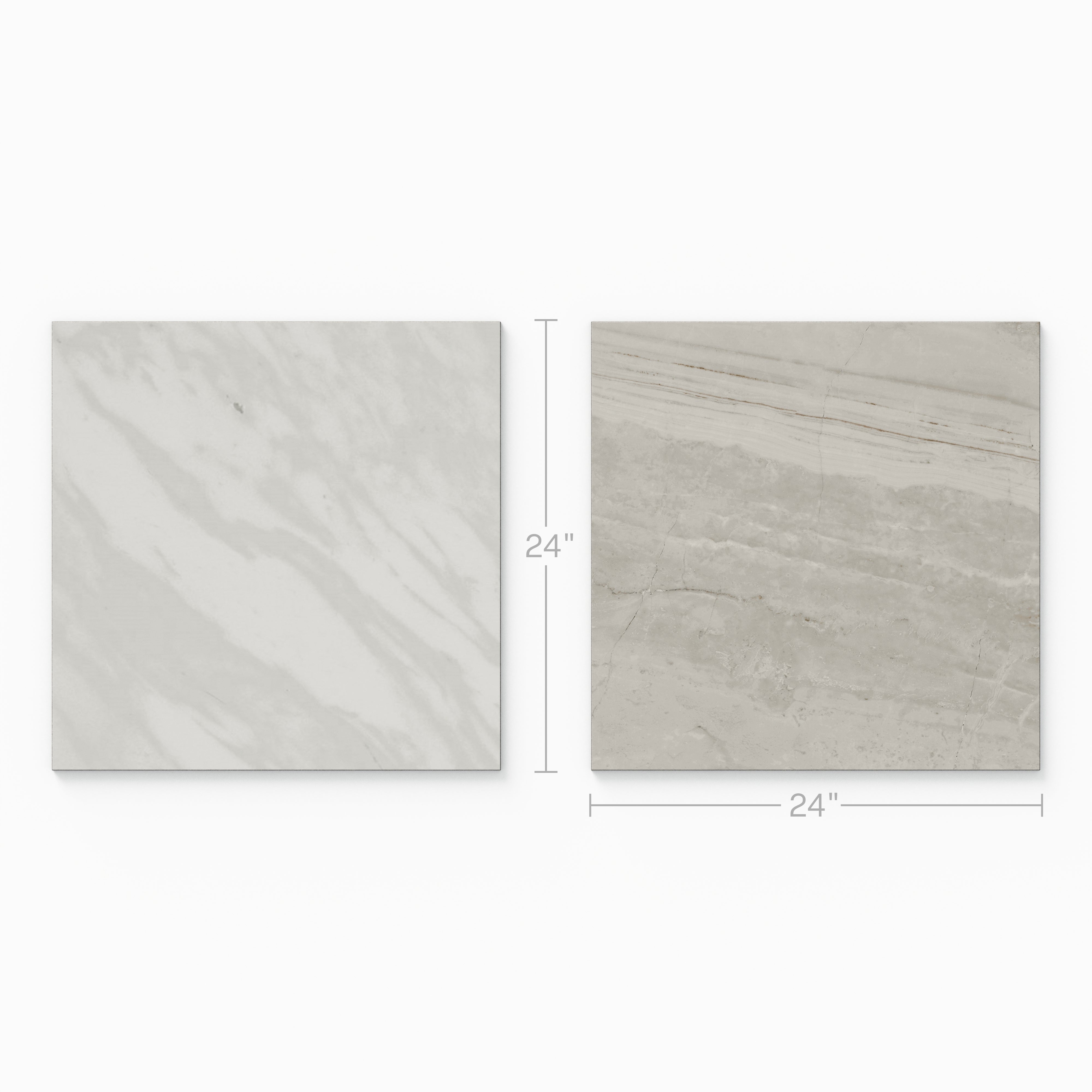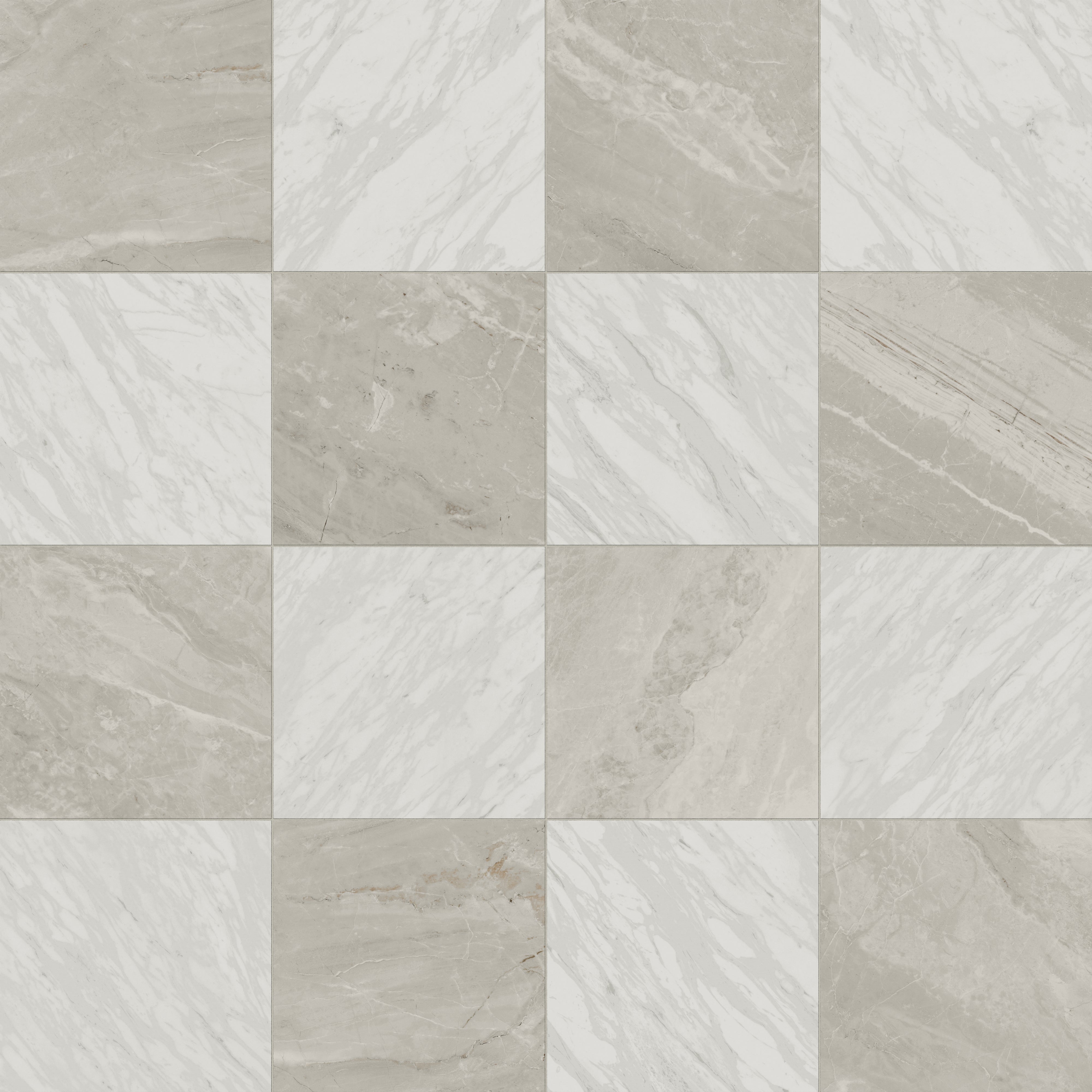 Our Blair 24x24 Checkerboard Polished Porcelain Tile in Volakas White and Oniciata Beige fuses the sophistication of timeless materials with a refined, modern scale, featuring large-format squares that alternate between two natural Oniciata stone looks—one in gray-tinted white, the other in muted, mineral beige. The delicate veining also varies across each piece, capturing the layered depth of this opulent marble to enhance its sense of movement and authenticity.