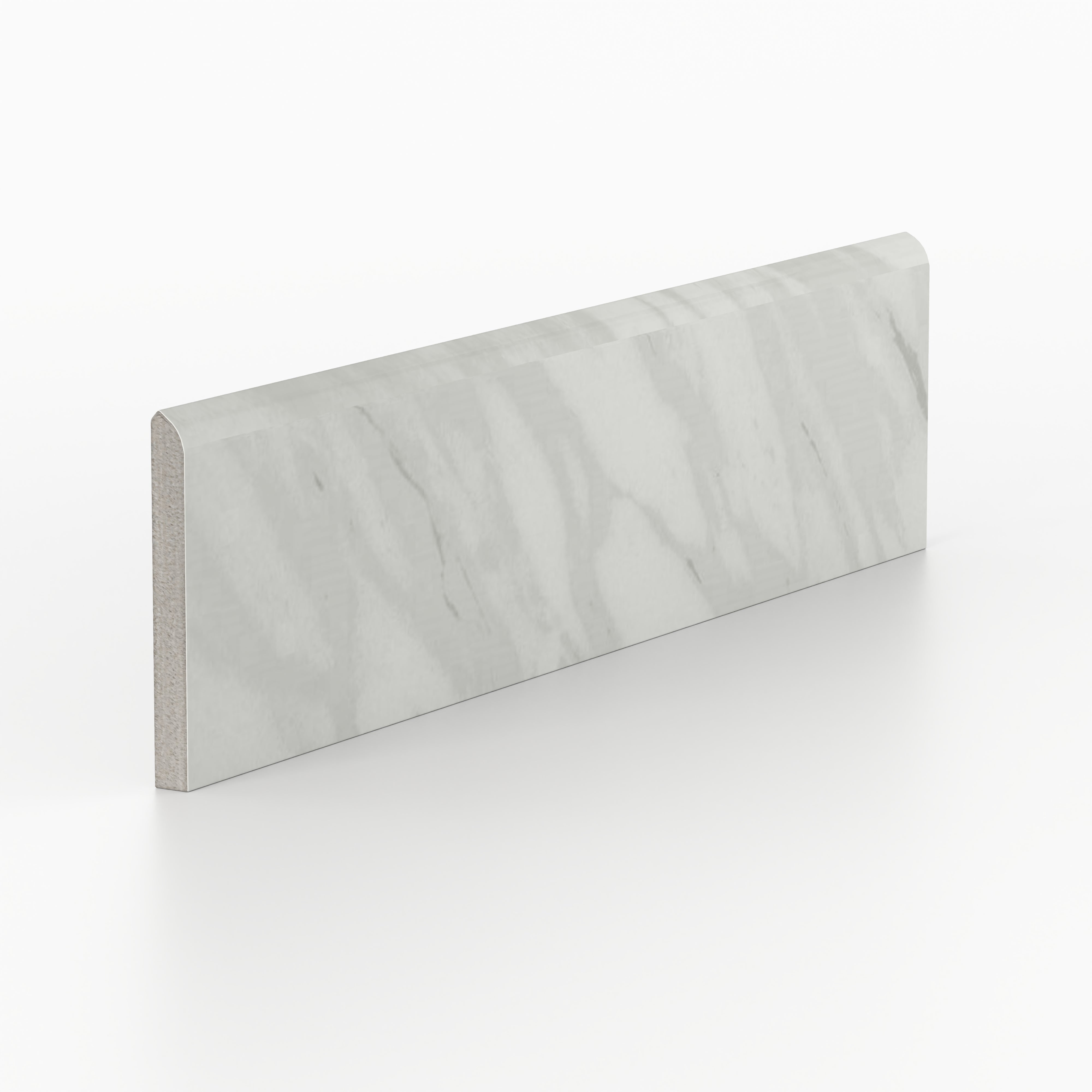 Our Blair 3x12 Polished Porcelain Bullnose Tile in Volakas White completes the collection with the same sophisticated Volakas stone look in gray-tinted white. Featuring a delicate, naturally varied veining and a lustrous glaze, this finishing piece ensures a cohesive edge treatment for shower surrounds, backsplashes, and transitional details.