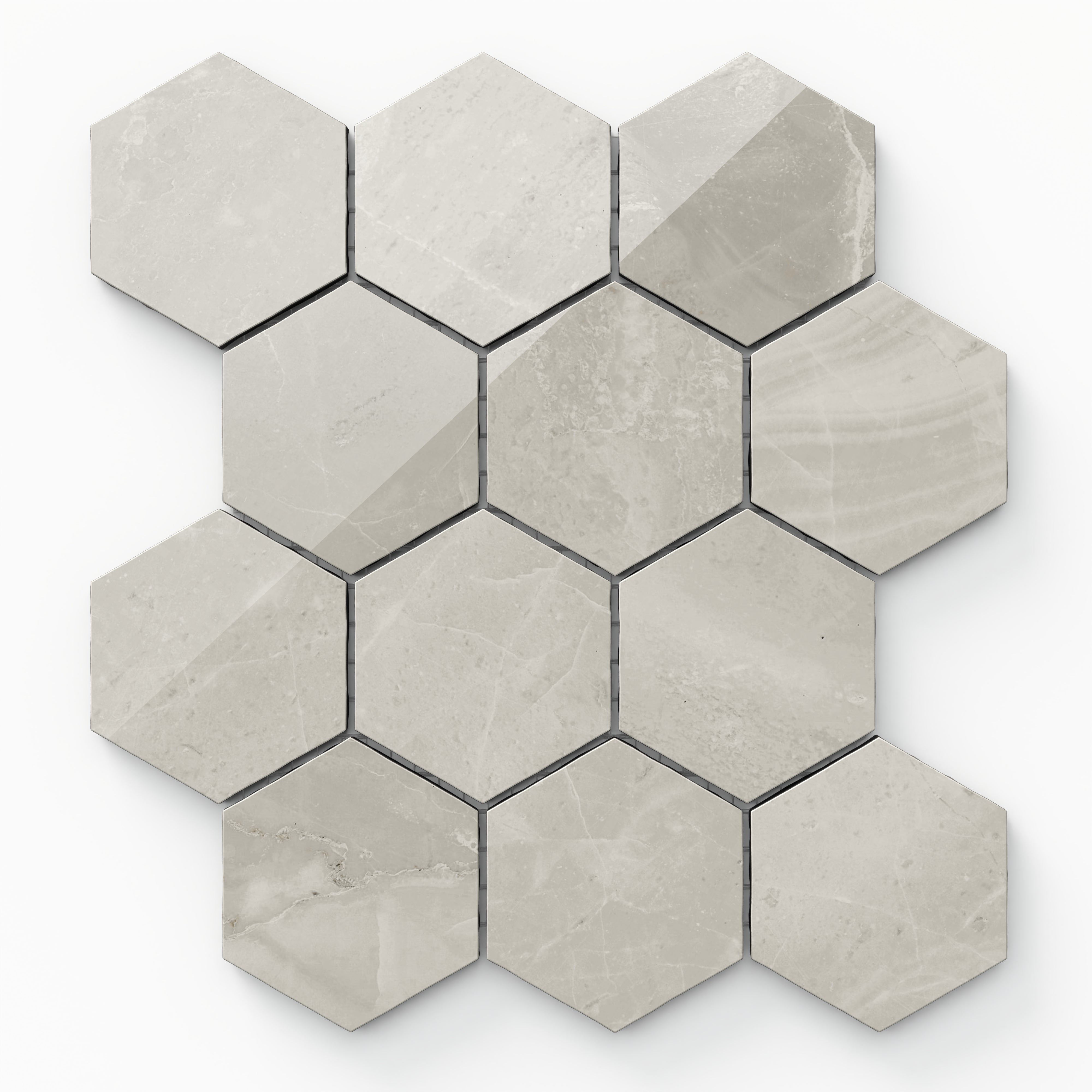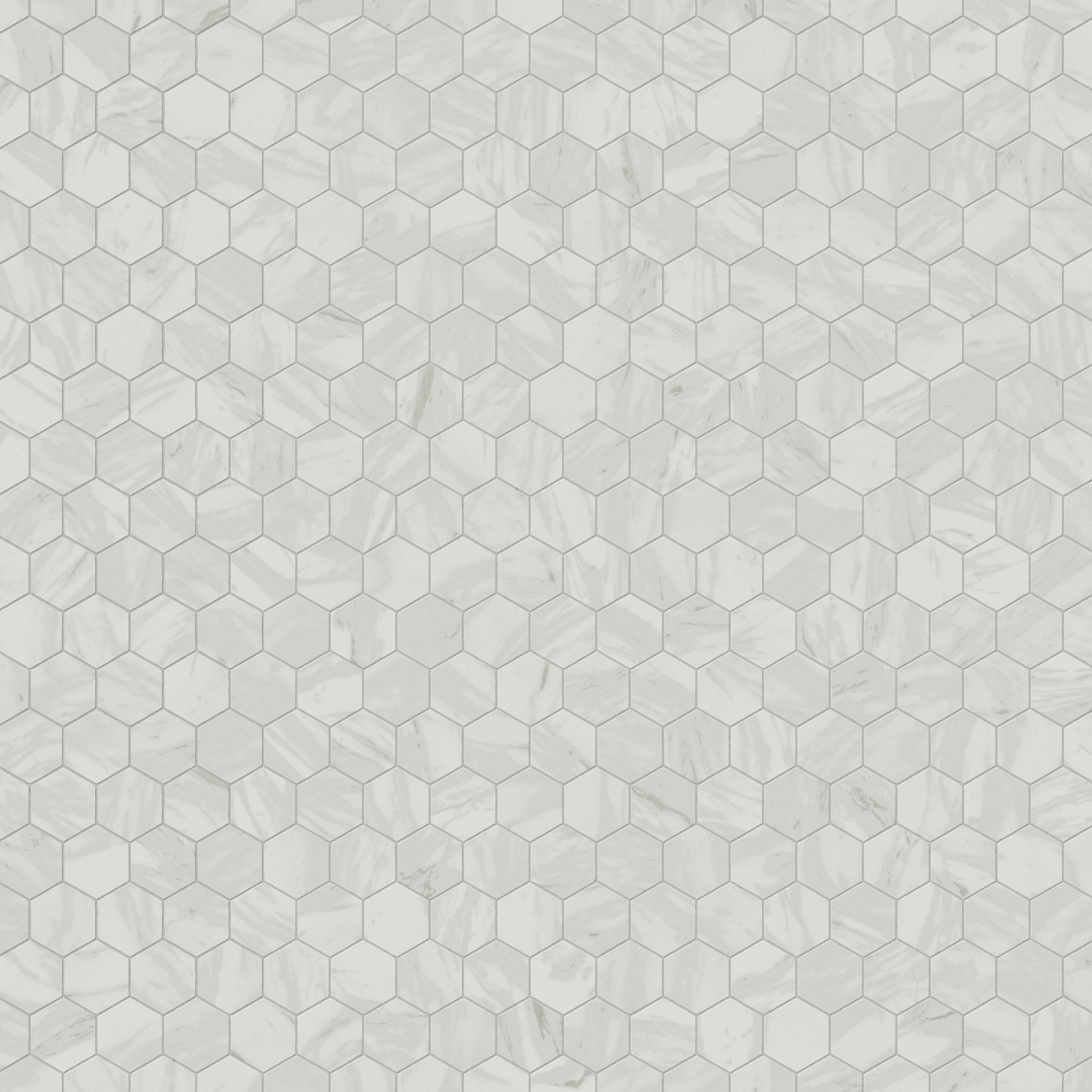 Our Blair 3x3 Polished Porcelain Hexagon Mosaic Tile in Volakas White fuses the sophistication of timeless materials with a refined, modern scale, featuring a mesh-mounted honeycomb pattern that mimics a natural Volakas stone look in gray-tinted white. The delicate veining also varies across each lustrous piece, capturing the layered depth of this opulent marble to enhance its sense of movement and authenticity.