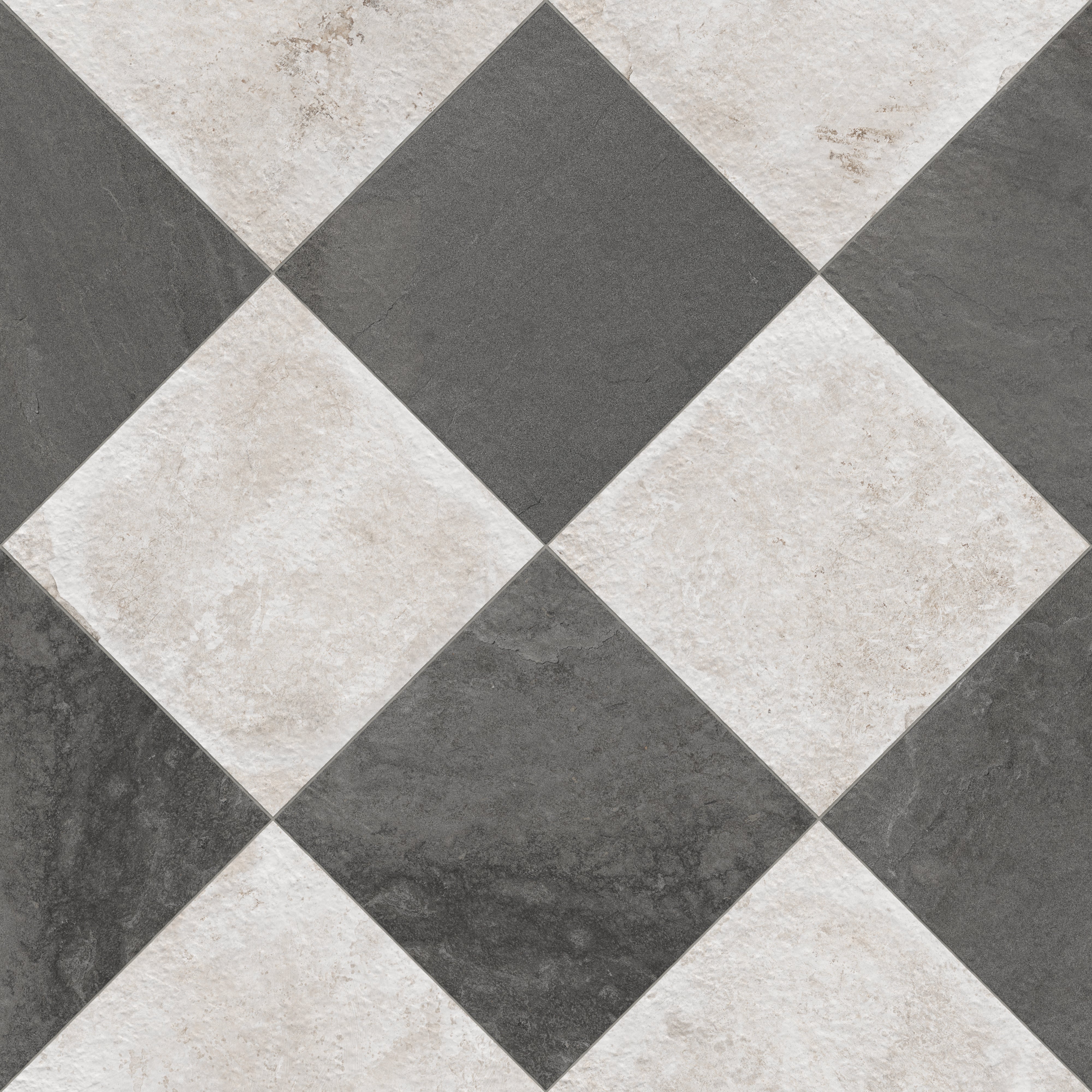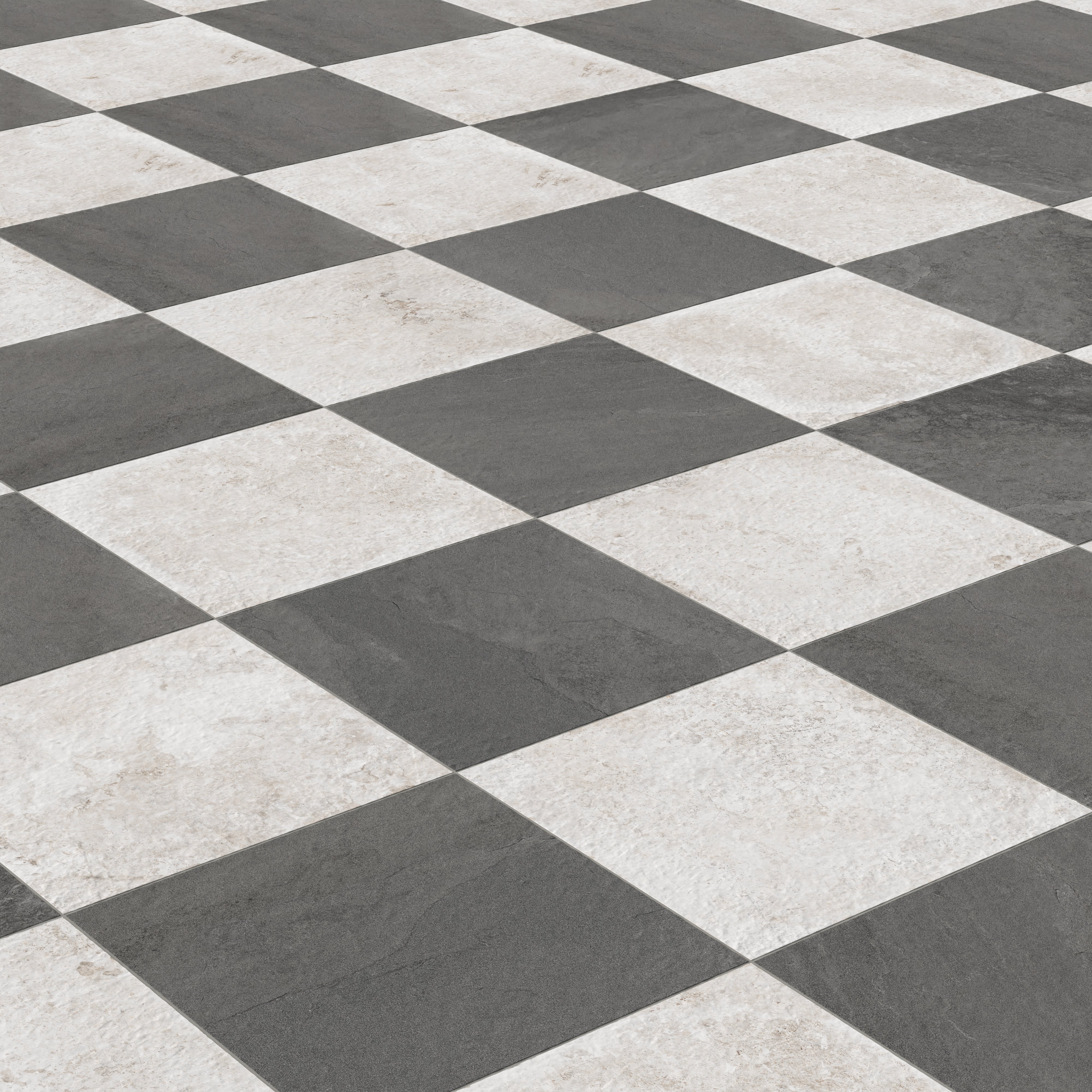 - Stone-look porcelain pairs for a low-maintenance checkered layout