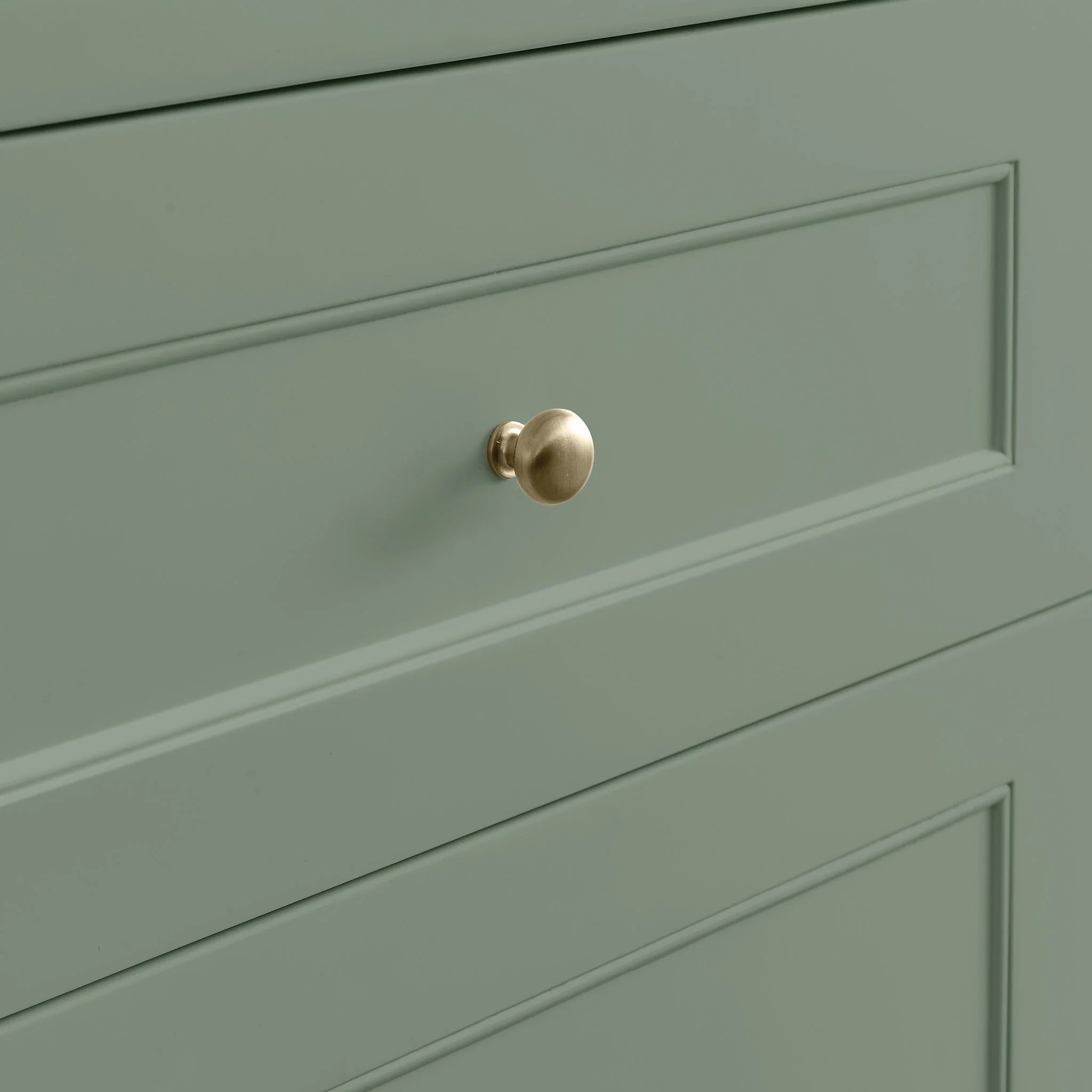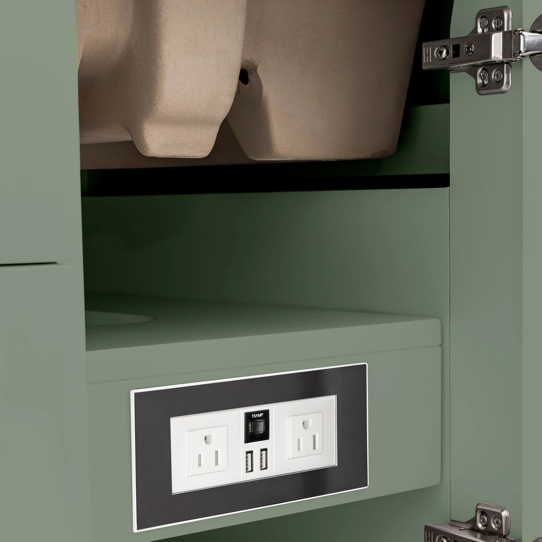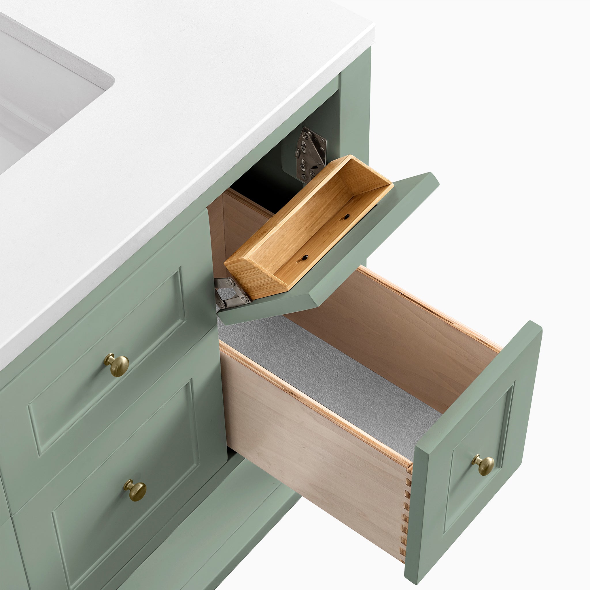 A modern update on the traditional Mission style furniture, our Bridgette 36" Single Vanity in Smokey Celadon with 3 cm White Zeus Quartz Top features framed panels and a rich light green hue that fits seamlessly in transitional and modern farmhouse bathrooms. Thoughtfully designed storage includes a single-door cabinet with built-in power and USB outlet, 2 tip-out and full-extension drawers, and an open shelf at the base, offering both concealed and display-ready space for your essentials.