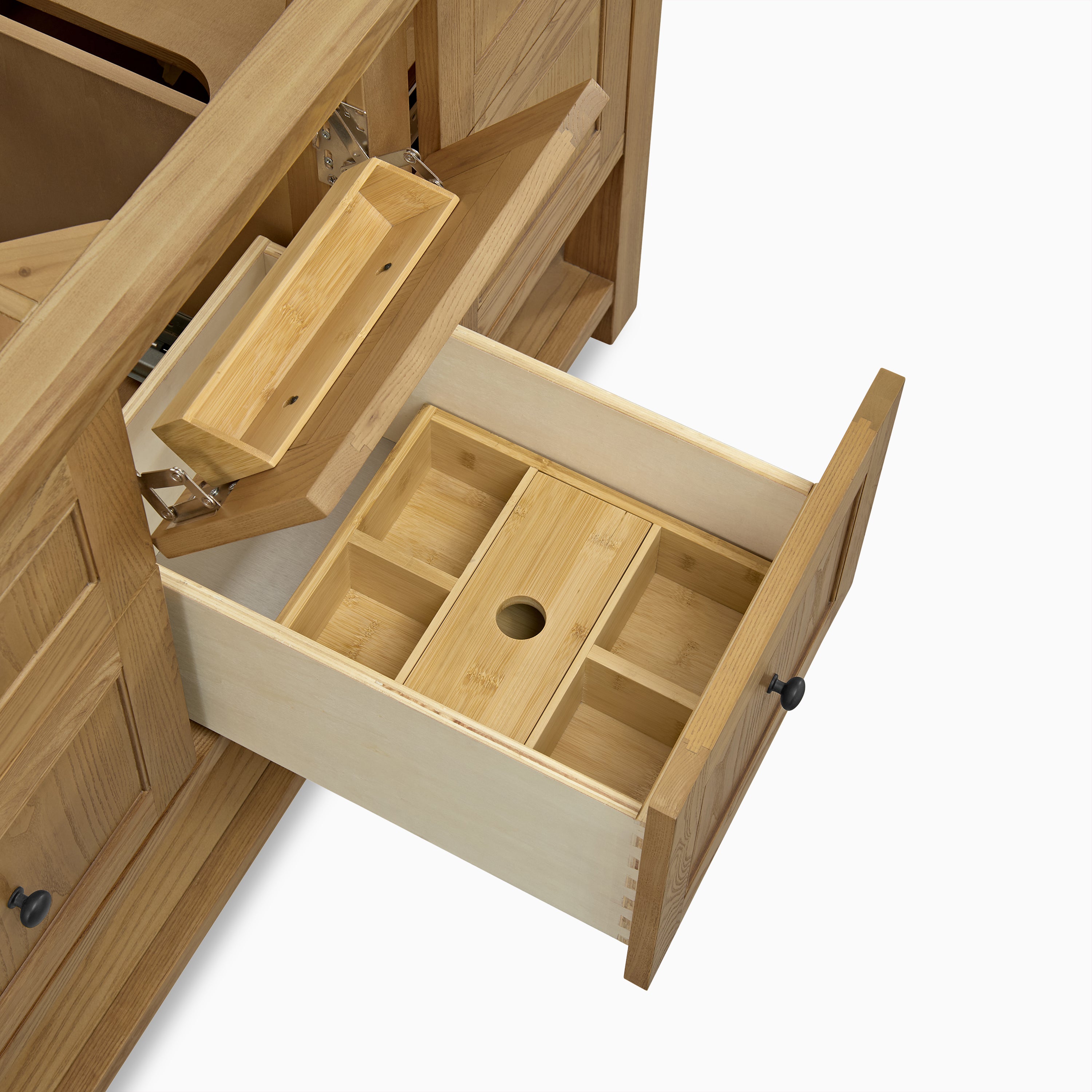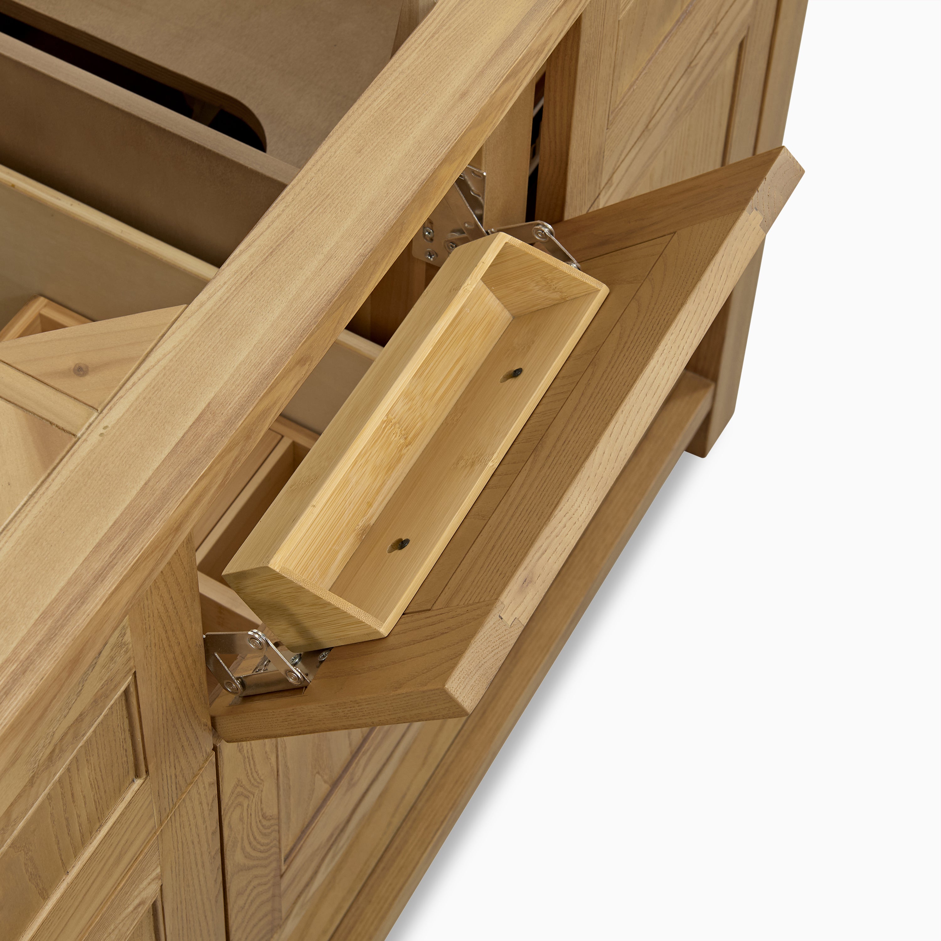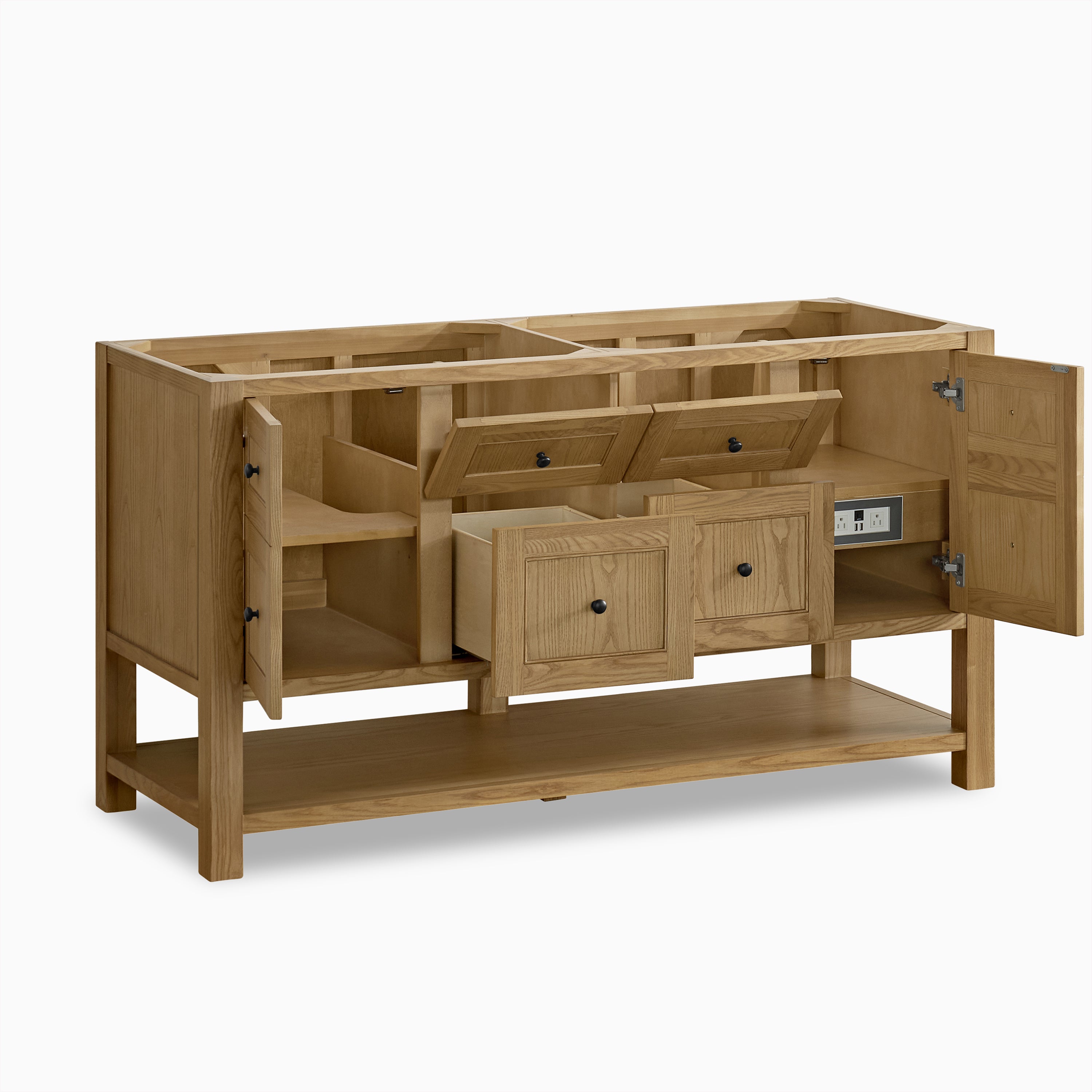 A modern update on the traditional Mission style furniture, our Bridgette 60" Double Vanity in Light Natural Oak with 3 cm White Zeus Quartz Top features framed panels and a rich golden brown hue that fits seamlessly in transitional and modern farmhouse bathrooms. Thoughtfully designed storage includes 2 single-door cabinets with a built-in power and USB outlet, 2 tip-out and full-extension drawers, and an open shelf at the base, offering both concealed and display-ready space for your essentials.