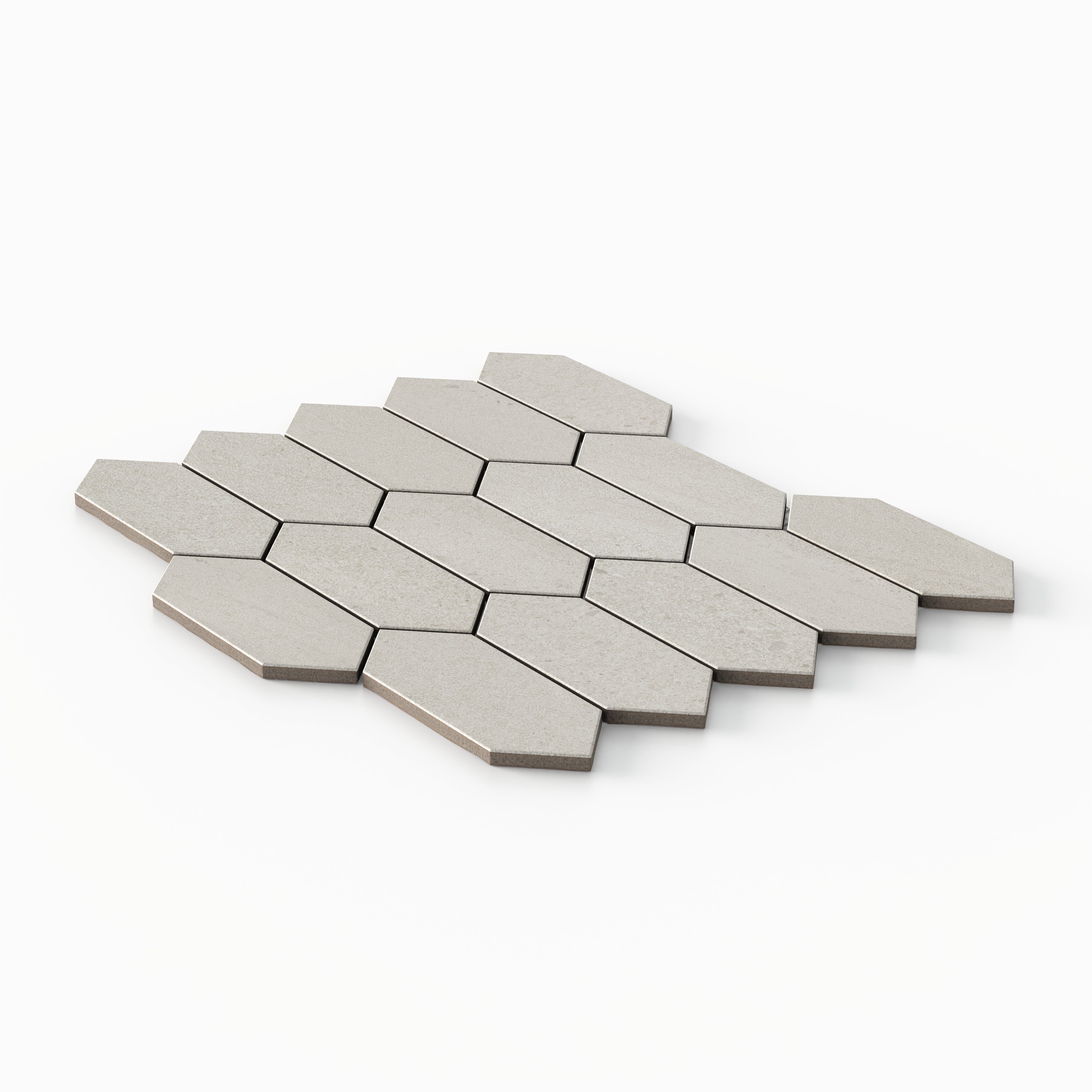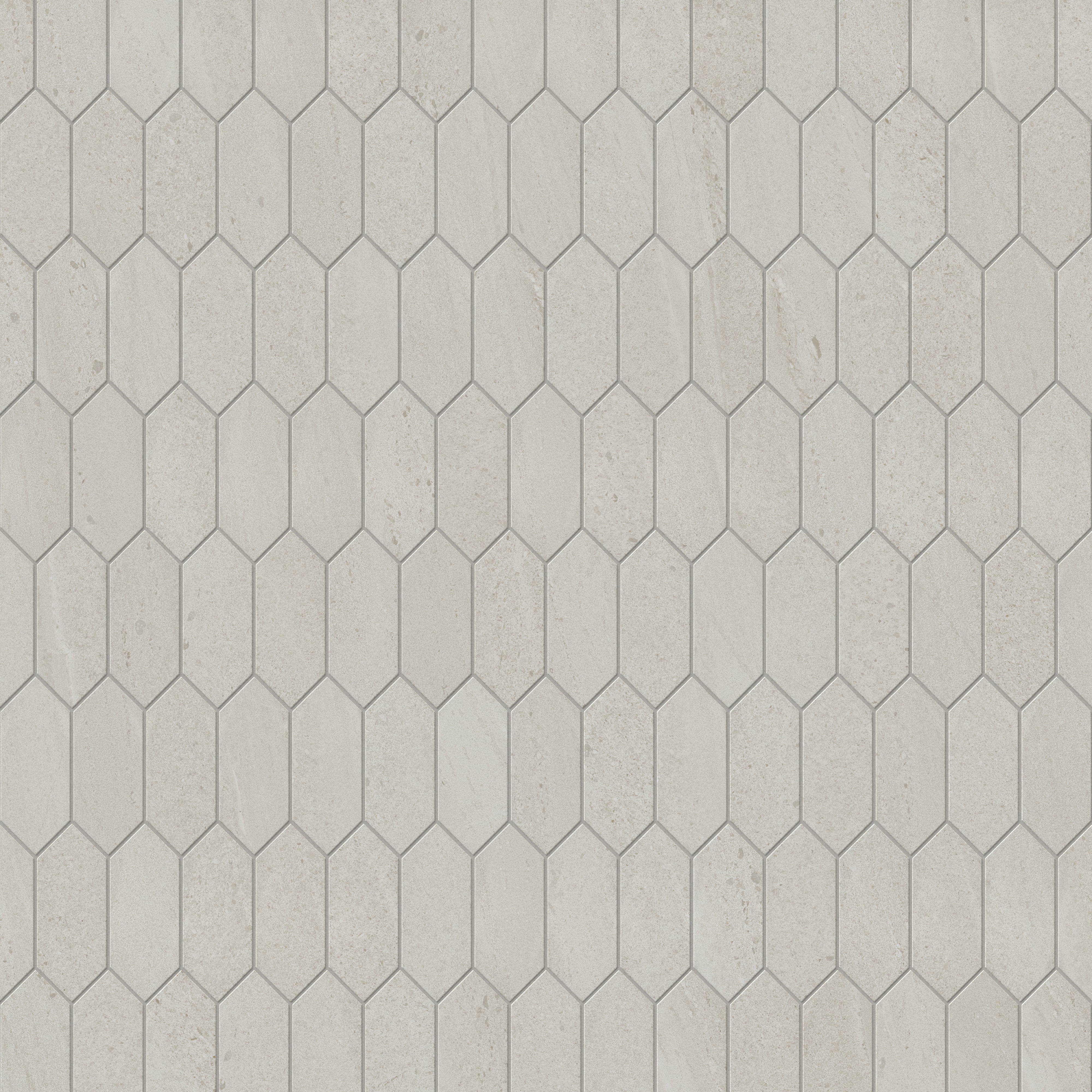 Our Bryce 2x5 Satin Ceramic Picket Mosaic Tile in Sand features an off-white, elongated hexagon surface etched with delicate striations and flowing crosscut veining that mirrors the timeless beauty of rustic stone. This is enriched by a soft velvety sheen, infusing each mesh-mounted piece with an organic yet sophisticated visual texture that transforms modern settings into calm, nature-inspired retreats.