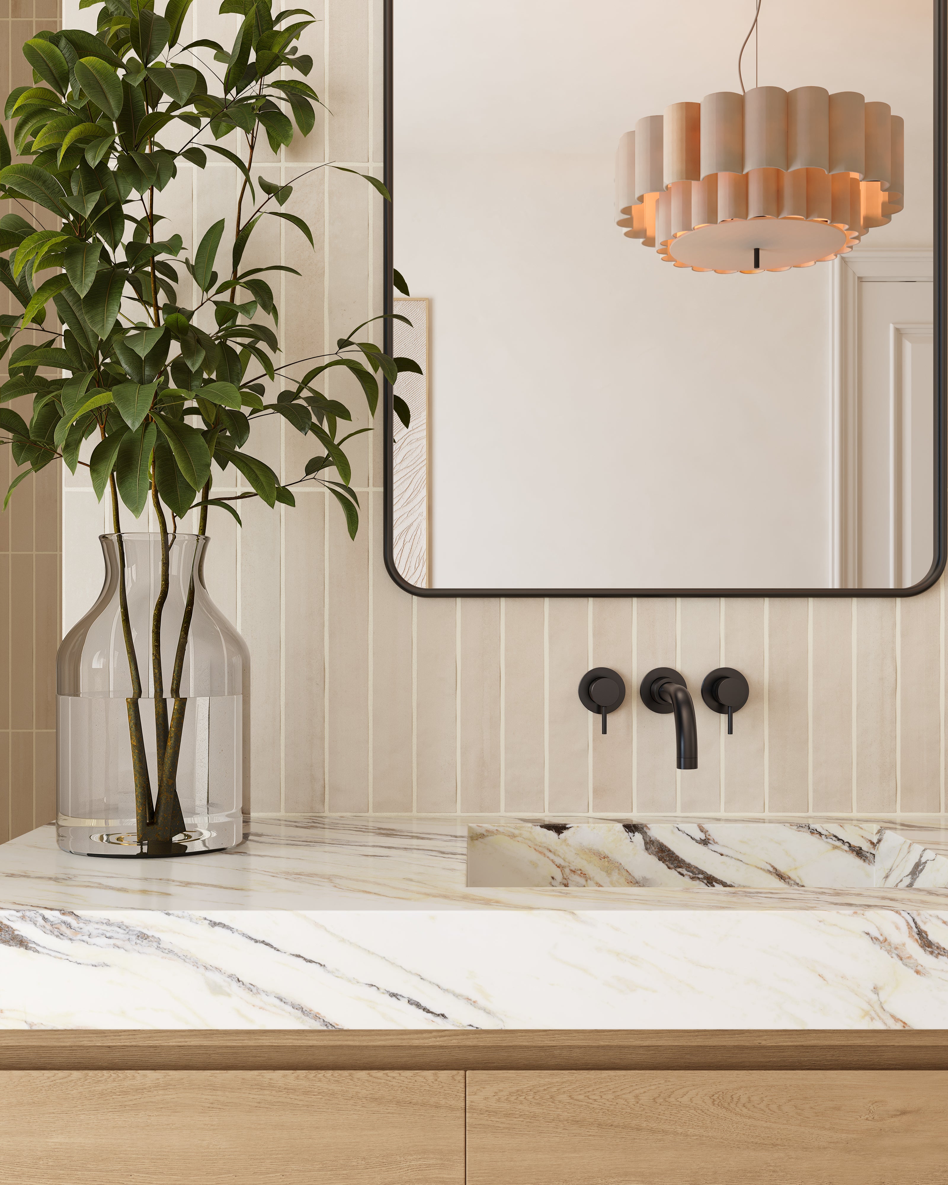 - Modern subway tile in a slender 2x16 size that visually expands space