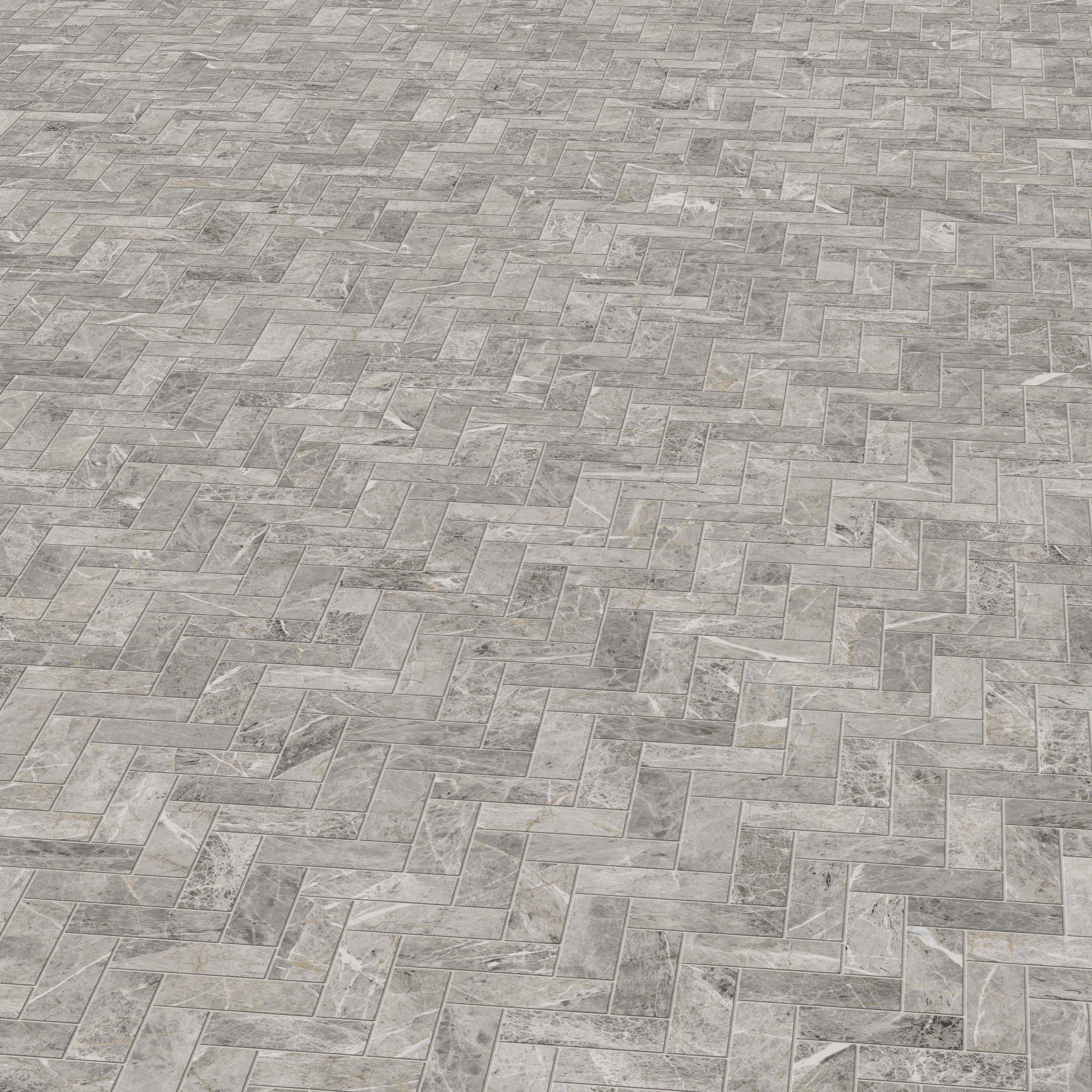 Embracing the natural marble aesthetic, our Chantel 12x15 Matte Porcelain Herringbone Mosaic Tile in Imperial reinterprets this timeless, exquisite material through modern subway-like segments in an interlocking zigzag format. Each mesh-mounted piece carries striking veining across its rich mid-gray surface, softened by a rustic finish that creates an expansive yet sophisticated space.