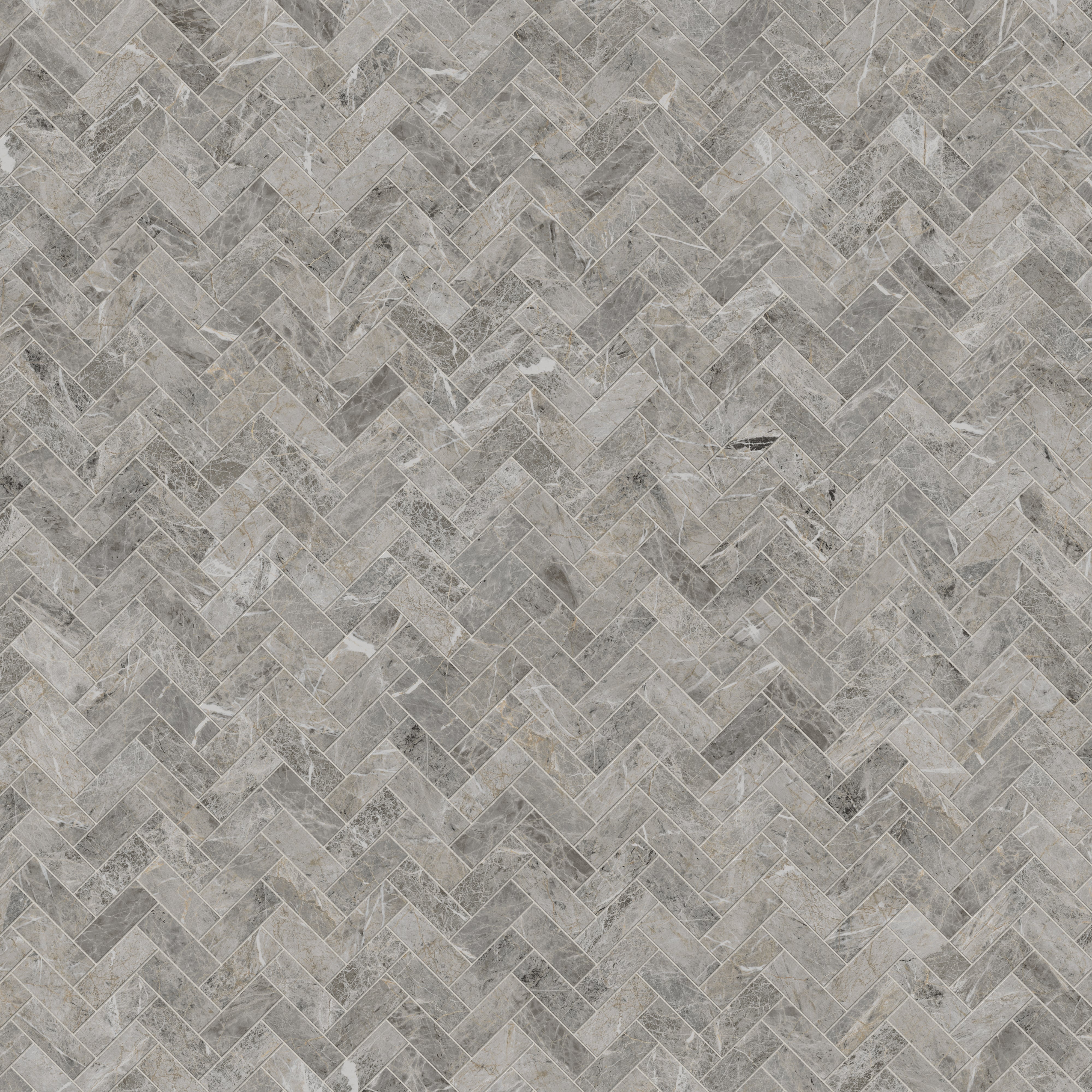 Embracing the natural marble aesthetic, our Chantel 12x15 Polished Porcelain Herringbone Mosaic Tile in Imperial reinterprets this timeless, exquisite material through modern subway-like segments in an interlocking zigzag format. Each mesh-mounted piece carries striking veining across its rich mid-gray surface, accentuated by a sleek finish that creates an expansive yet sophisticated space.