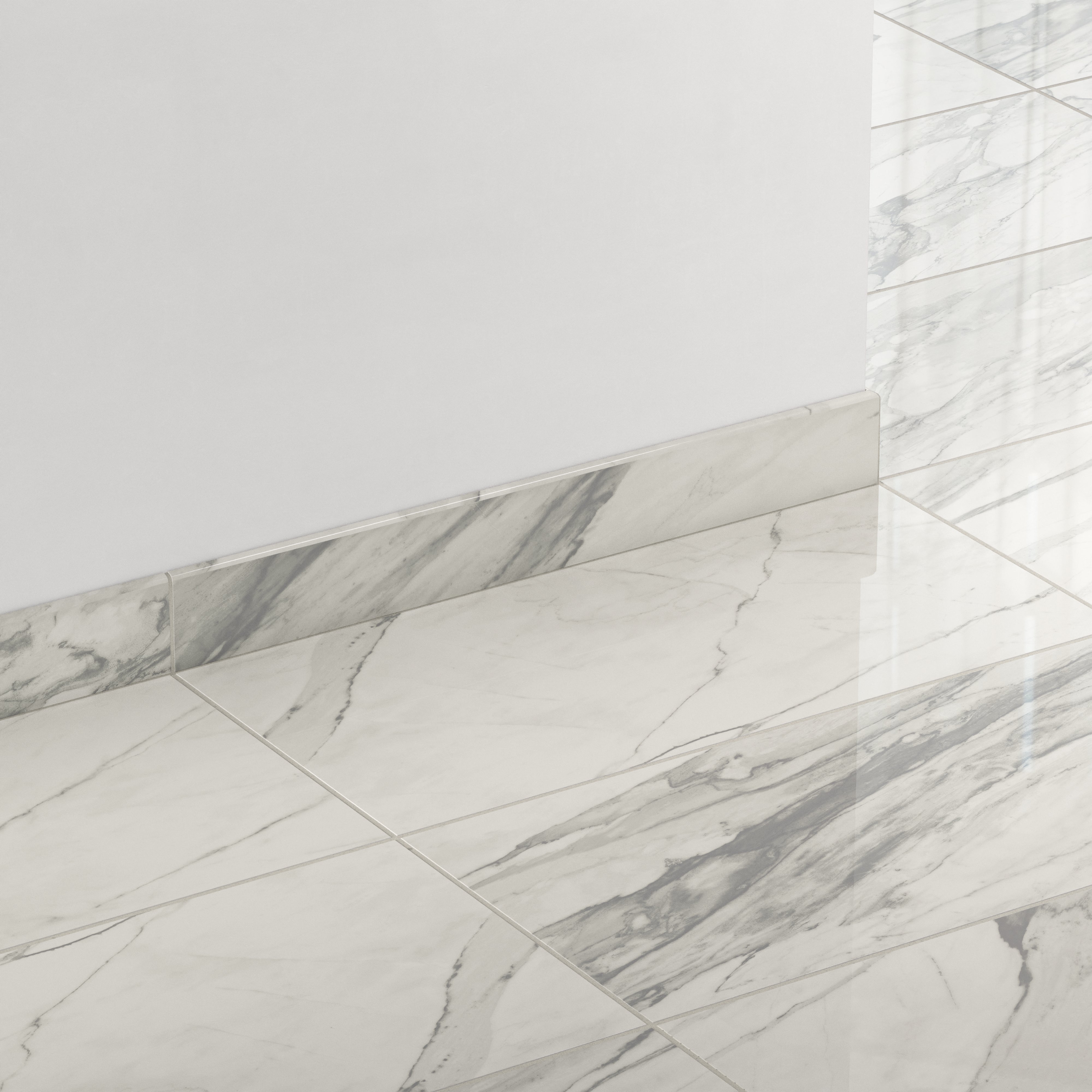 Featuring the same natural marble aesthetic, our Chantel 3x24 Polished Porcelain Bullnose Tile in Apuano provides a seamless finishing detail for edges, corners, and wall terminations with its fluid light gray veining across its off-white surface, accentuated by a sleek finish for a smooth, elegant transition.