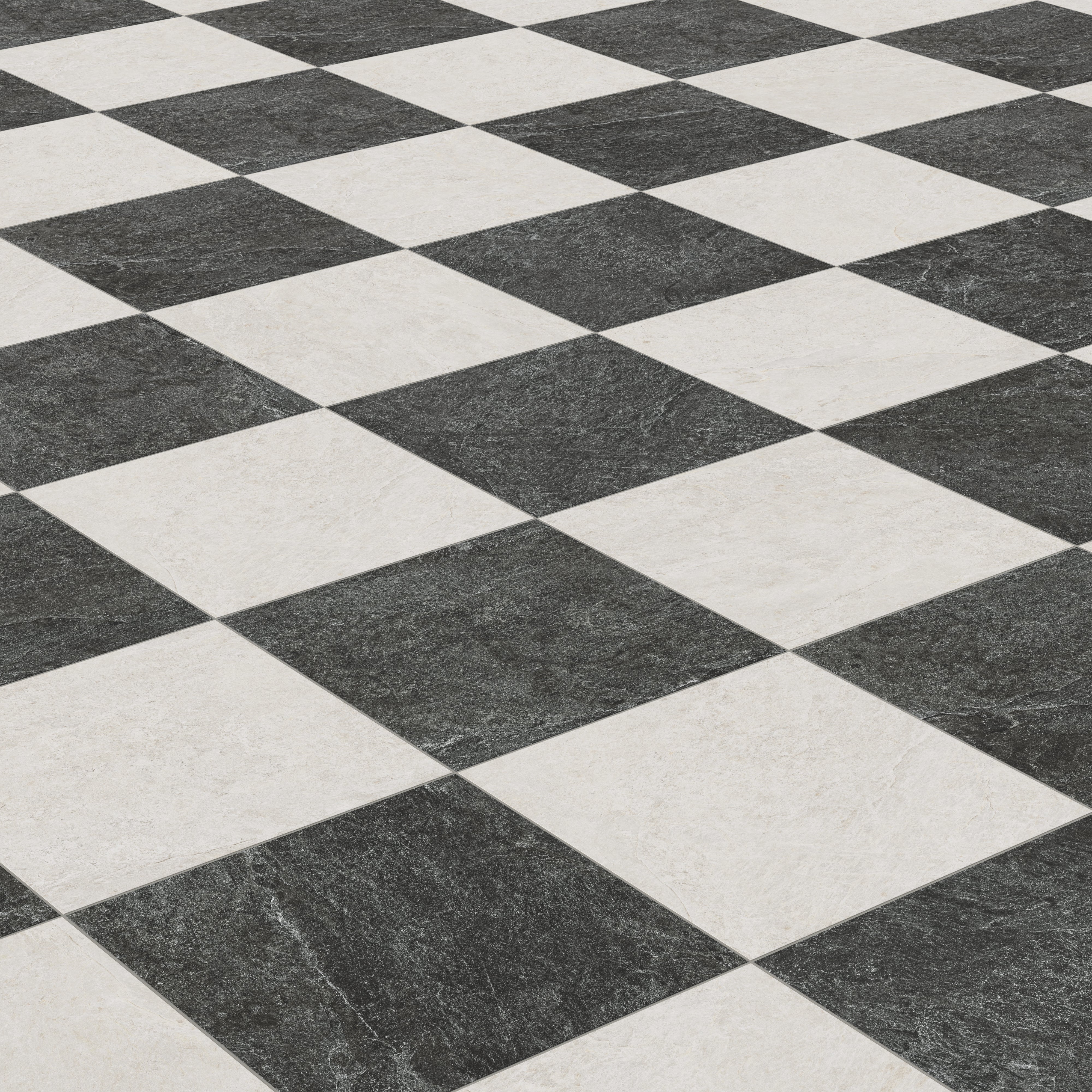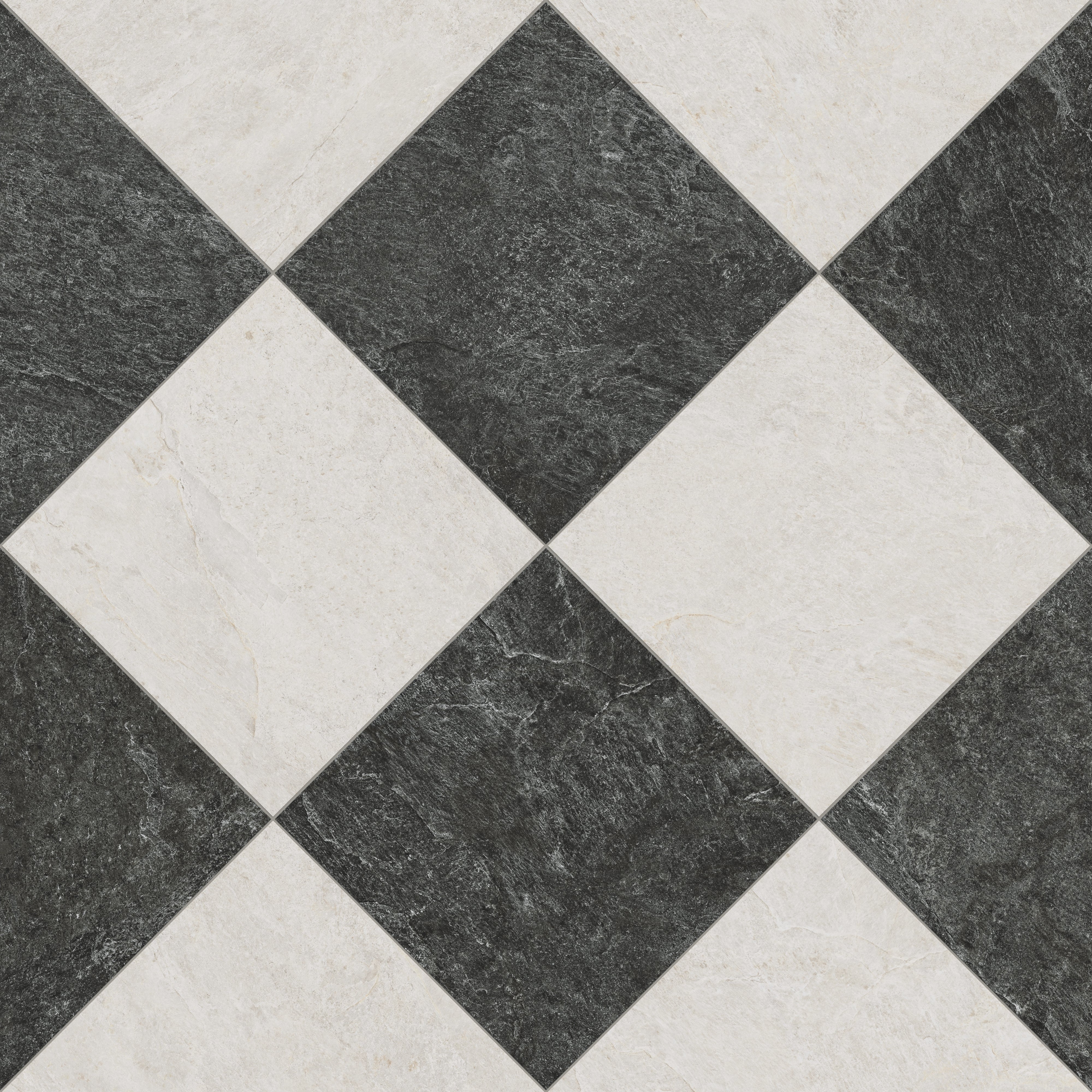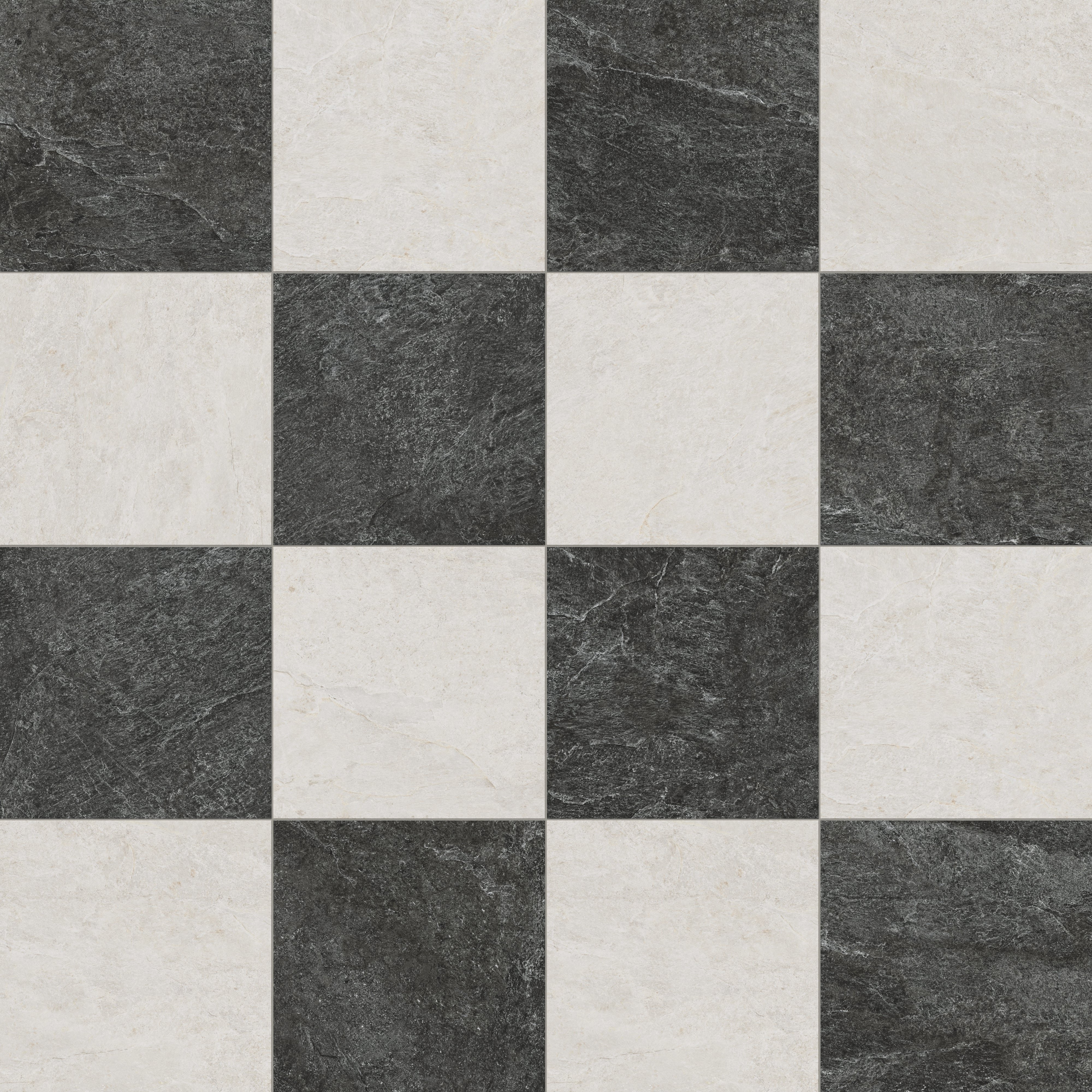 - Stone-inspired porcelain pairs for a low-maintenance checkered look