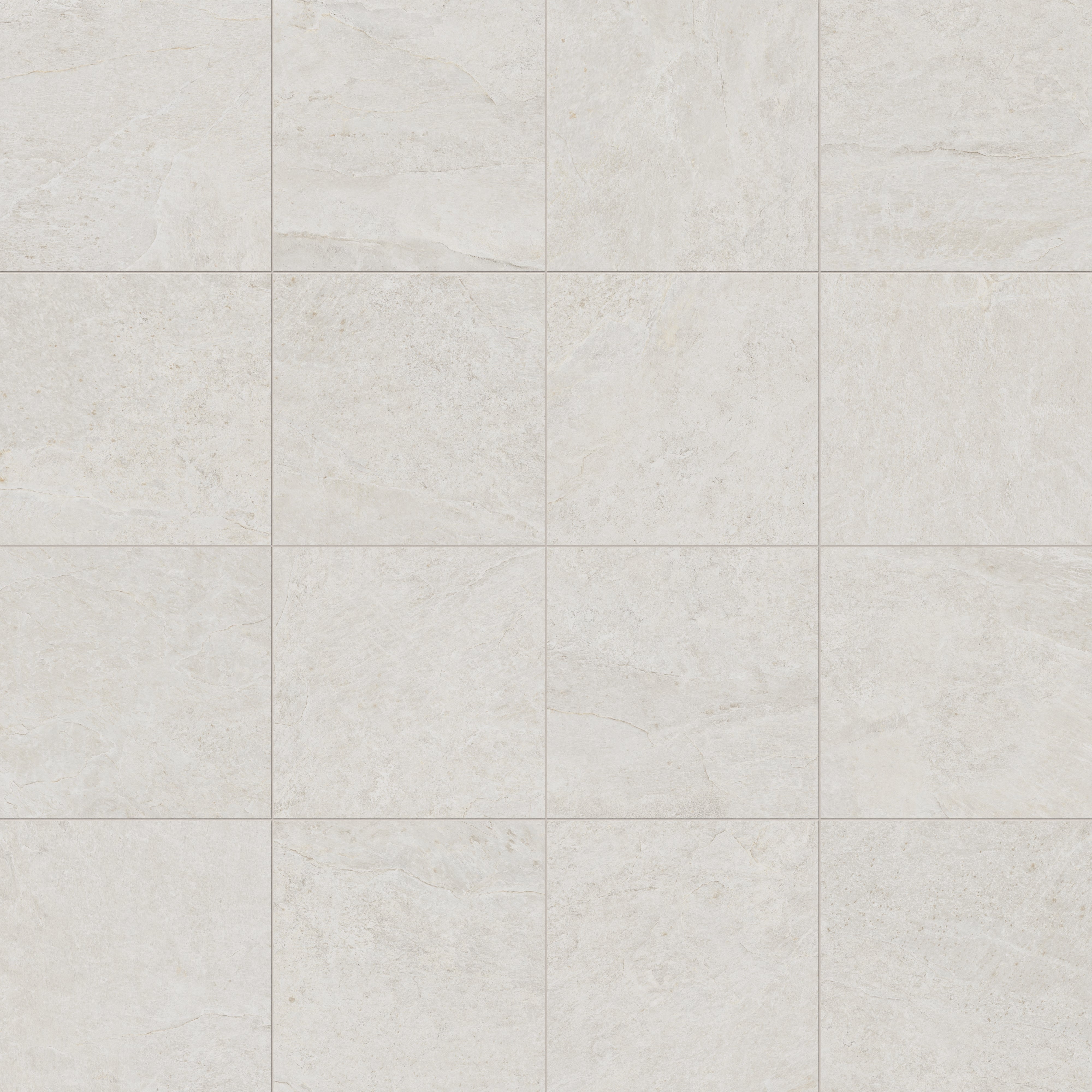 Our Dawson 24x24 Grip Porcelain 2cm Paver Tile in Alabaster captures the delicate veining variations and rich textural complexity that reflect how true quartzite is naturally formed over time. Its large square format works in harmony with a weathered white tone and earthy matte-like glaze to accentuate these organic details, bringing a modern sensibility to biophilic design.