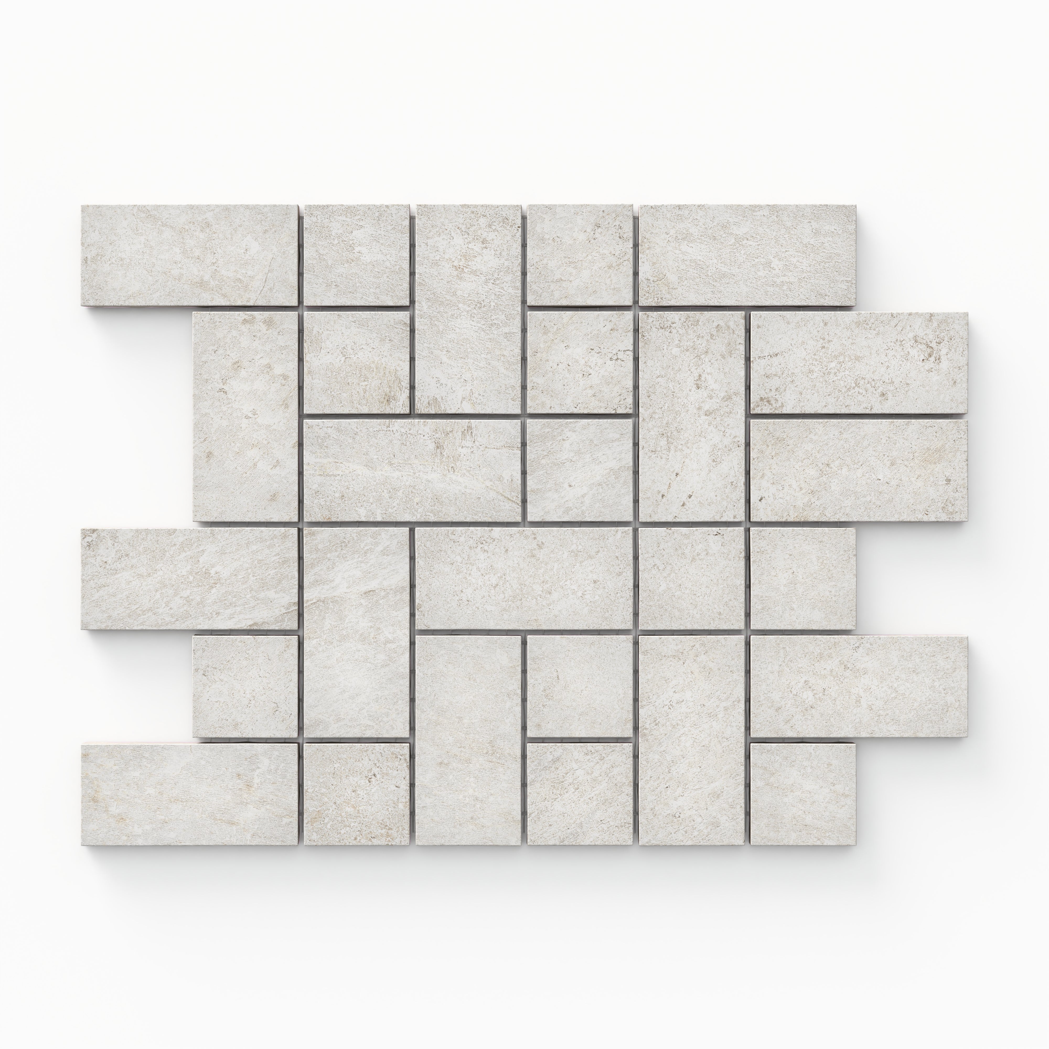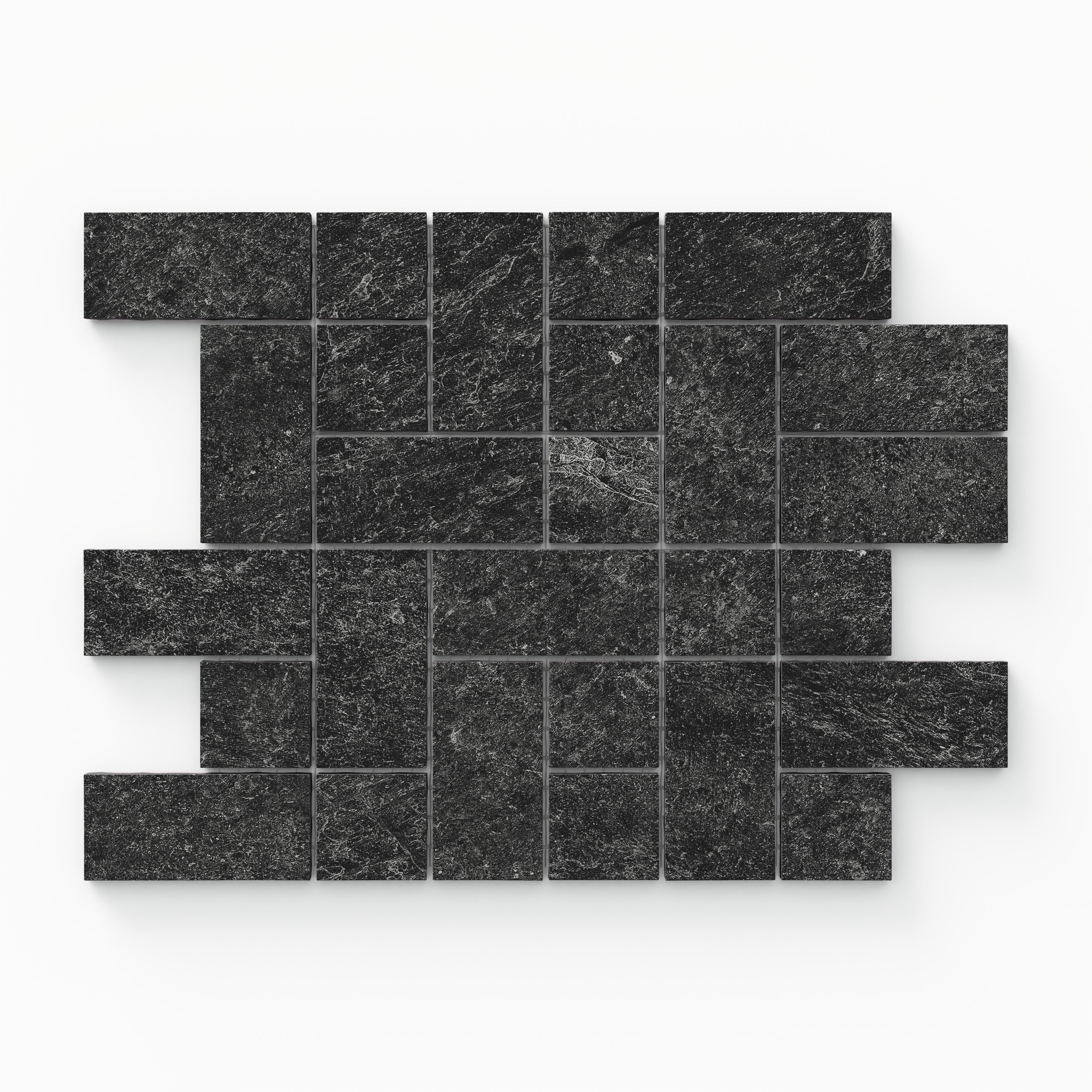Our Dawson 8.7x12 Matte Porcelain Tetris Mosaic Tile in Charcoal captures the delicate veining variations and rich textural complexity that reflect how true quartzite is naturally formed over time. Its mesh-mounted, Versailles-like format works in harmony with a weathered black tone and smooth, earthy glaze to accentuate these organic details, bringing a modern sensibility to biophilic design.