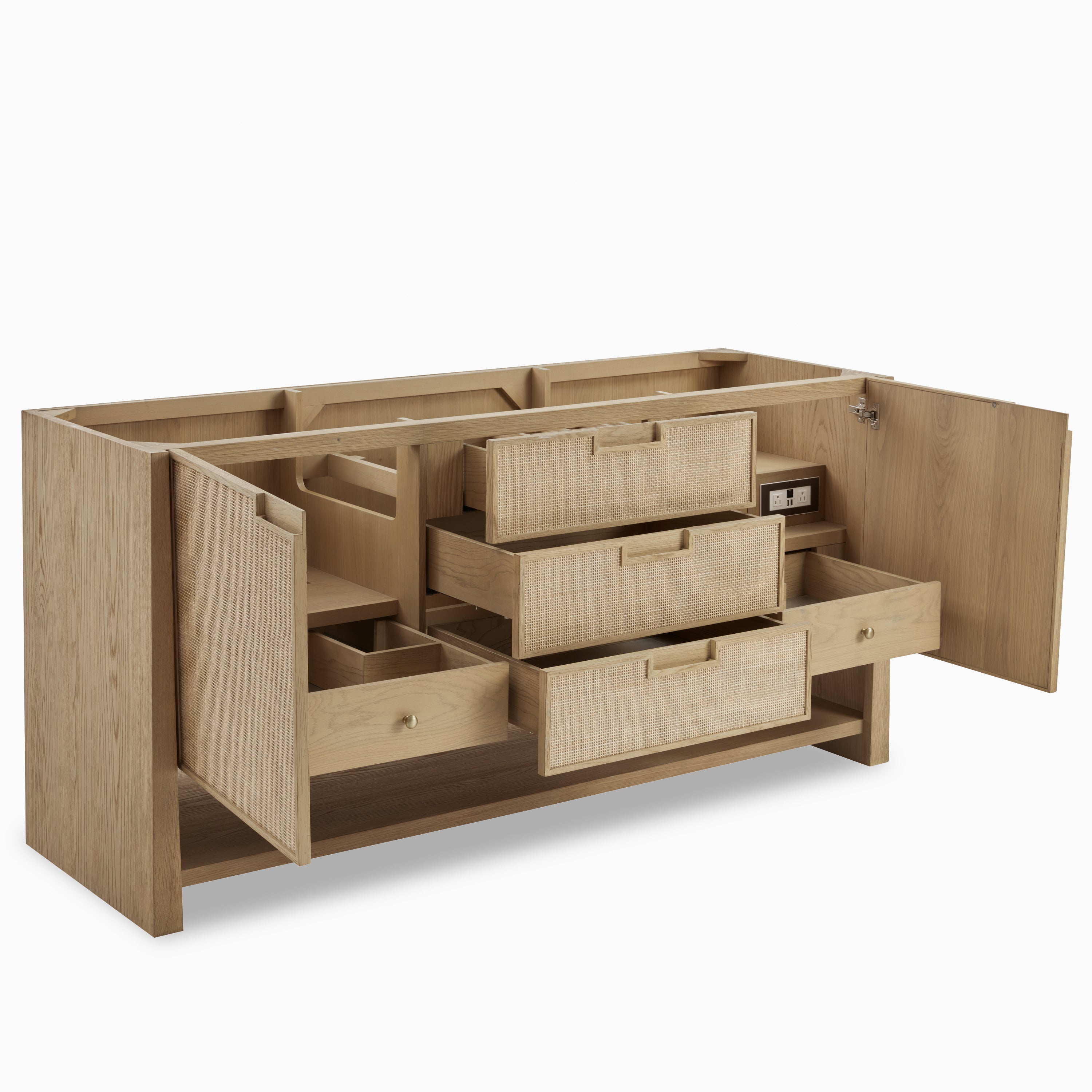 Our Delilah 72" Double Vanity in Seaside Oak with 3 cm White Zeus Quartz Top keeps things simple, but thoughtfully designed. Its white oak frame, finished in a warm, coastal-inspired tone, pairs naturally with gently tapered legs and handwoven cane panels for a relaxed, textured look. Inside, there's space for more than just the everyday: clever compartments, a pair each of internal drawers and discreet built-in USB and power outlets, 3 full-extension drawers at the center and an open lower shelf below with room to store or style, depending on what the day calls for.