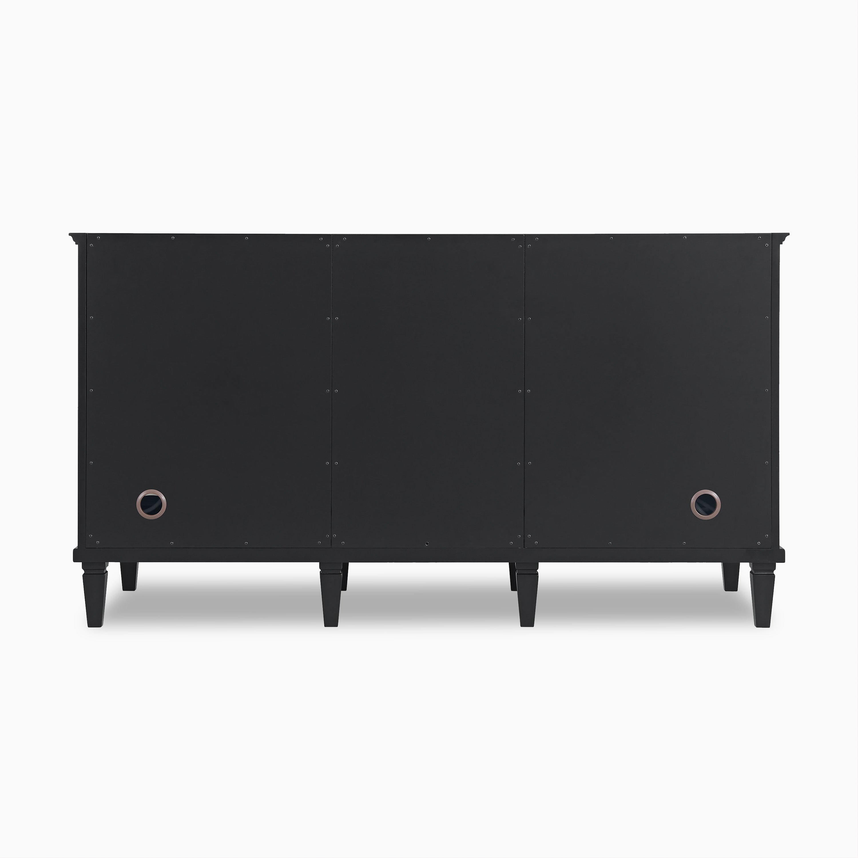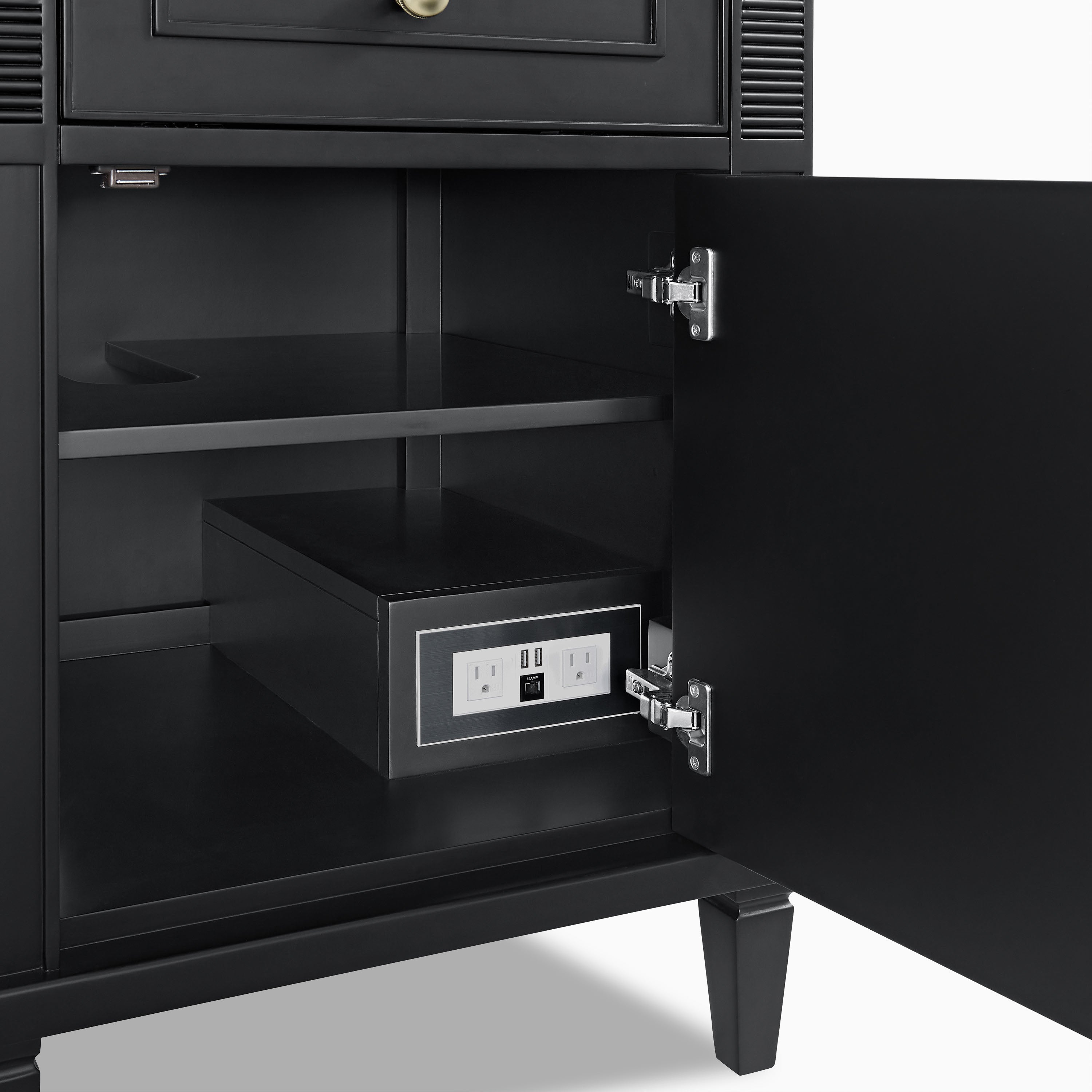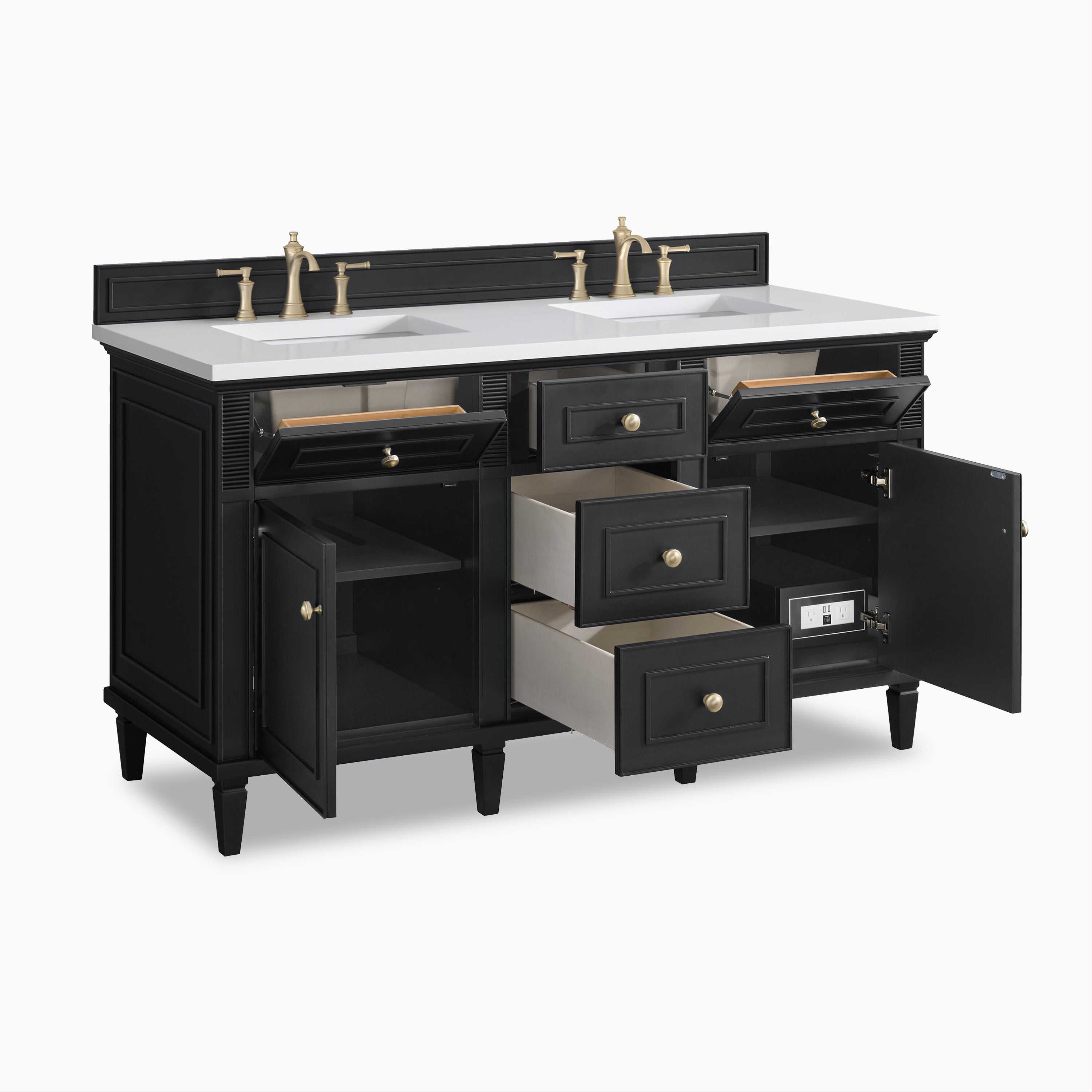 Our Elodie 60" Double Vanity in Black Onyx with 3 cm White Zeus Quartz Top is where timeless design meets subtle, contemporary detailing. Its reeded column accents and raised picture frame molding are delicately carved into a graceful silhouette, all wrapped in a regal black finish. Three drawers at the center, concealed interior shelves with built-in power and USB outlets behind two side doors, and two upper tip-out drawers provide structured storage to this thoughtfully designed fixture.