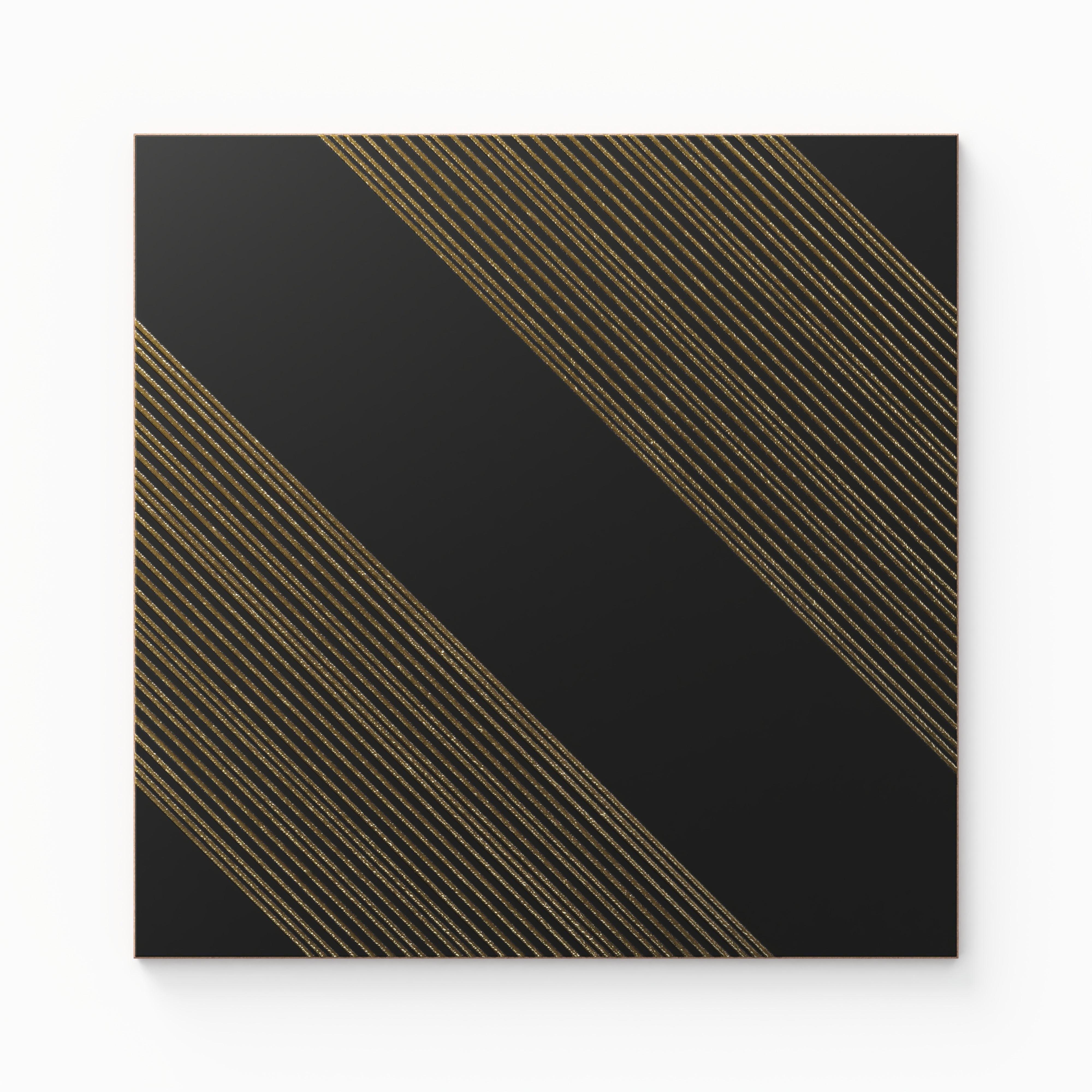 A sample of our Estelle 12x12 Satin Ceramic Tile in Deco 1 Black Gold, it features a black surface with gold lines that transform into interlocking diamond patterns when laid side by side, and a velvety satin finish that highlights its metallic accents.