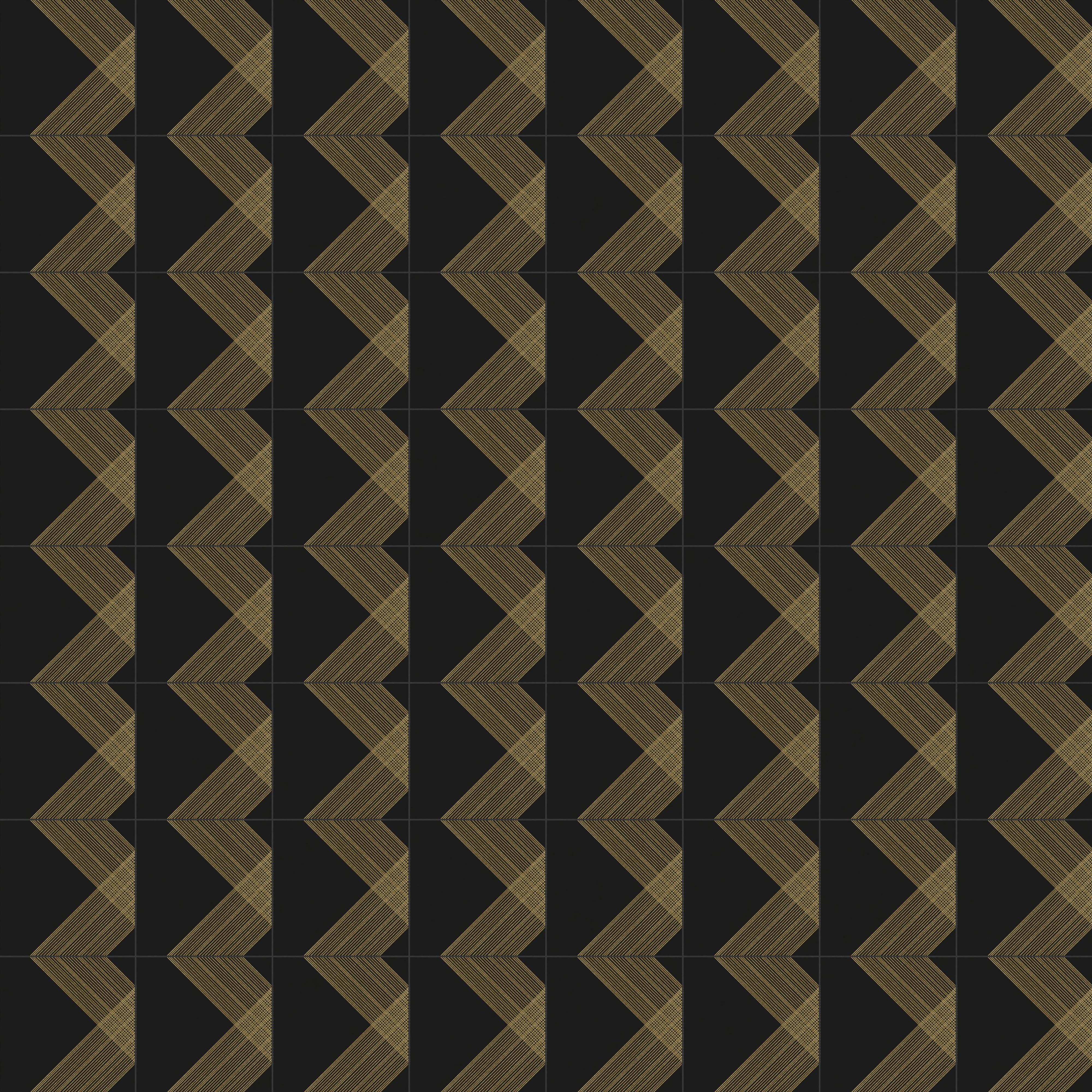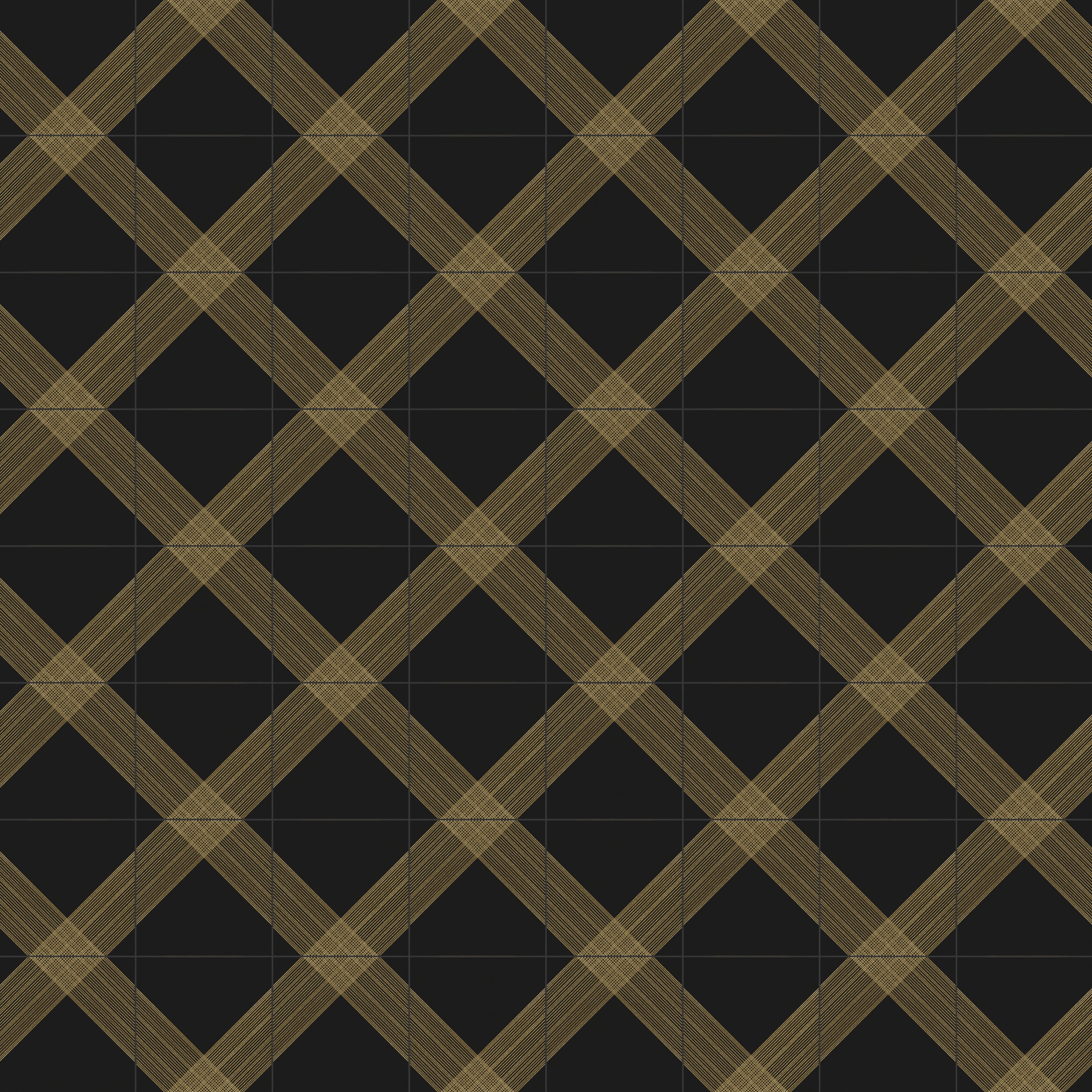 Our Estelle 12x12 Satin Ceramic Tile in Deco 2 Black Gold dazzles with a patterned design across its black surface, featuring twin diagonal bands of gold lines that extend from opposing sides and intersect at the center. These transform into an expansive plaid-inspired motif when laid side by side, elevated by a velvety finish that contrasts beautifully against the subtle shimmer of its metallic accents.