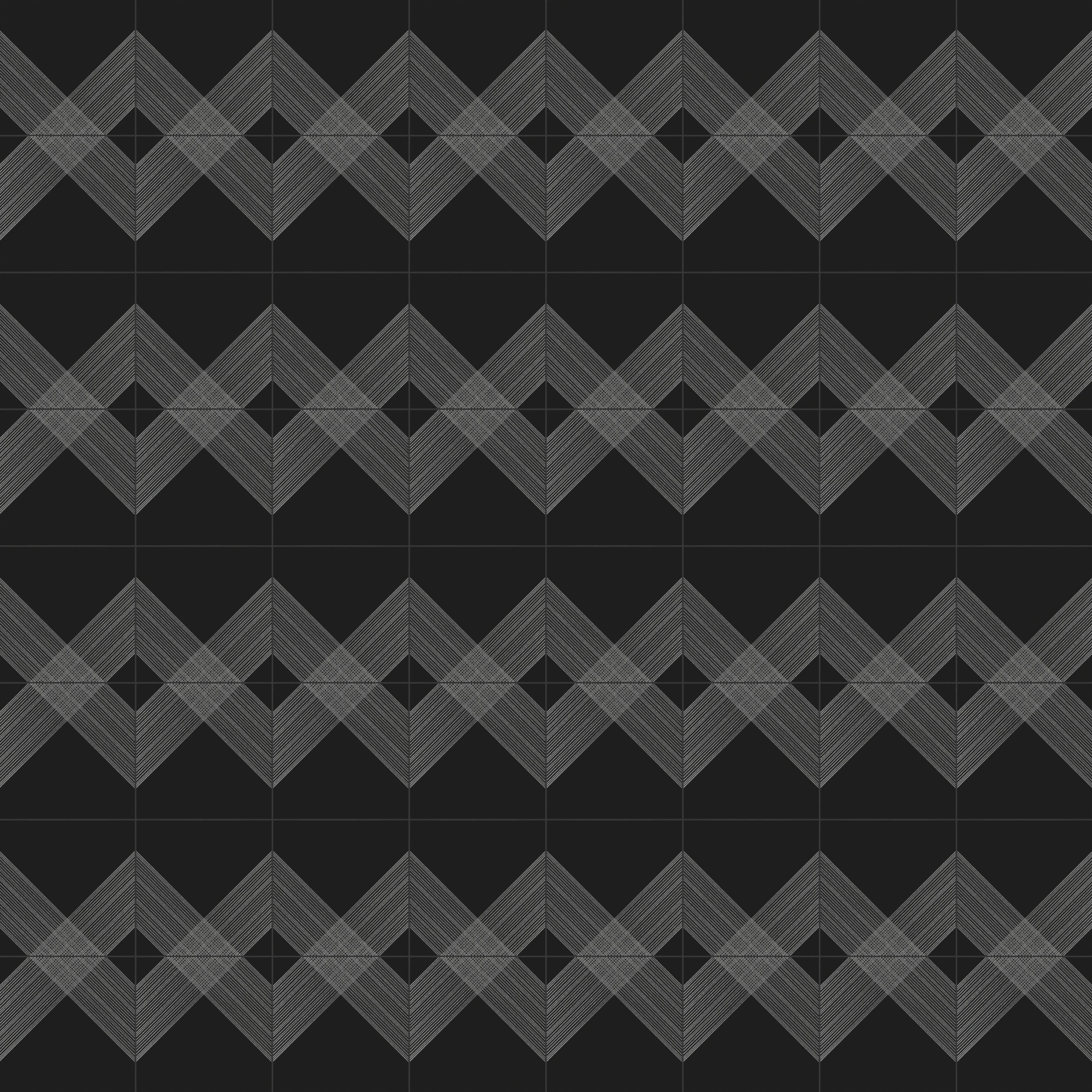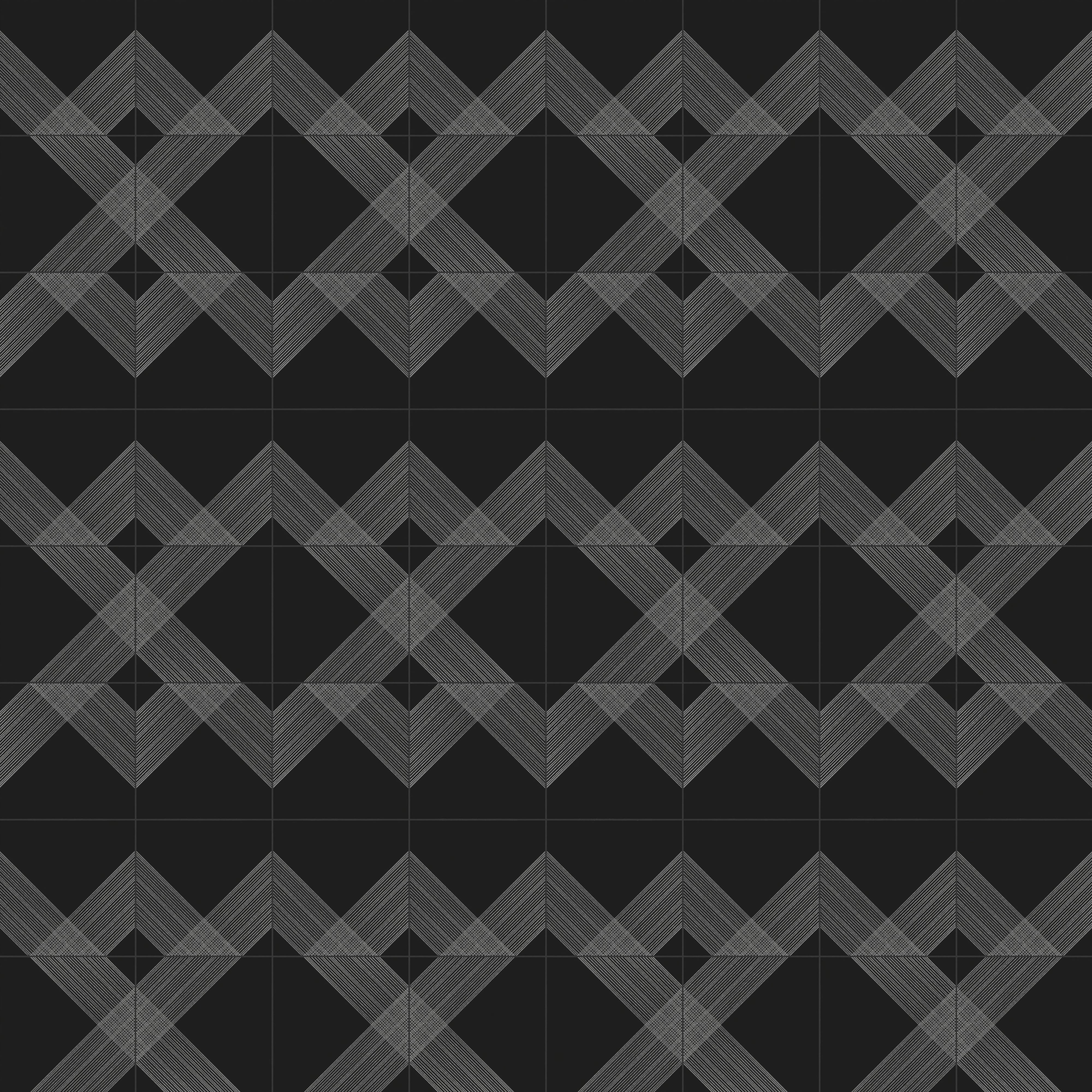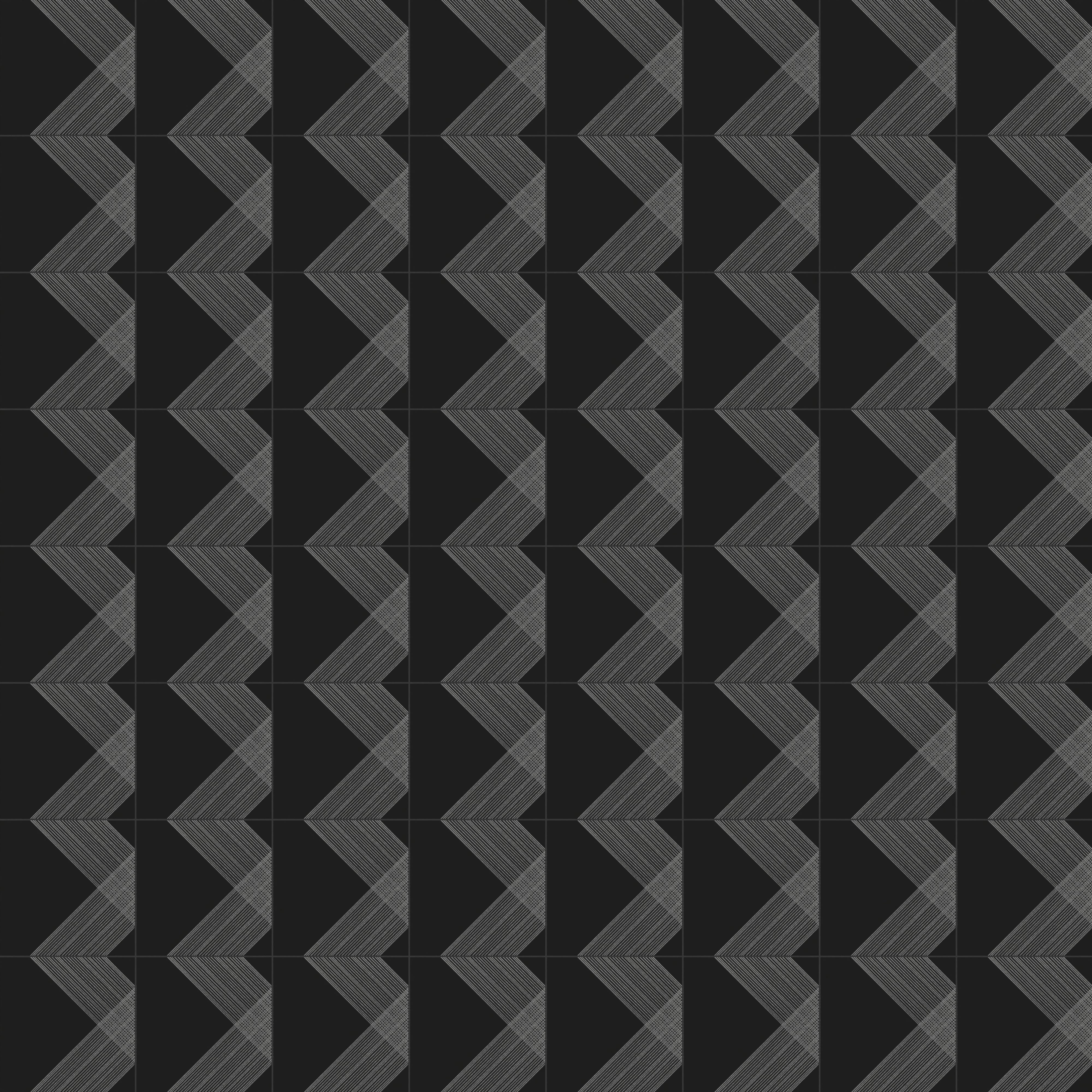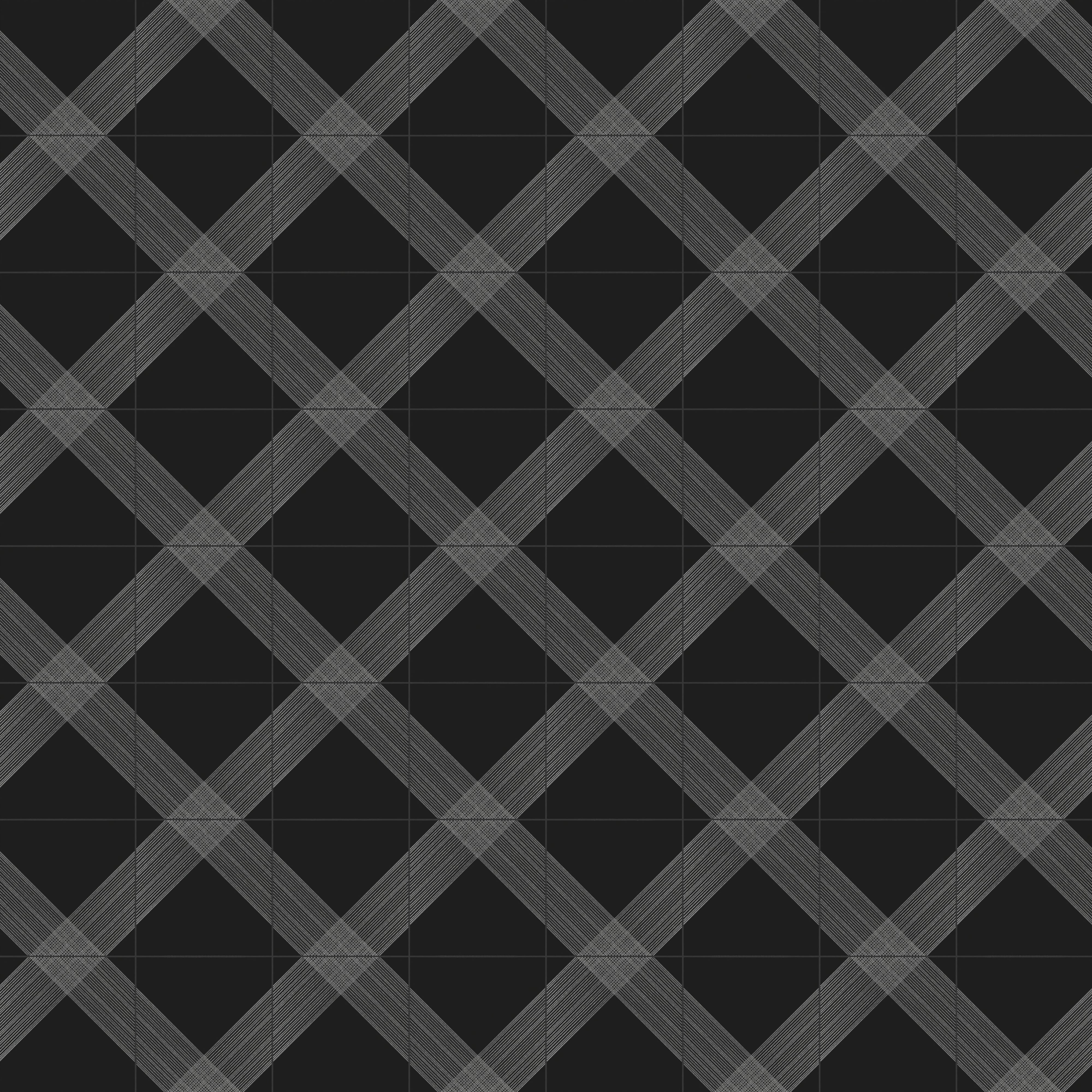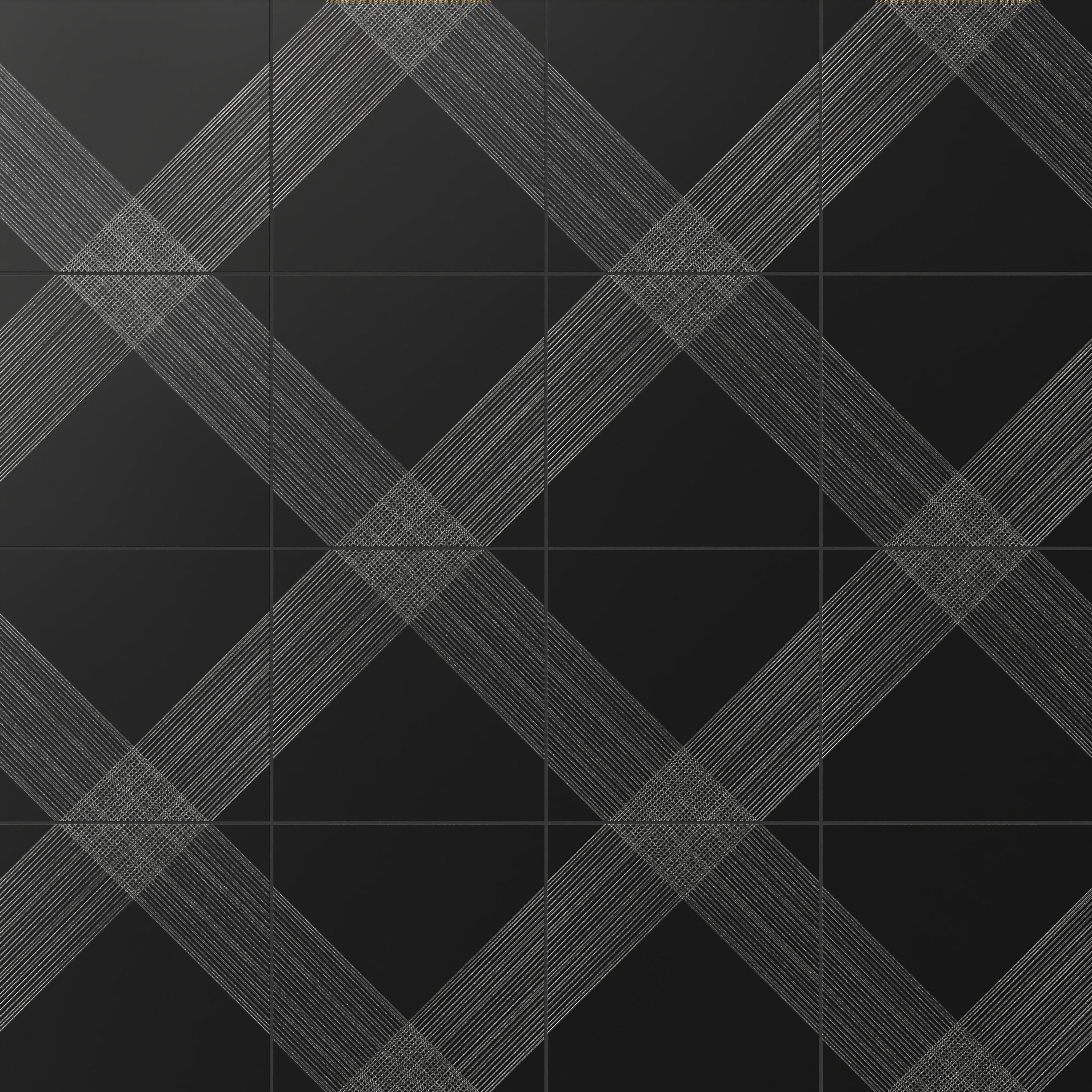 Our Estelle 12x12 Satin Ceramic Tile in Deco 2 Black Silver dazzles with a patterned design across its black surface, featuring twin diagonal bands of silver lines that extend from opposing sides and intersect at the center. These transform into an expansive plaid-inspired motif when laid side by side, elevated by a velvety finish that contrasts beautifully against the subtle shimmer of its metallic accents.