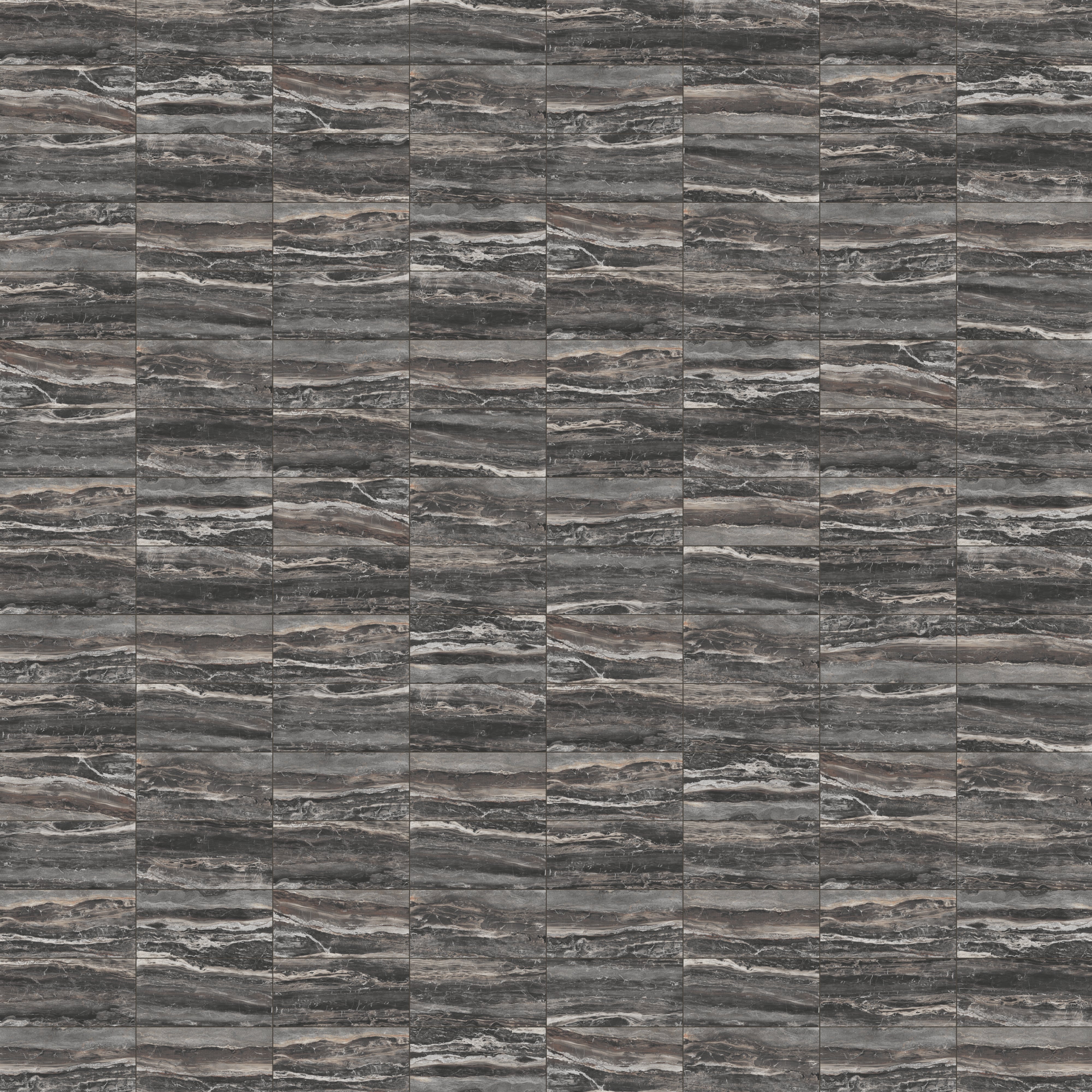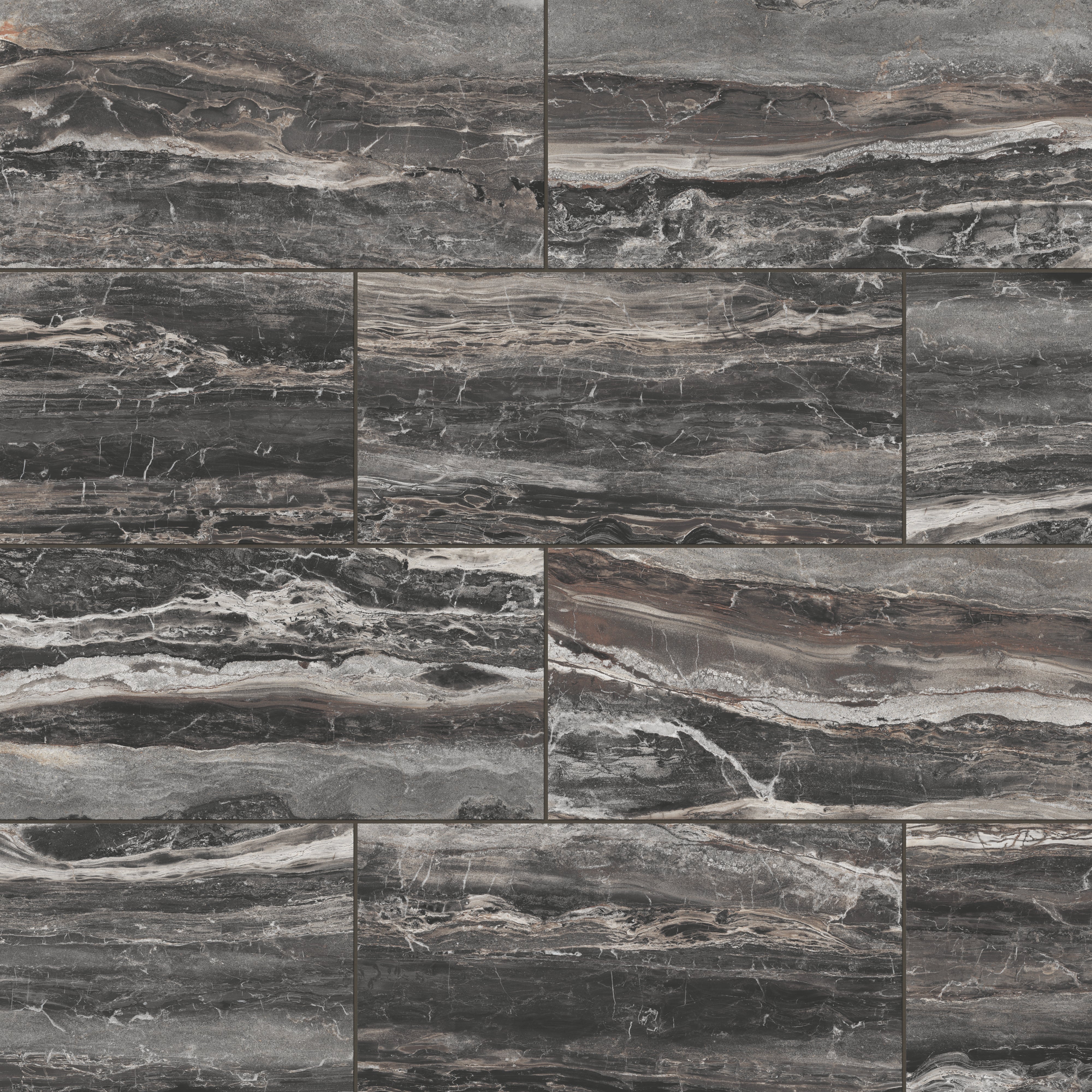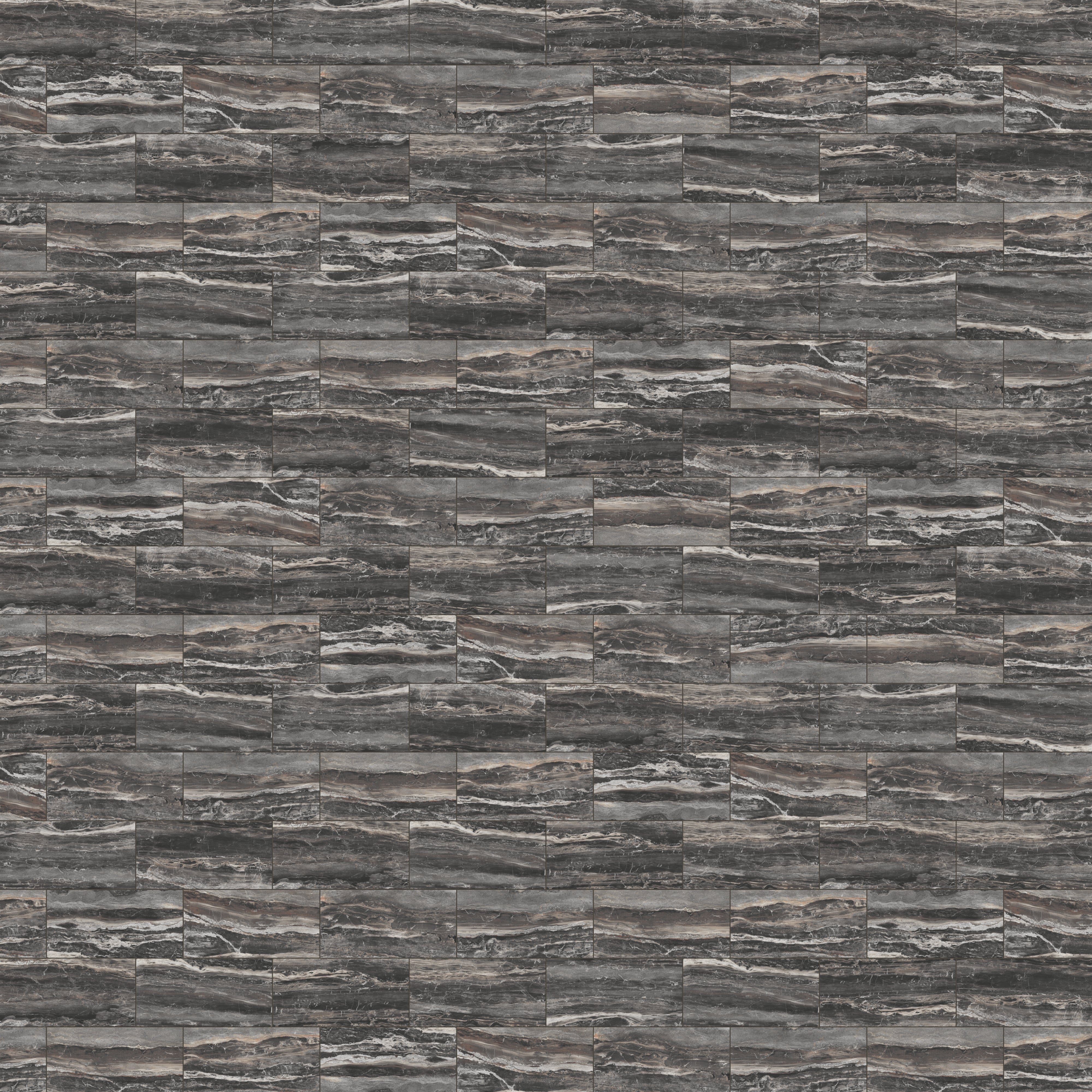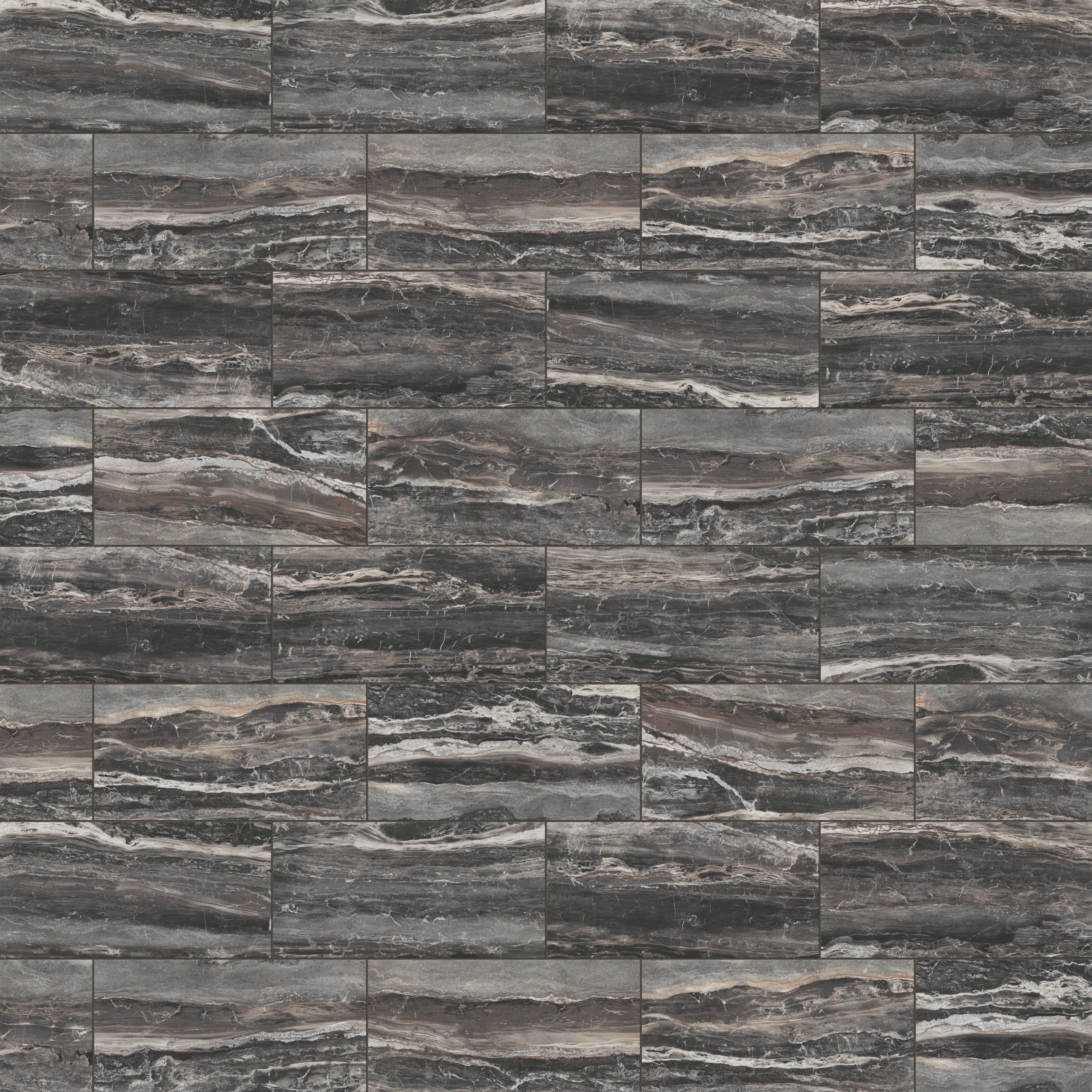 Our Harley 12x24 Polished Porcelain Tile in Graphite translates the beauty of natural fragmentation into a classic rectangular format, where layered, dark gray hues with brown undertones and fluid, interlocking veining dynamically meld — a visual metaphor for the earth’s process of breaking and reassembling form. Its reflective finish accentuates this organic complexity, creating a luminous, refined surface that allows spaces to relive marble’s timeless elegance.